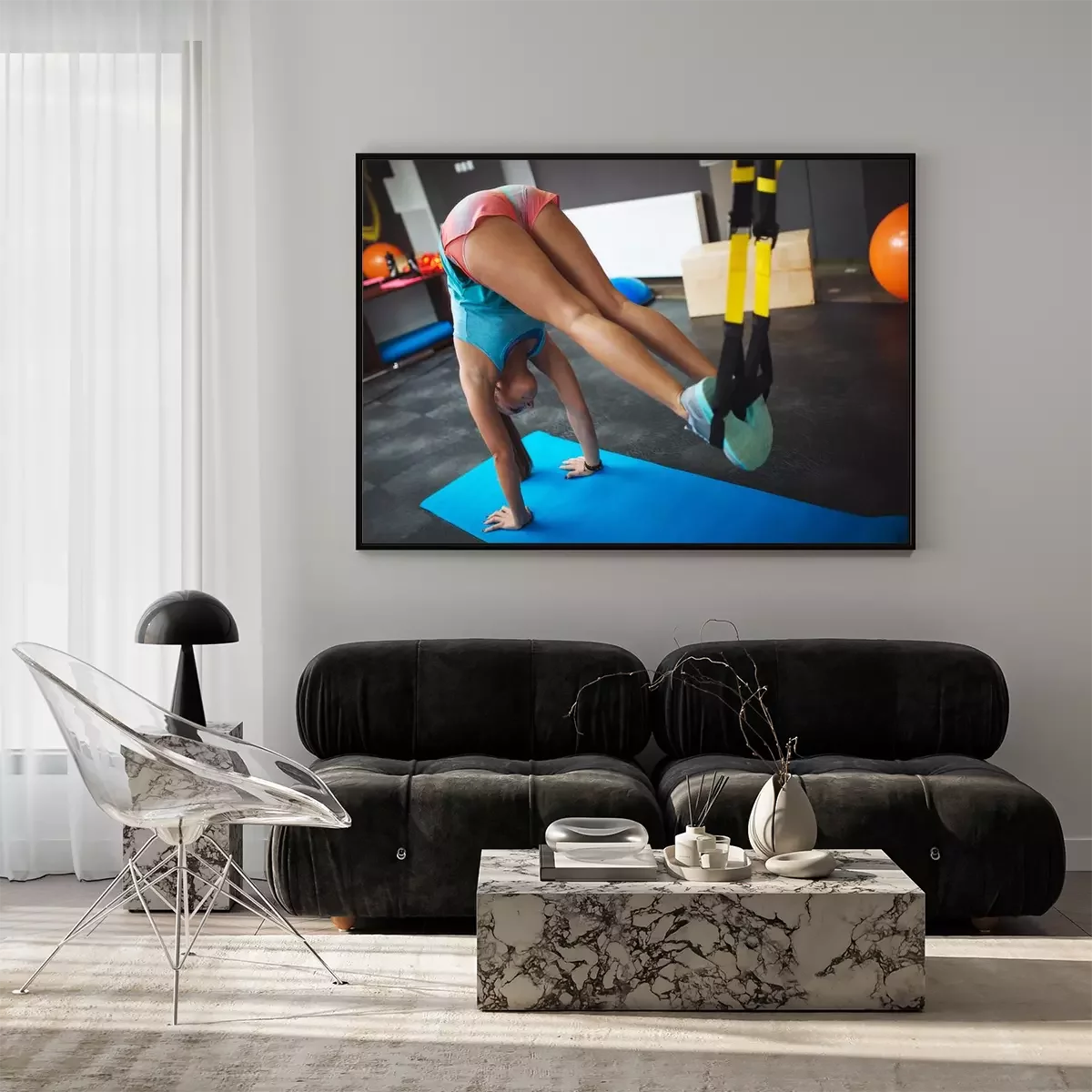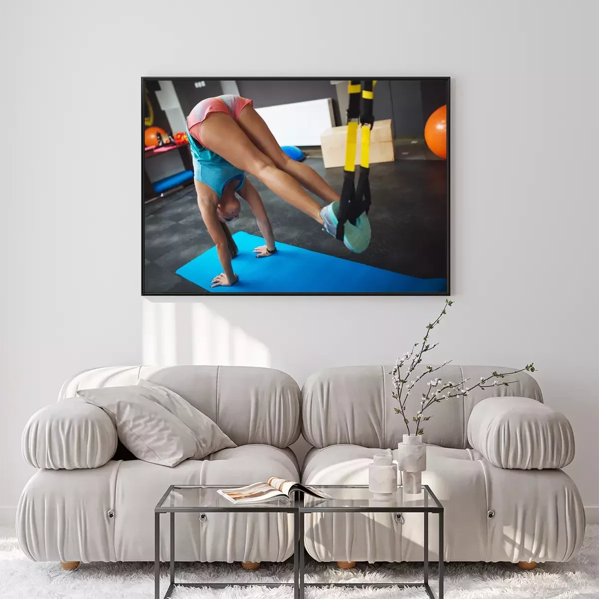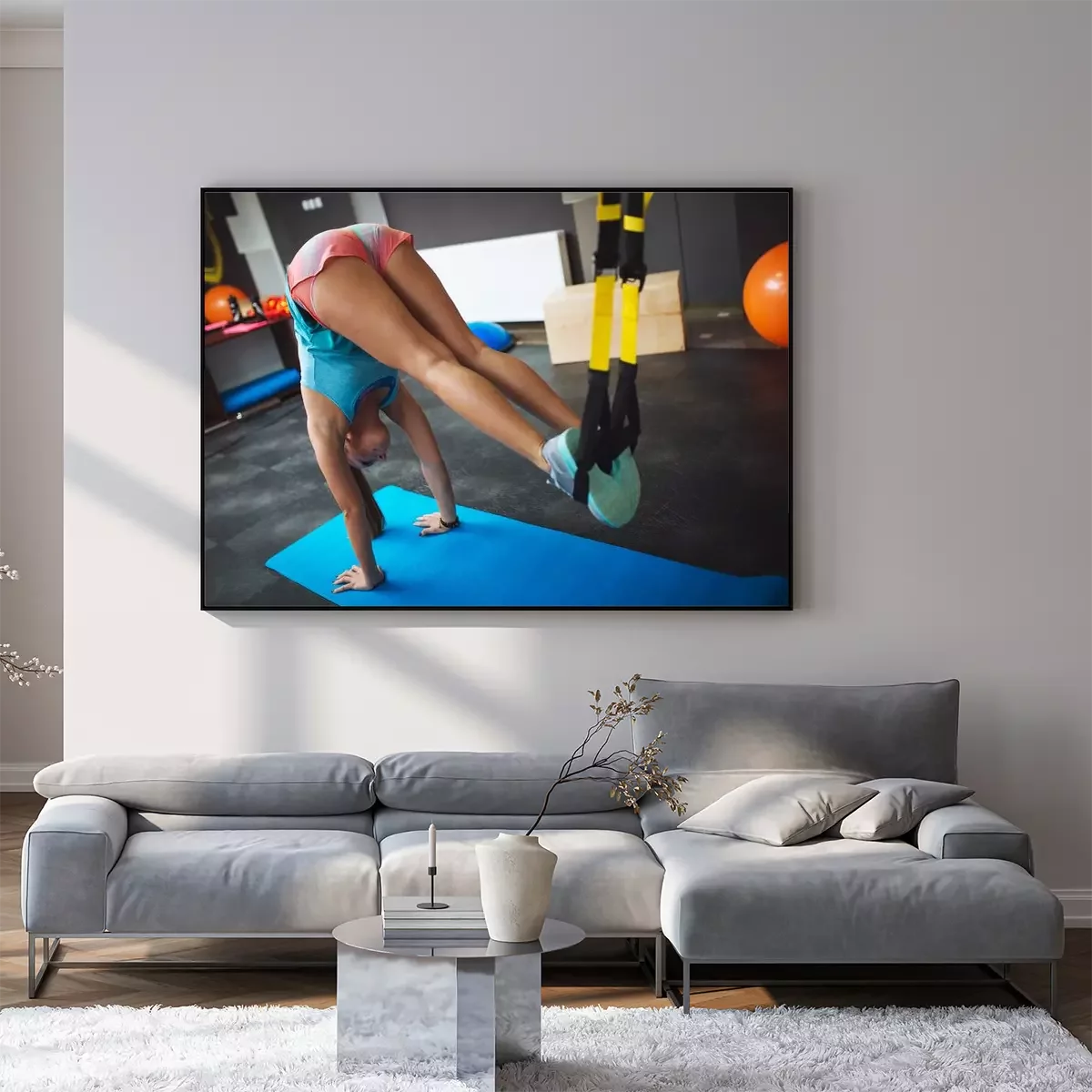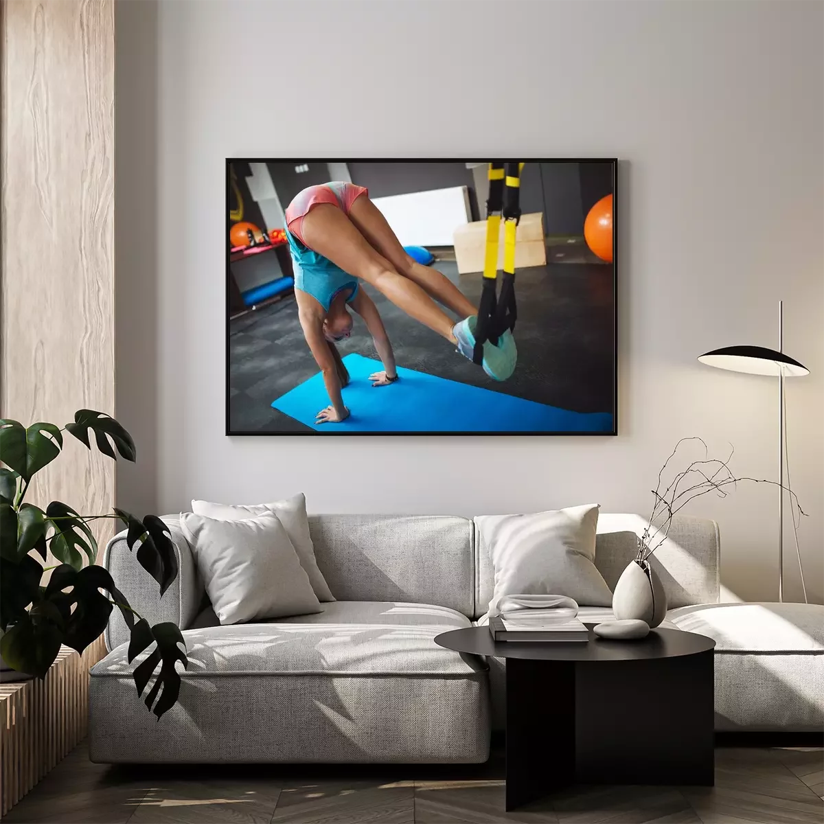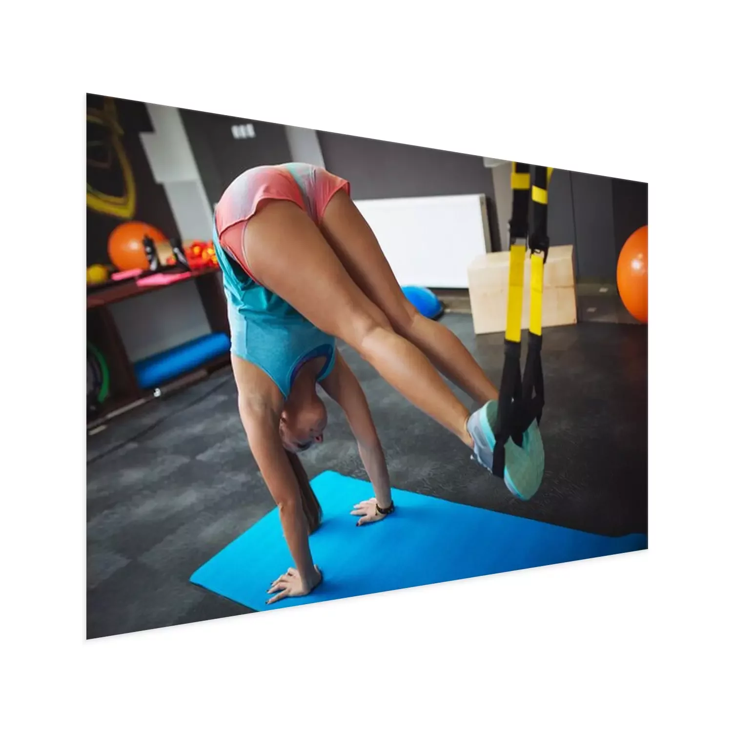 Poster: Jonge vrouw op de sportschool werkt aan haar buikspieren op trx