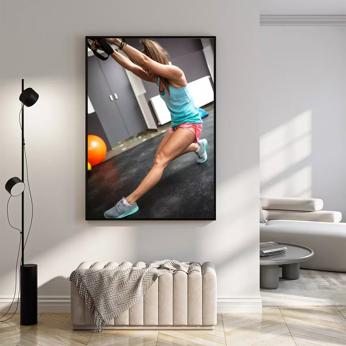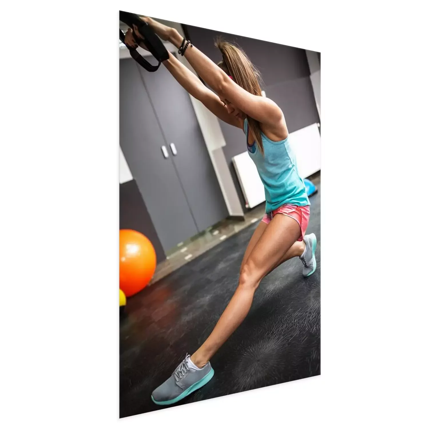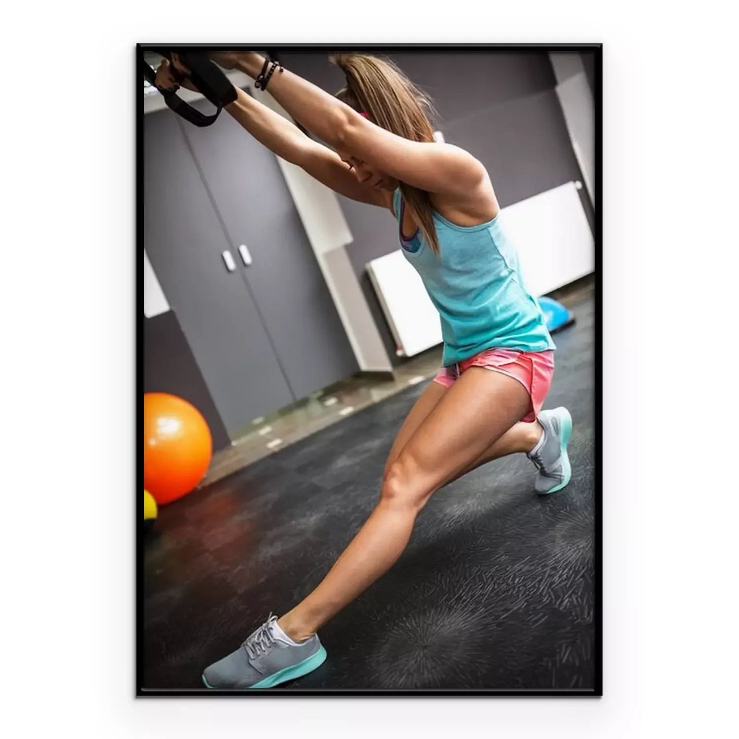 Poster: Jonge vrouw op de sportschool werkt aan haar buikspieren op trx