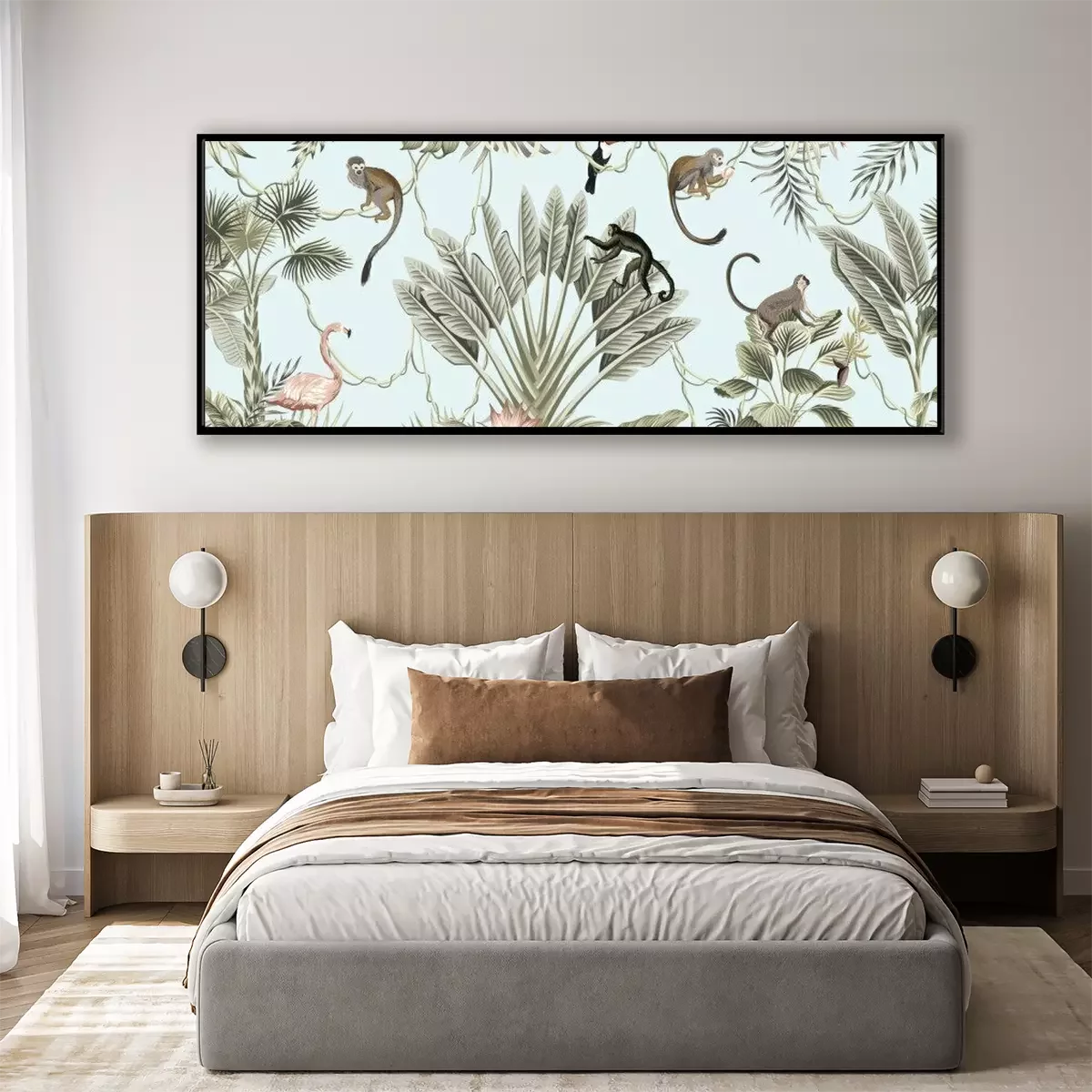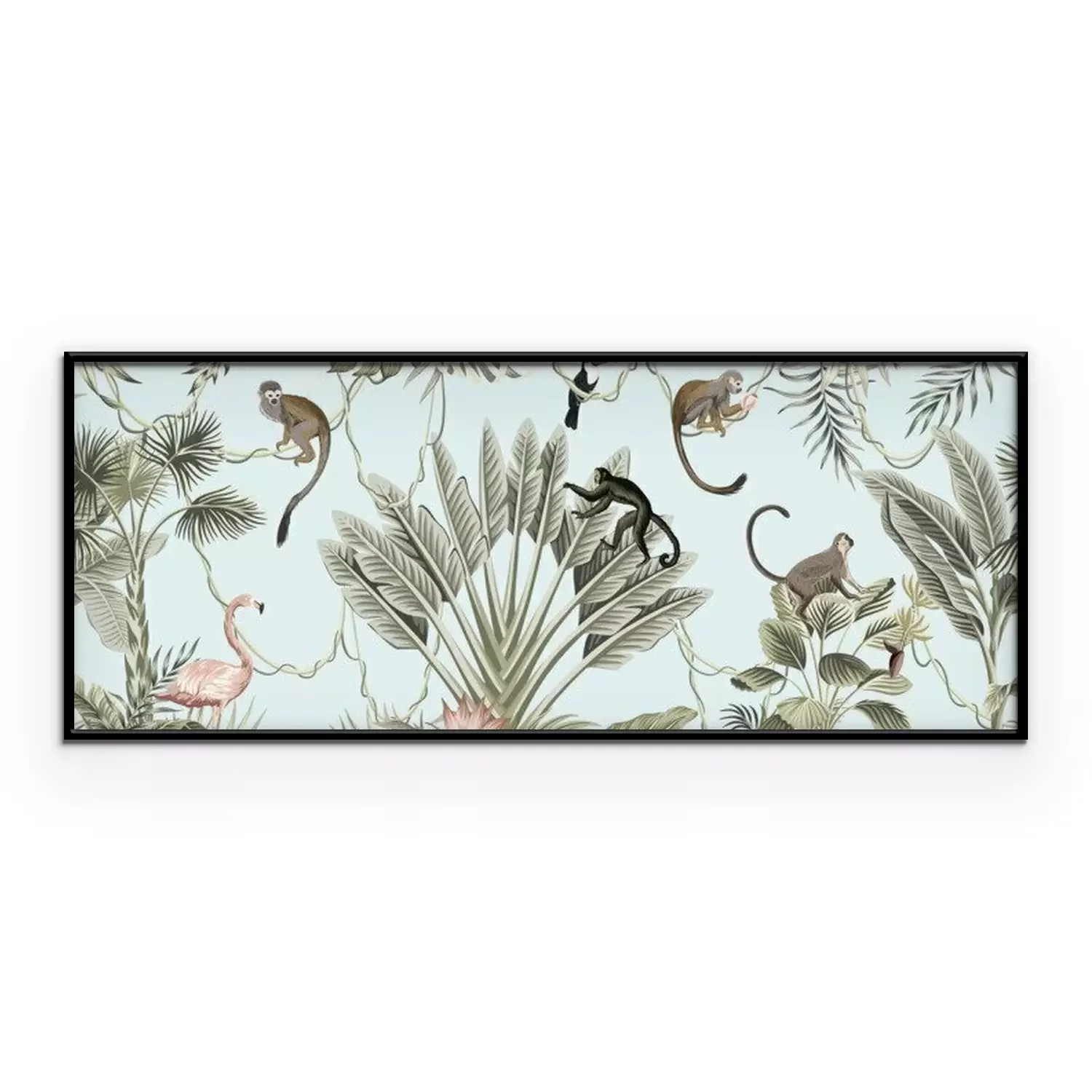 Tropical vintage monkey animal, hibiscus flower, peach fruit, palm leaves floral seamless pattern black background. Exotic jungle wallpaper.