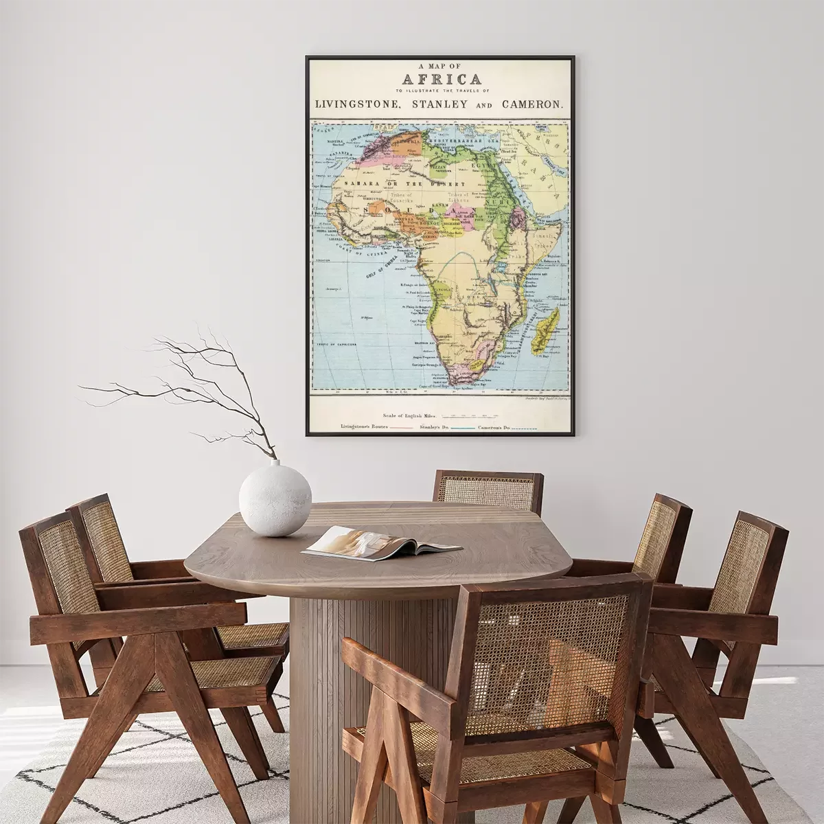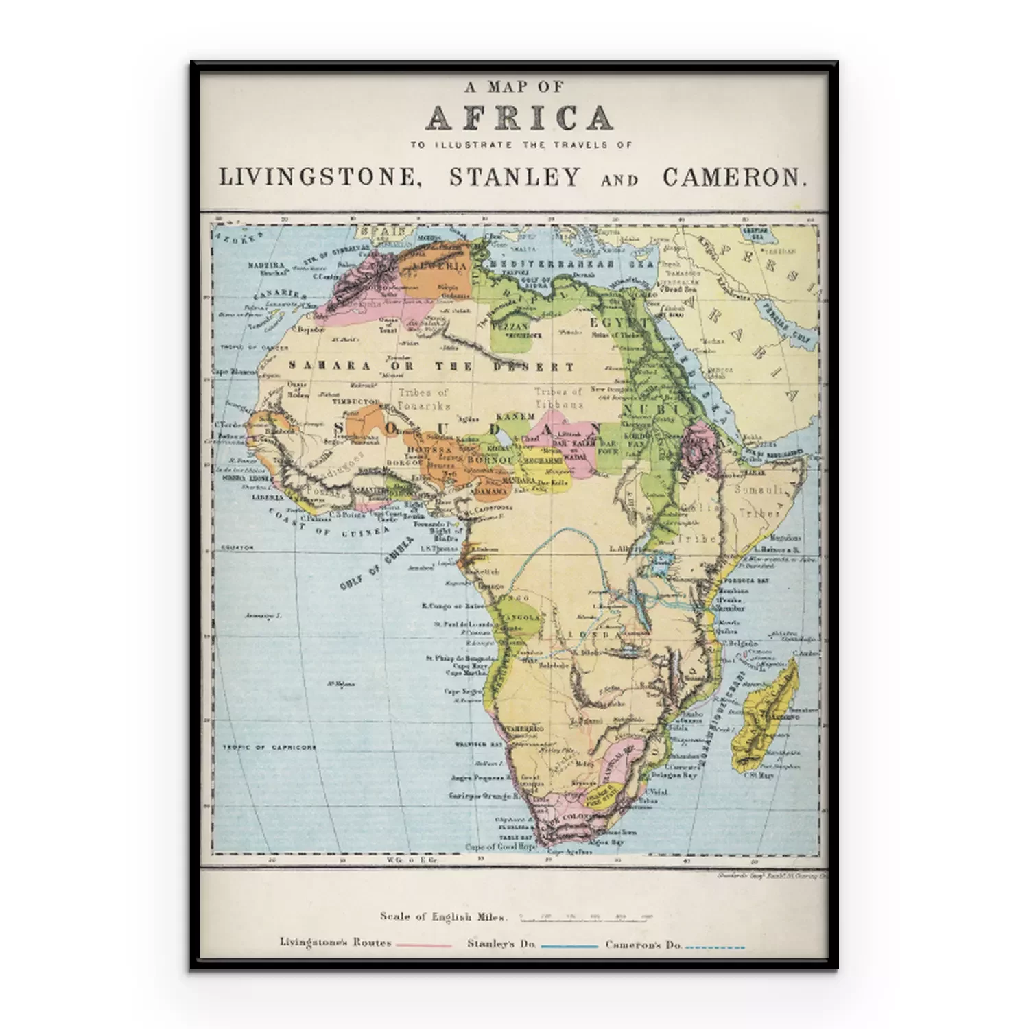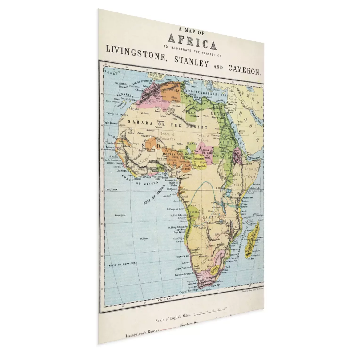 Poster Kaart van Afrika illustreert reizen van ontdekkingsreizigers. Datum: 19e eeuw