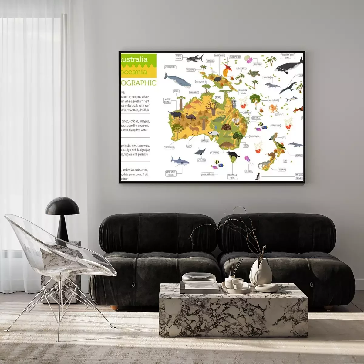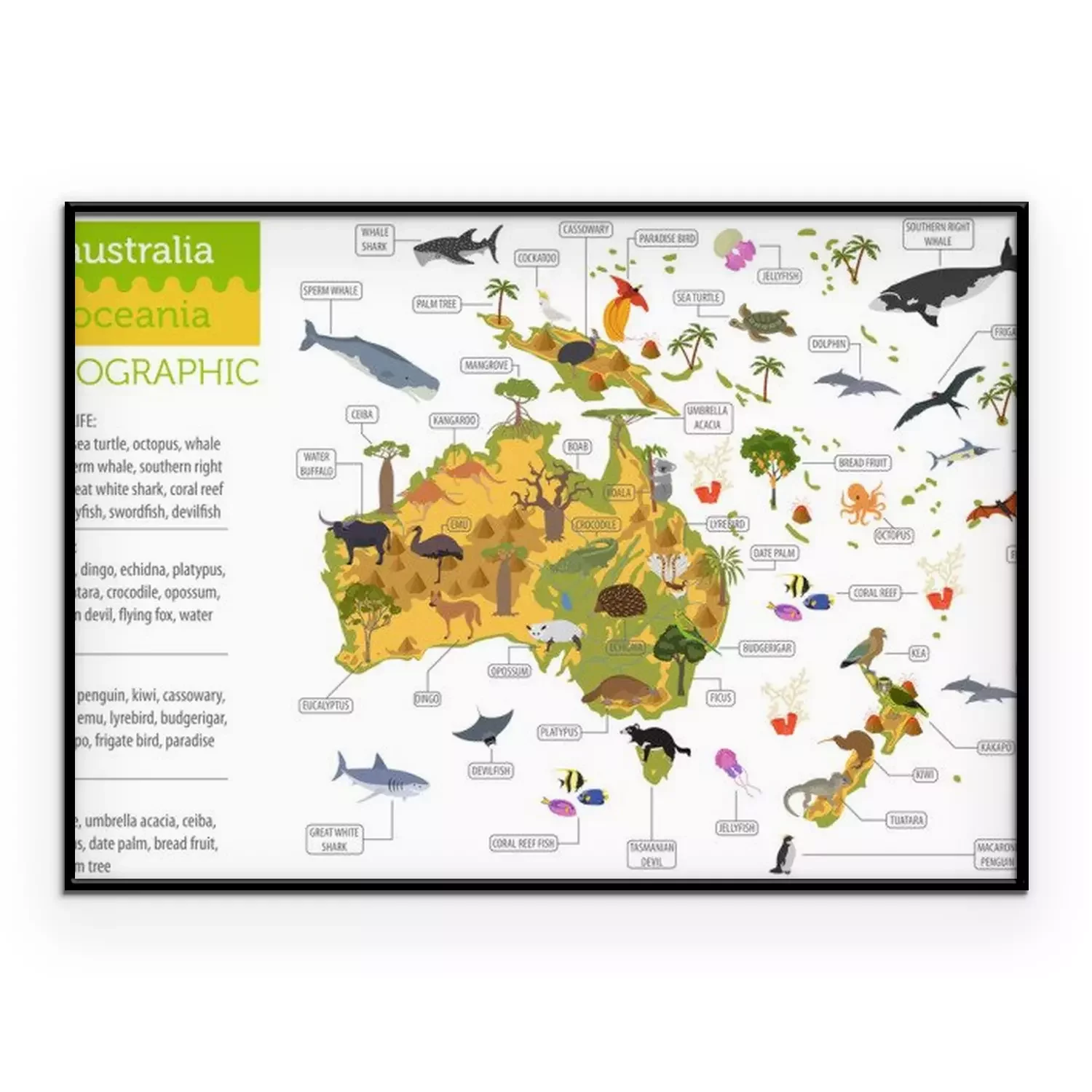 Poster Kaart van Australië en Oceanië flora en fauna, vlakke elementen. Dieren, vogels en zee leven grote reeks. Bouw uw infographicscollectie voor geografie