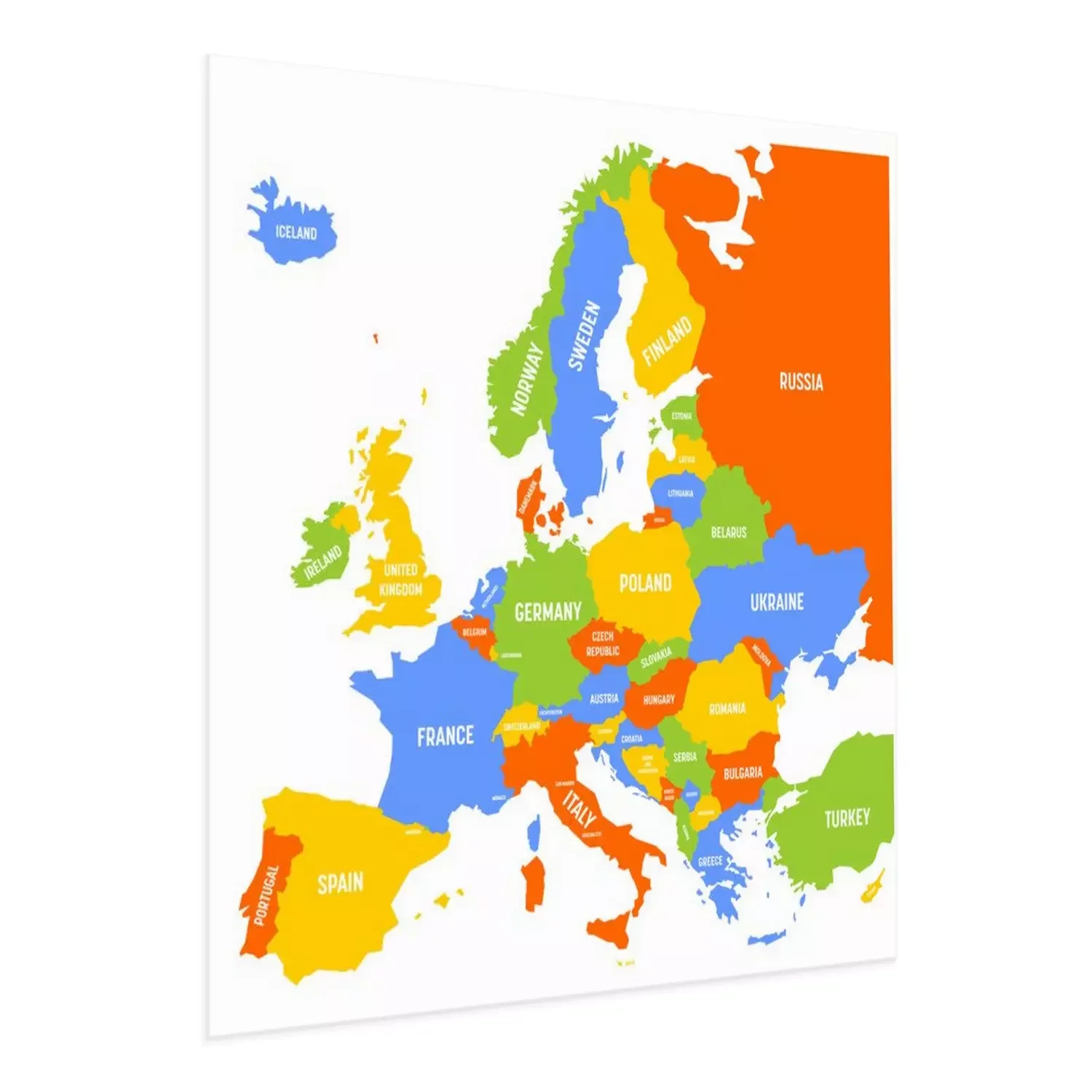 Poster: Kaart van Europa met namen van soevereine landen, ministaten en Kosovo inbegrepen. Vereenvoudigde vectorkaart in vier kleurenthema op witte achtergrond.