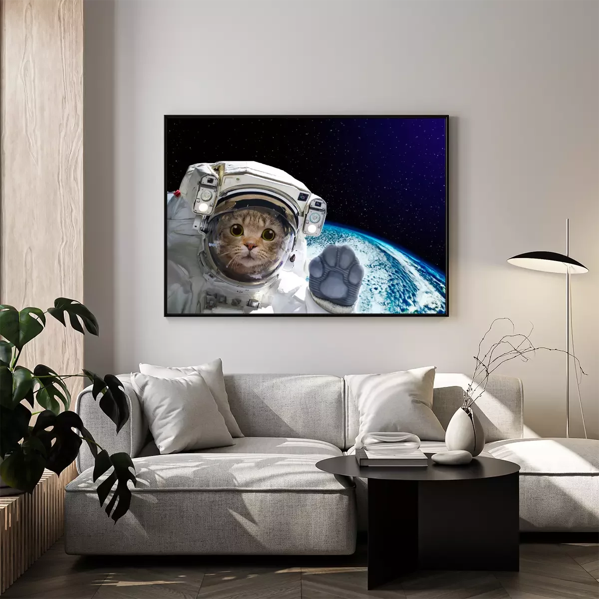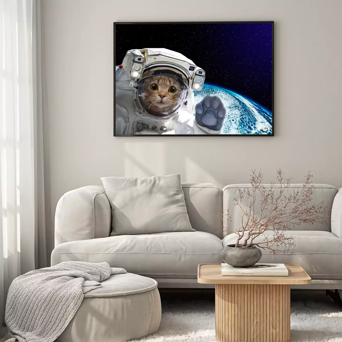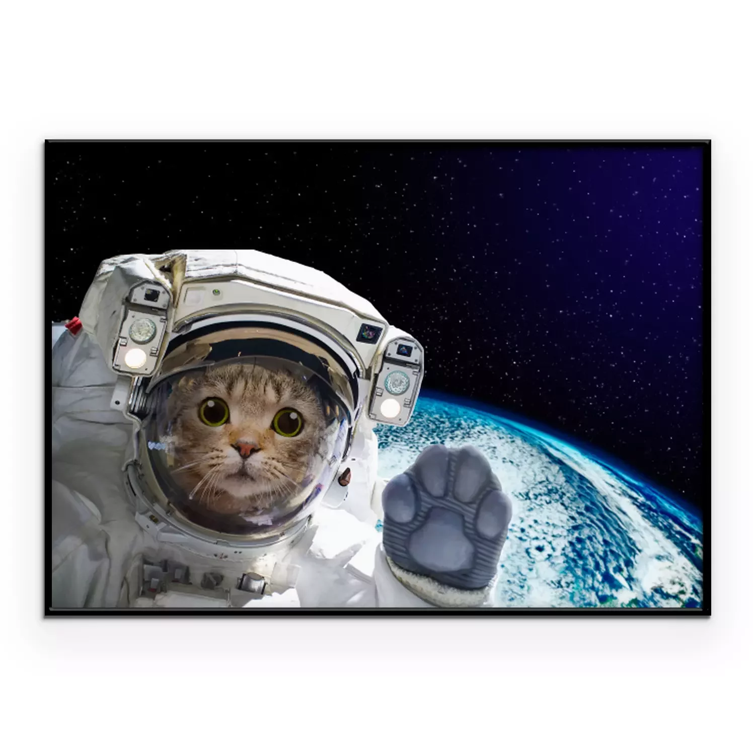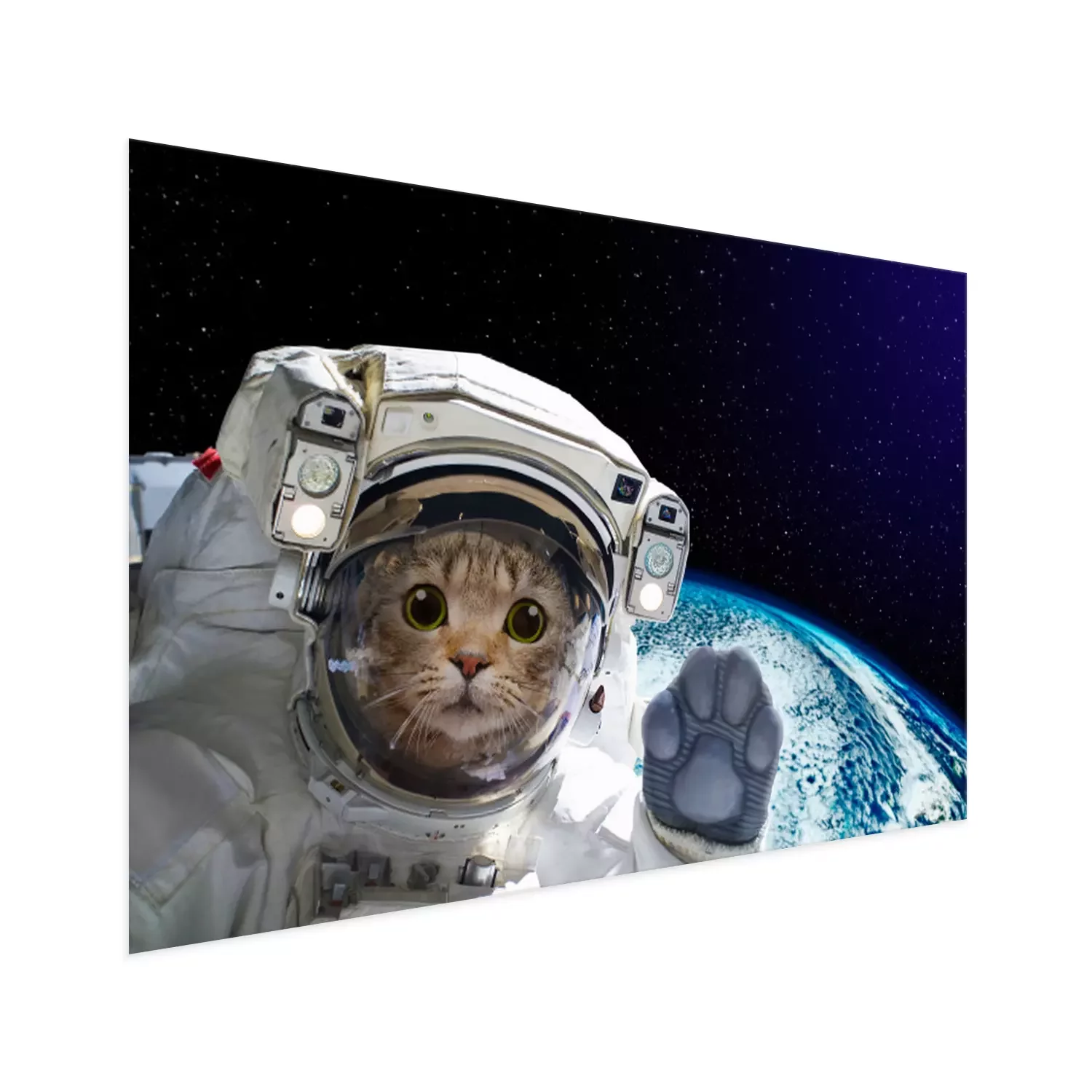 Poster: Kat astronaut in de ruimte op de achtergrond van de wereldbol. Elementen van deze afbeelding ingericht door NASA.