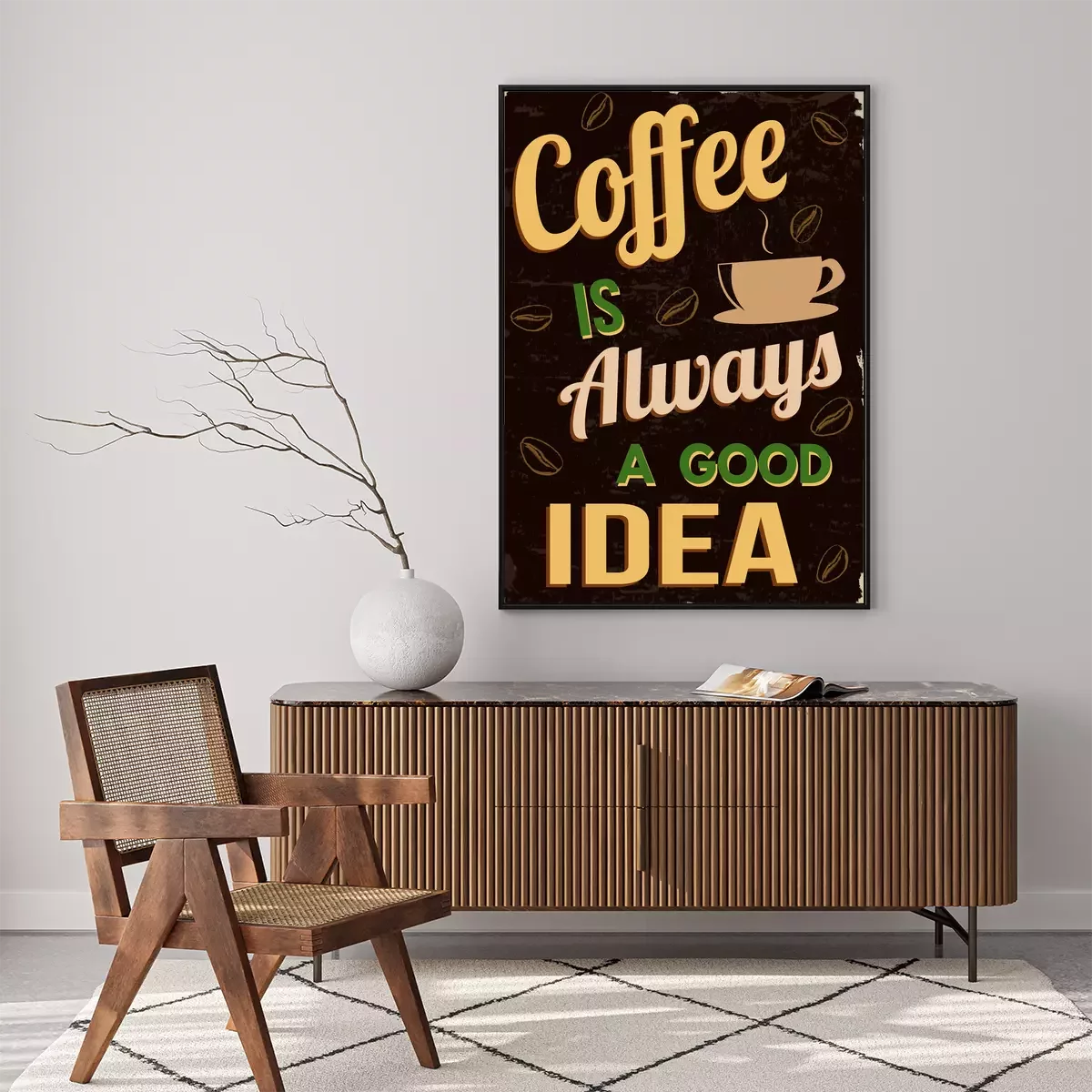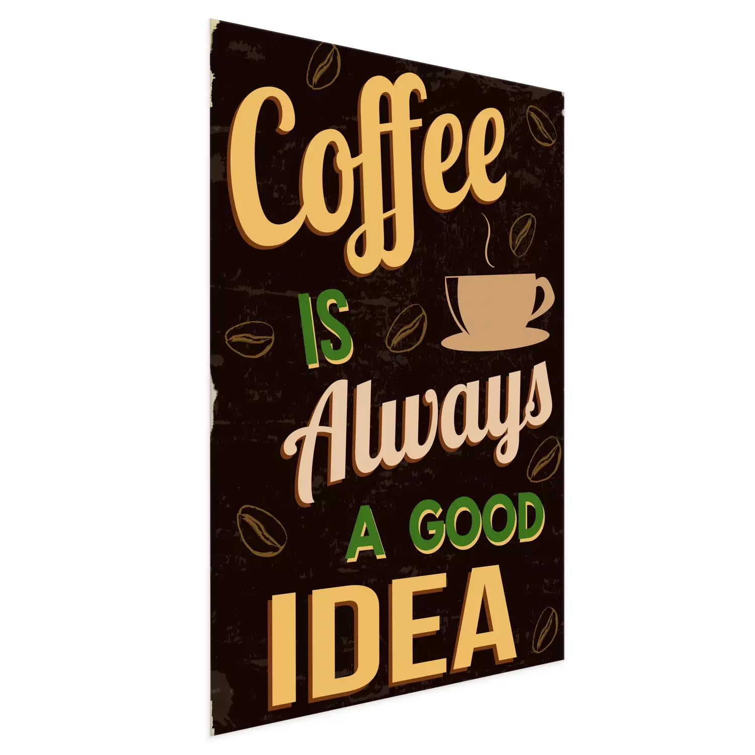 Poster: Kleurrijke afbeeldingen met een slogan over koffie
