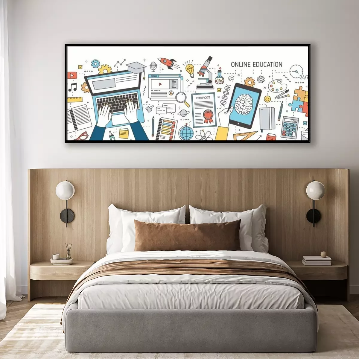 Poster Kleurrijke horizontale banner met handen die op laptop typen en tabletcomputer en diverse bureaulevering houden. Afstand online onderwijs, internet leren. Vectorillustratie in lijn kunststijl.