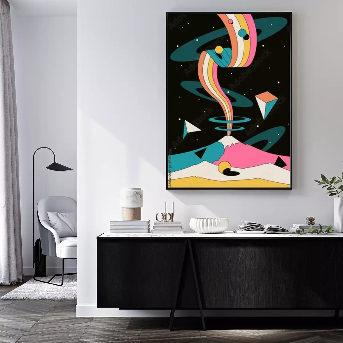 Psychedelic Art Style Poster, Egyptian Scarab and Iris Flowers, Art Nouveau Frame, Psychedelic Color Combination, 1960s Hippie Music Album Covers Stylization