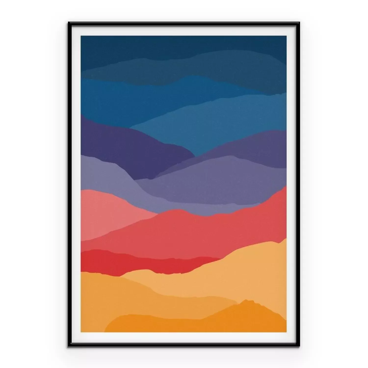 Poster: Kleurrijke verticale achtergrond of kaartsjabloon met abstracte golven of lagen heldere kleuren. Achtergrond met woestijn of berglandschap. Creatieve vectorillustratie in eigentijdse kunststijl.