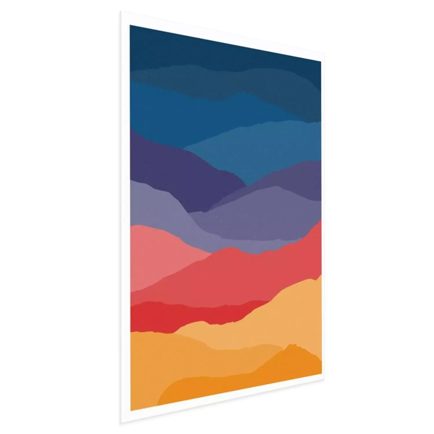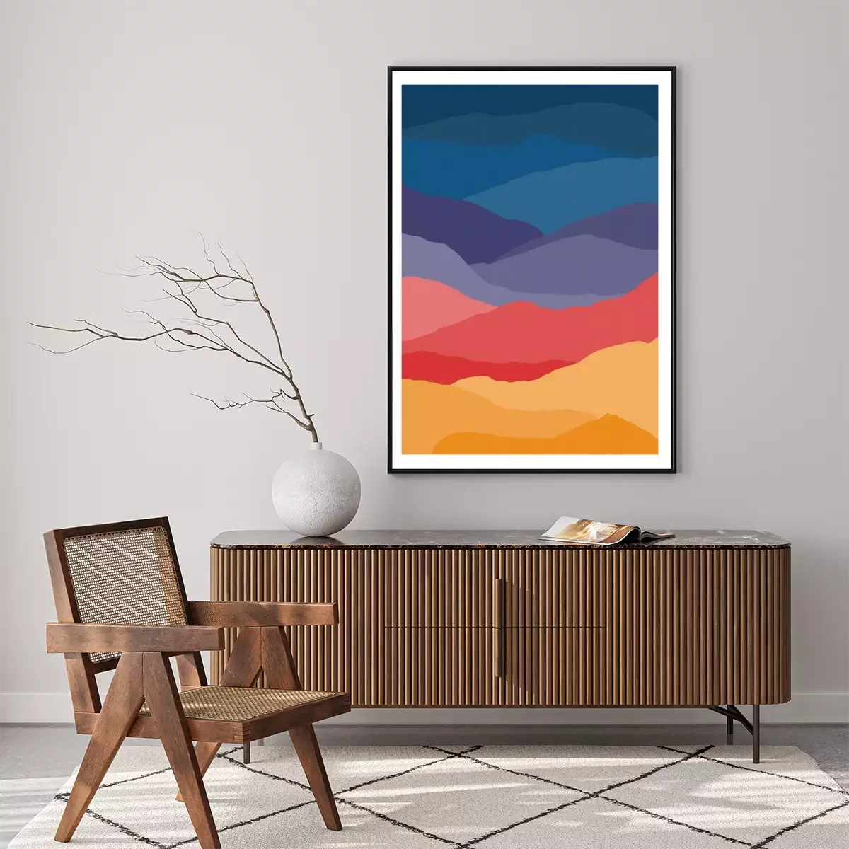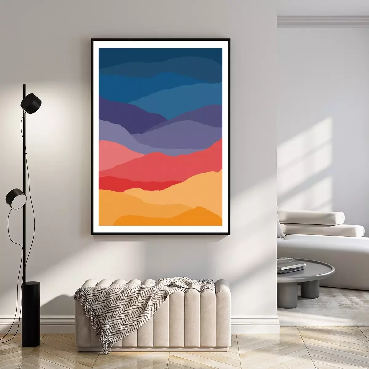 Poster Kleurrijke verticale achtergrond of kaartsjabloon met abstracte golven of lagen heldere kleuren. Achtergrond met woestijn of berglandschap. Creatieve vectorillustratie in eigentijdse kunststijl.