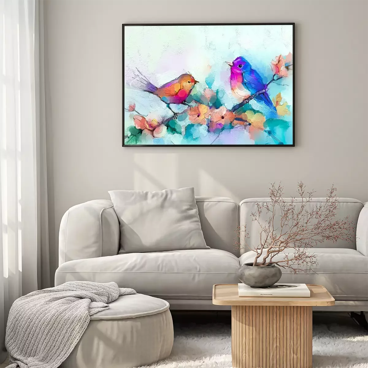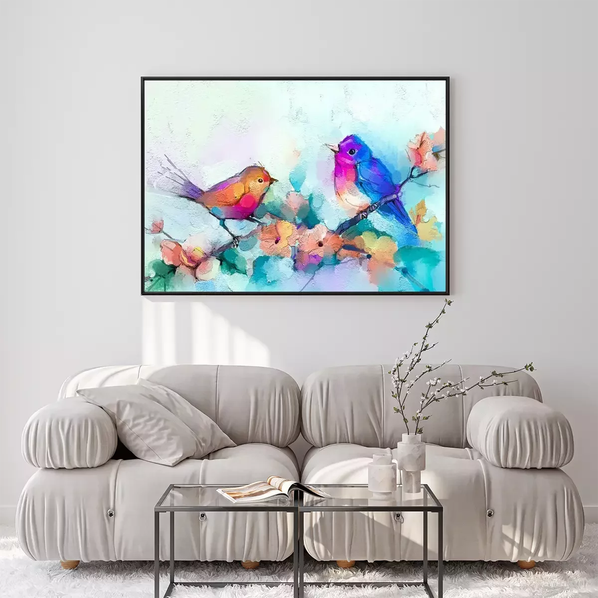 Abstract colorful oil, acrylic painting of bird and spring flower. Modern art paintings brush stroke on canvas. Illustration oil painting, animal and floral for background.