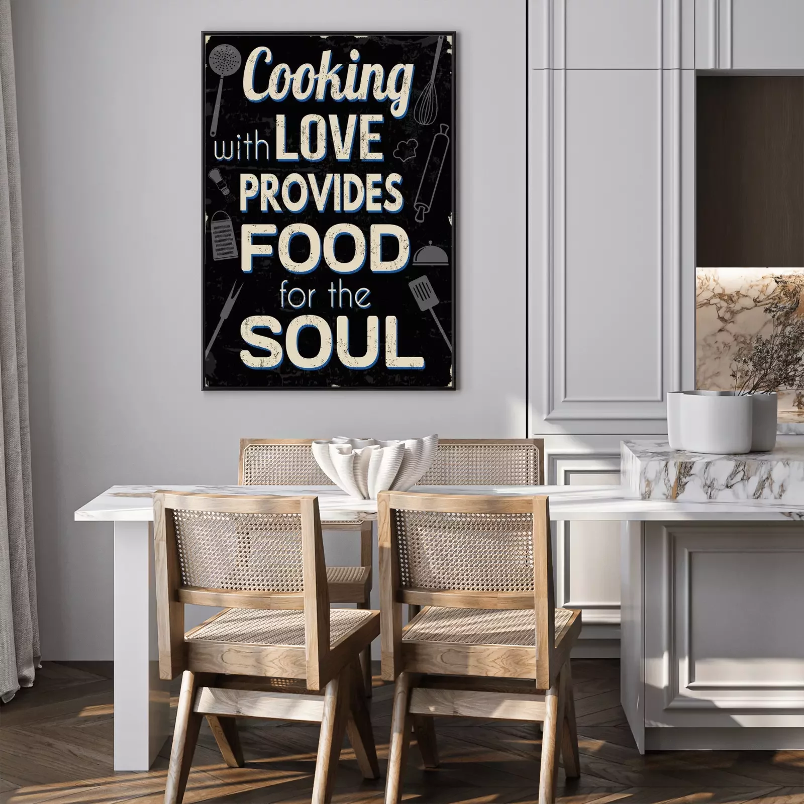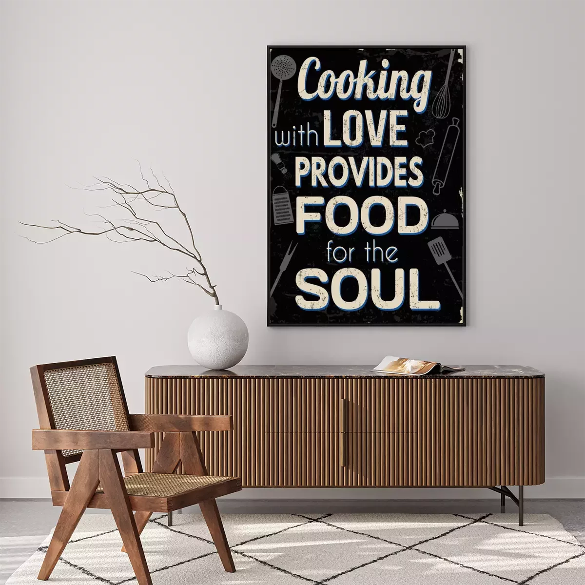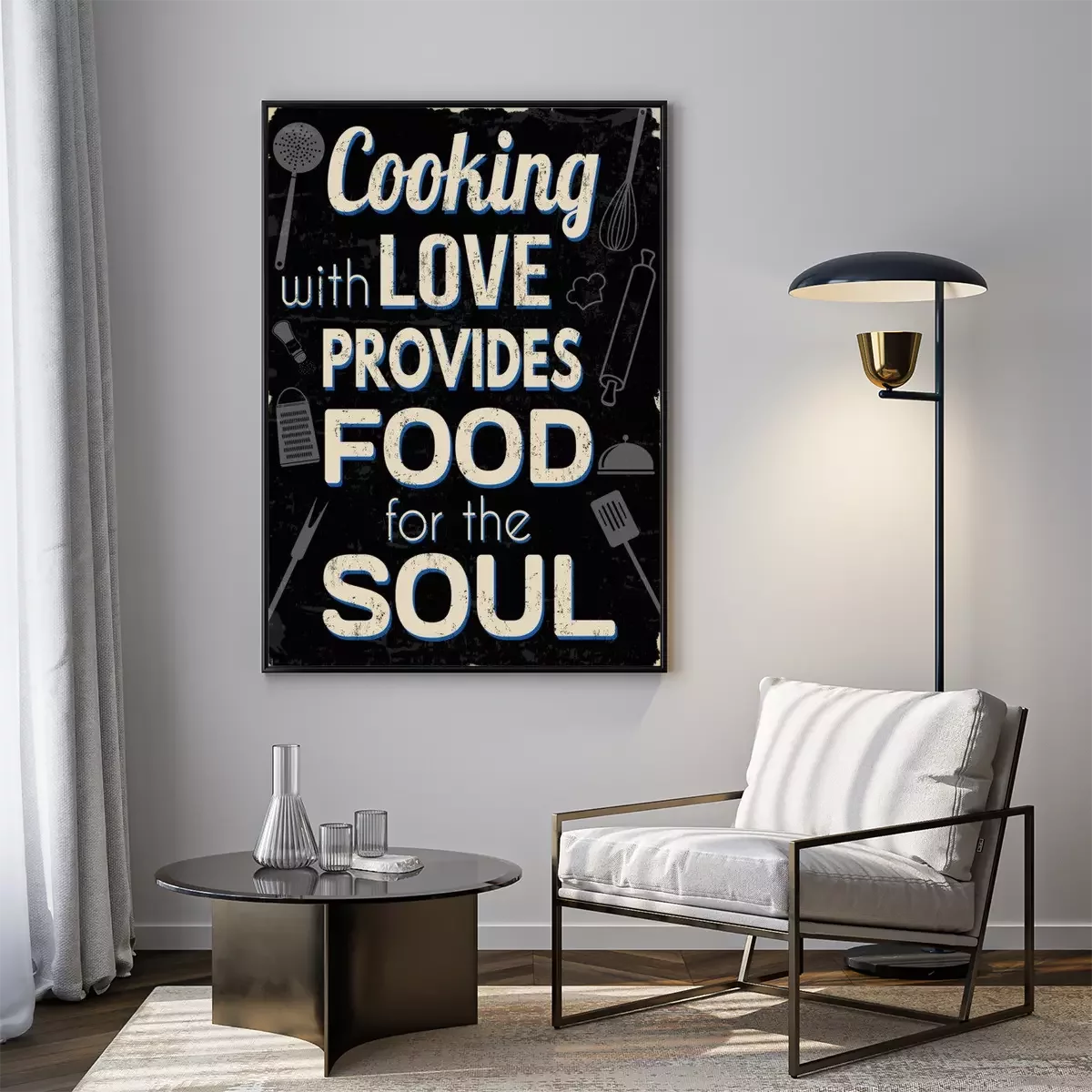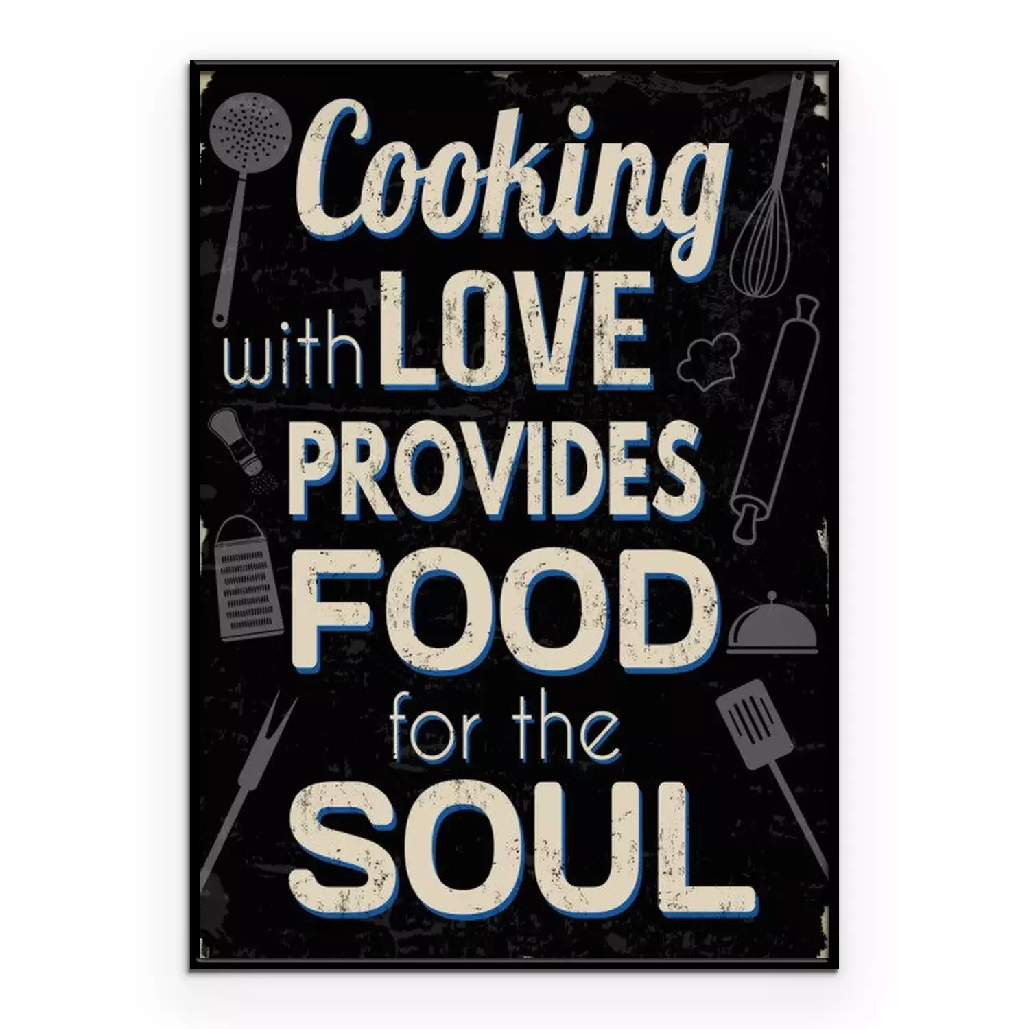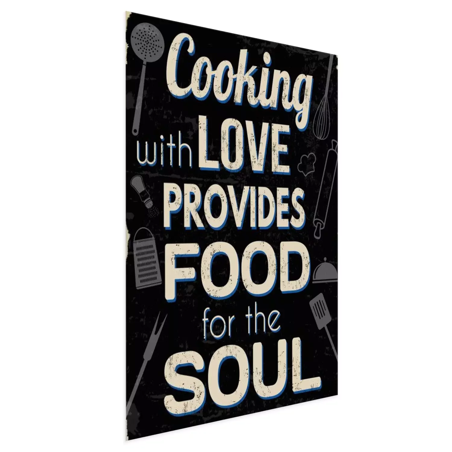 Poster: Koken met liefde biedt voedsel voor de ziel, vintage typografie print