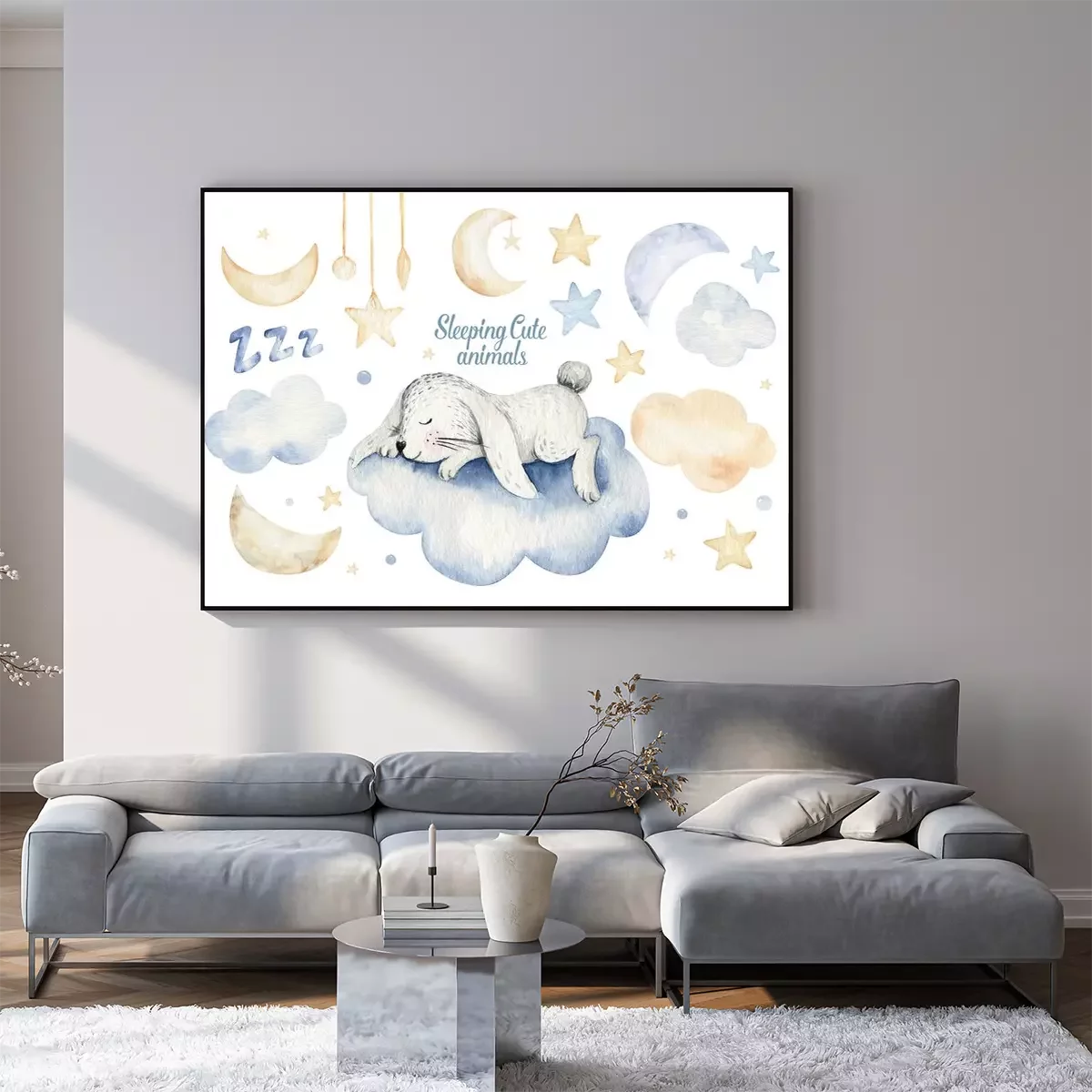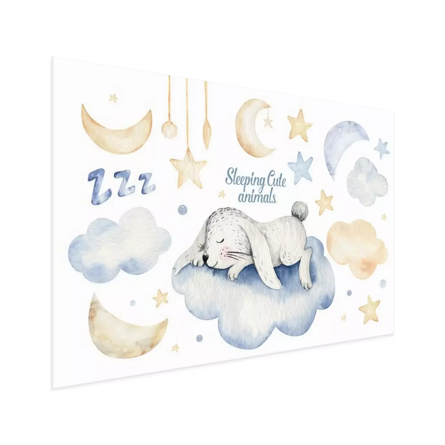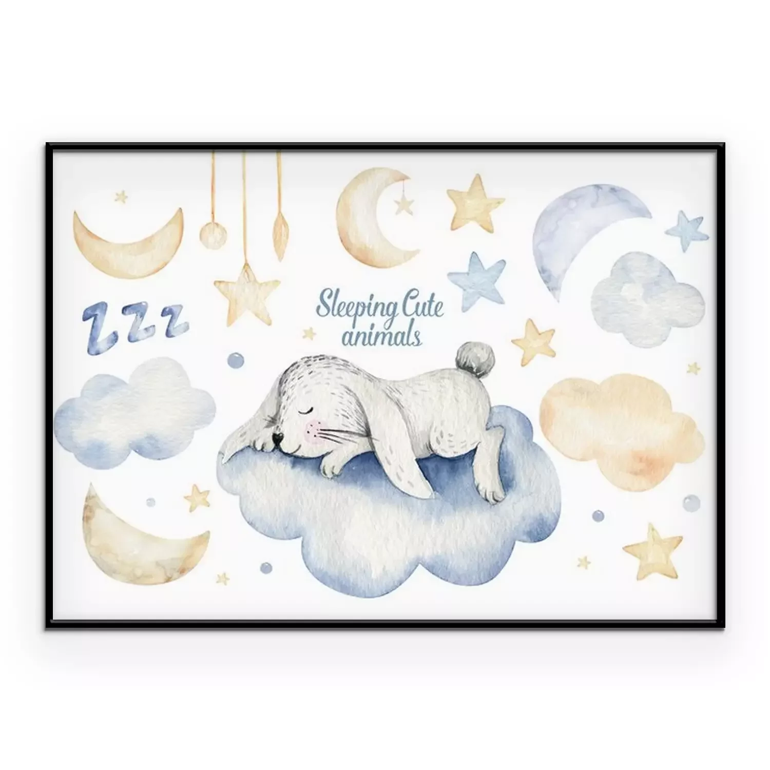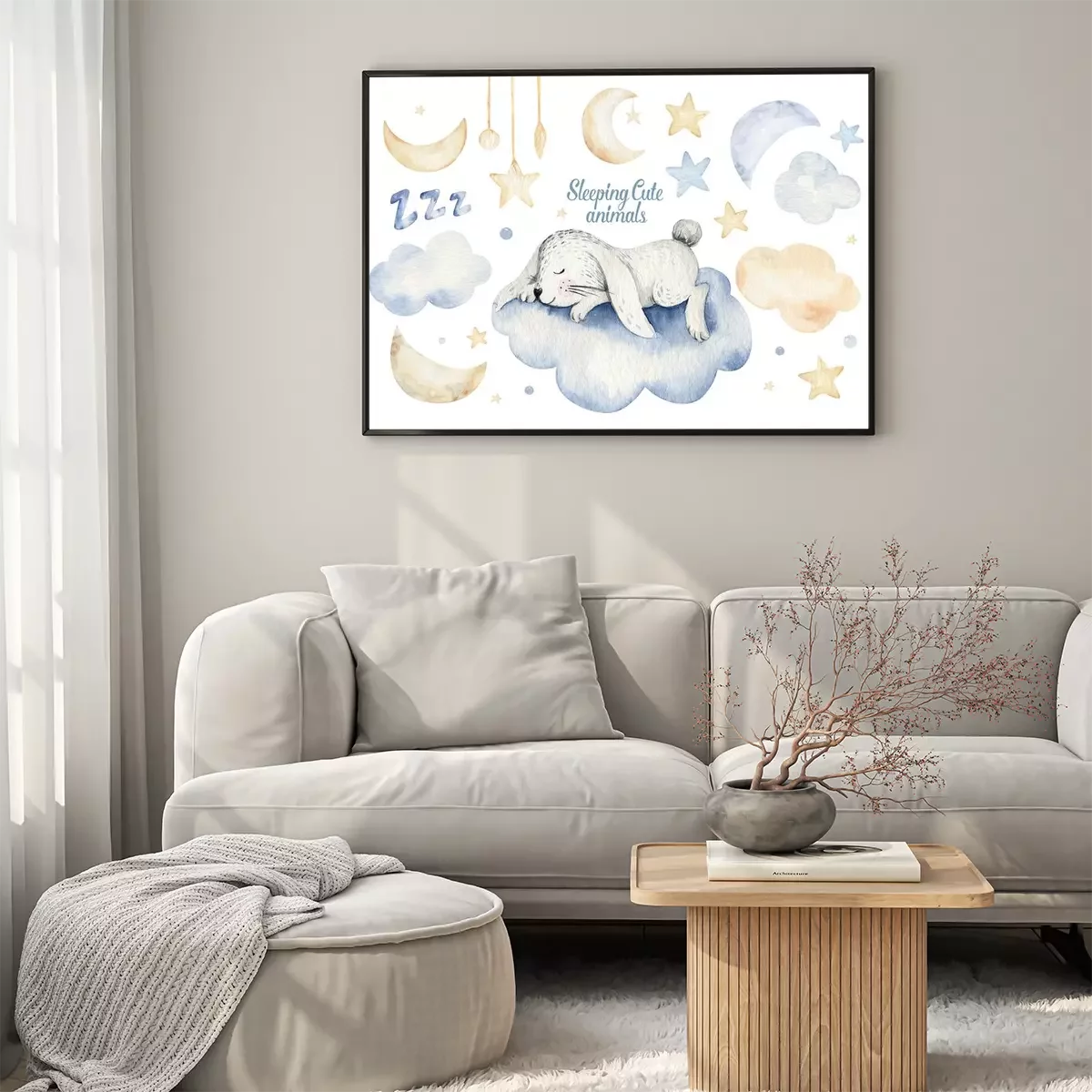 Poster: Konijntje slapend op een wolk omgeven door sterren