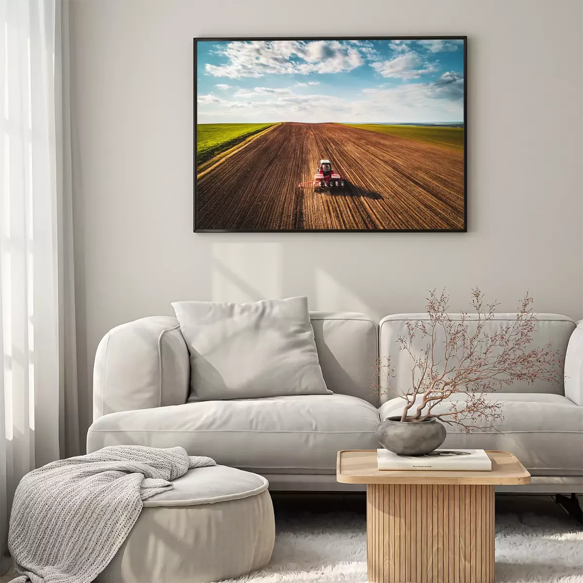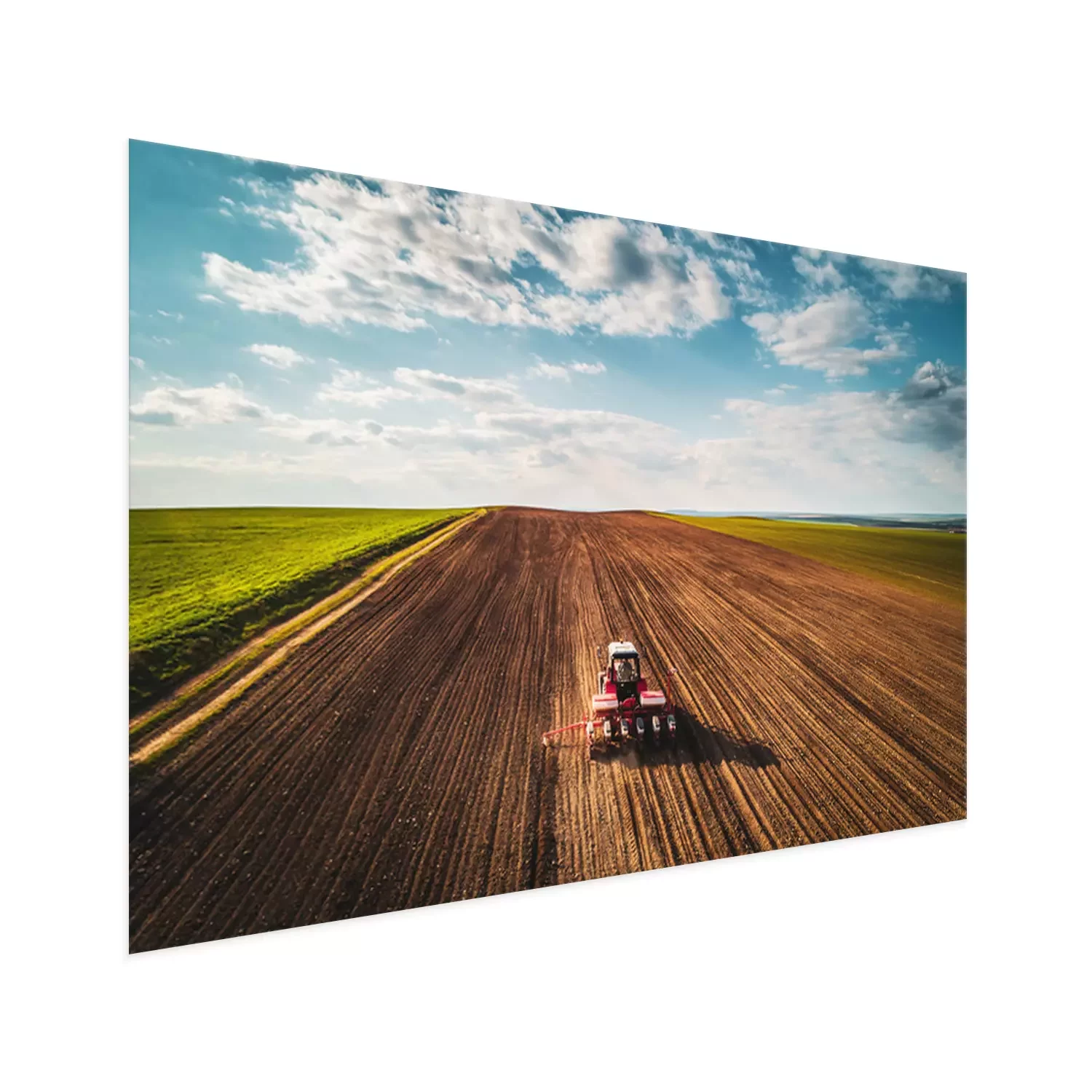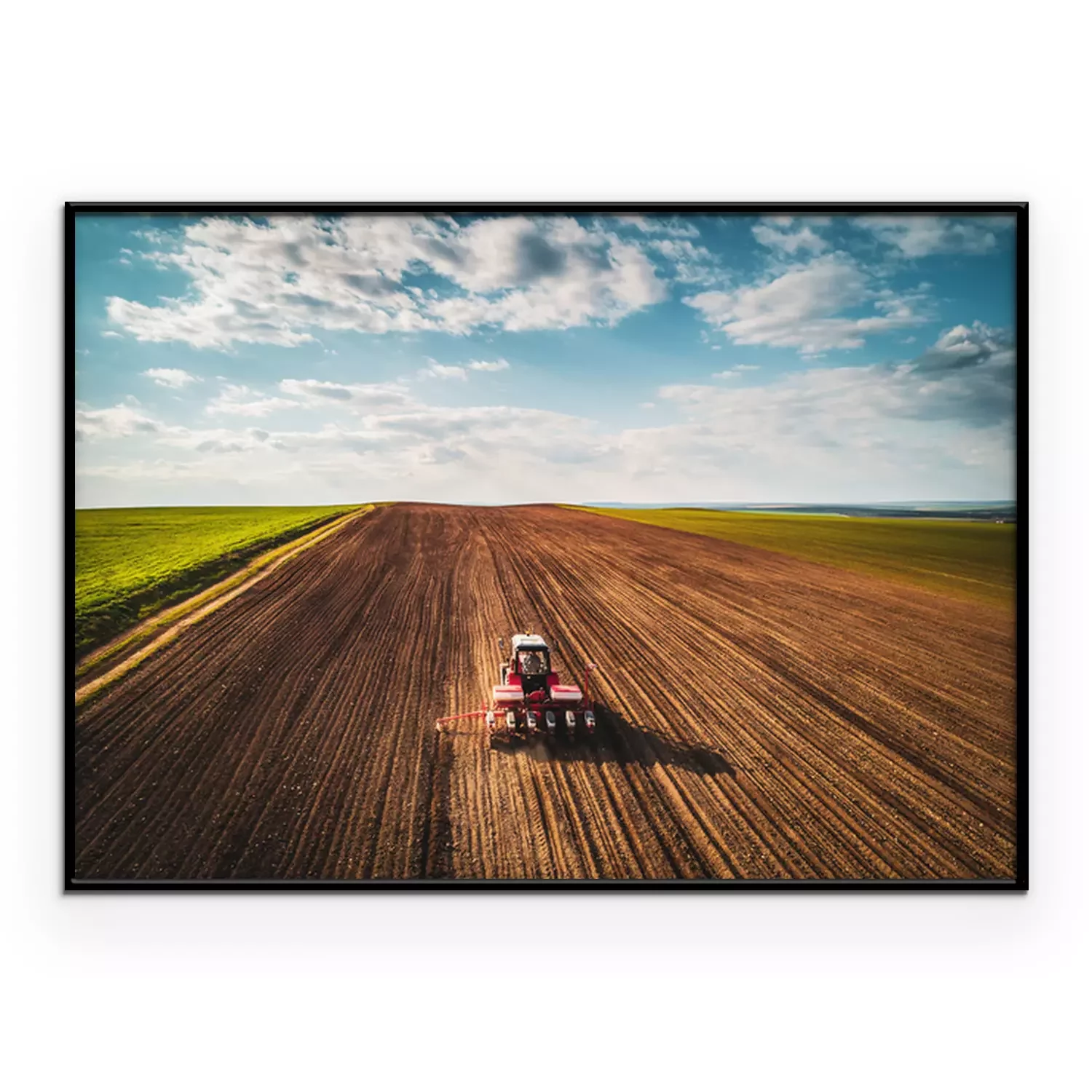 Poster: Landbouwer met tractor zaaiende gewassen bij gebied, luchtmening