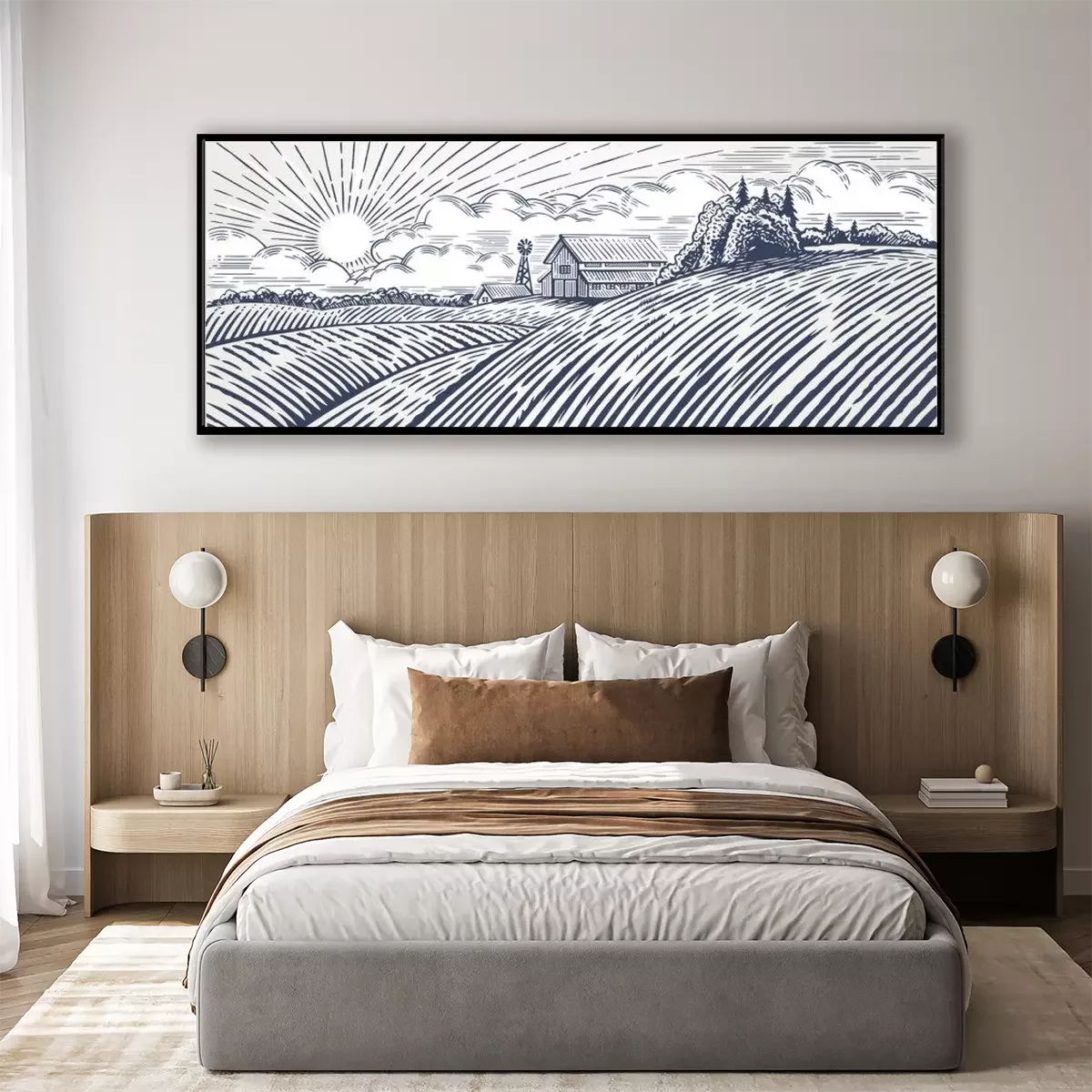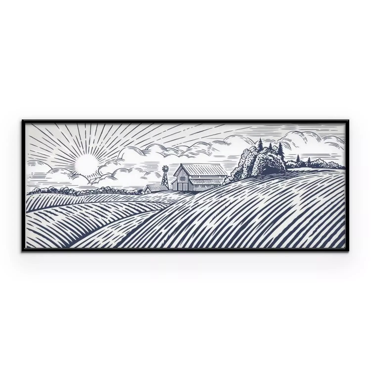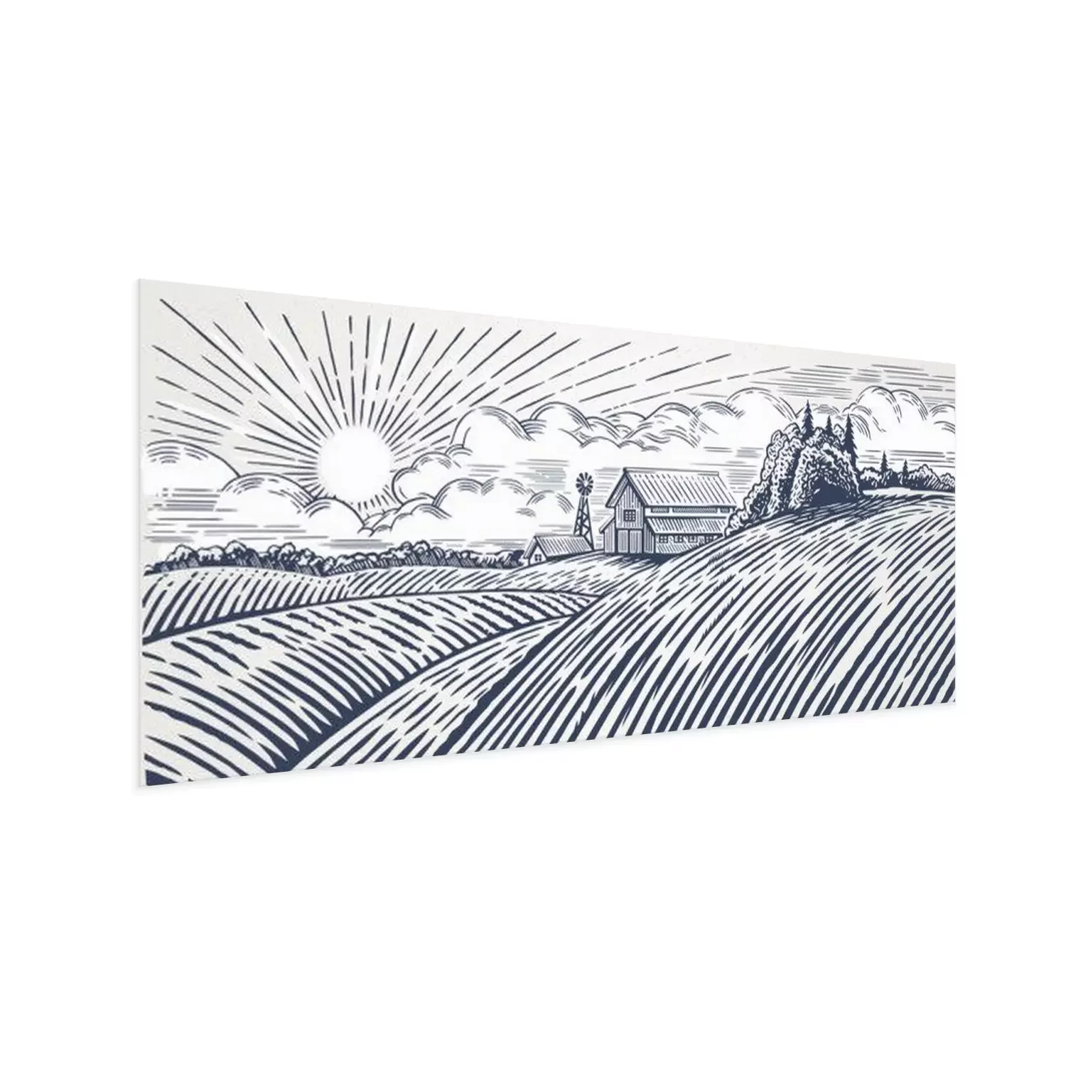 Poster: Landelijk landschap met een boerderij in gravure stijl. Hand getekend en omgezet in vectorillustratie