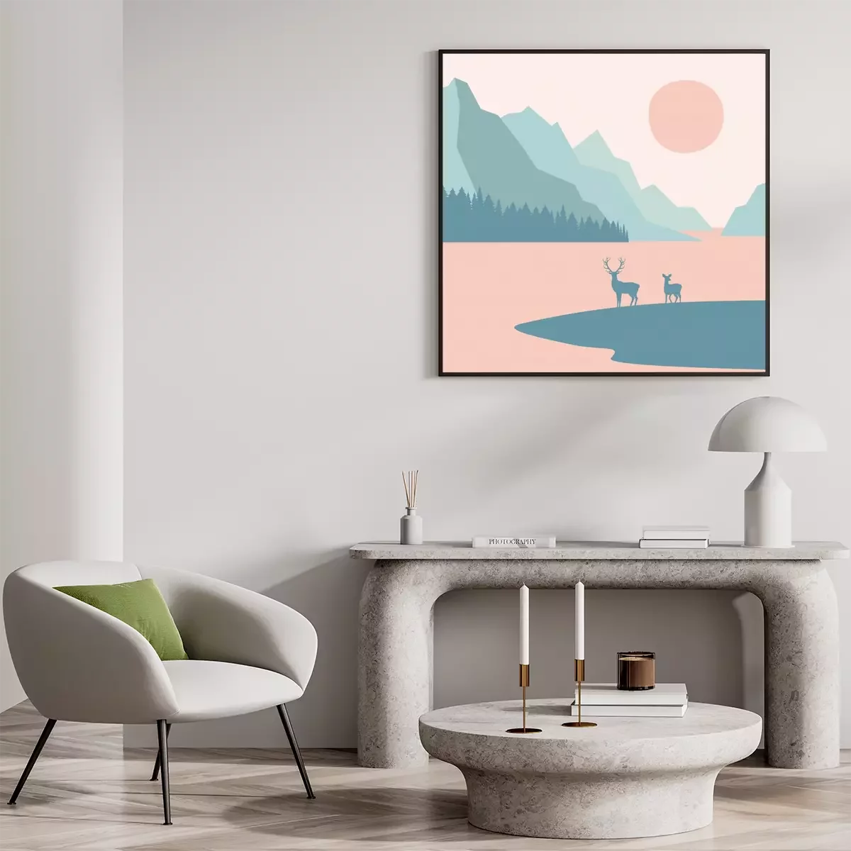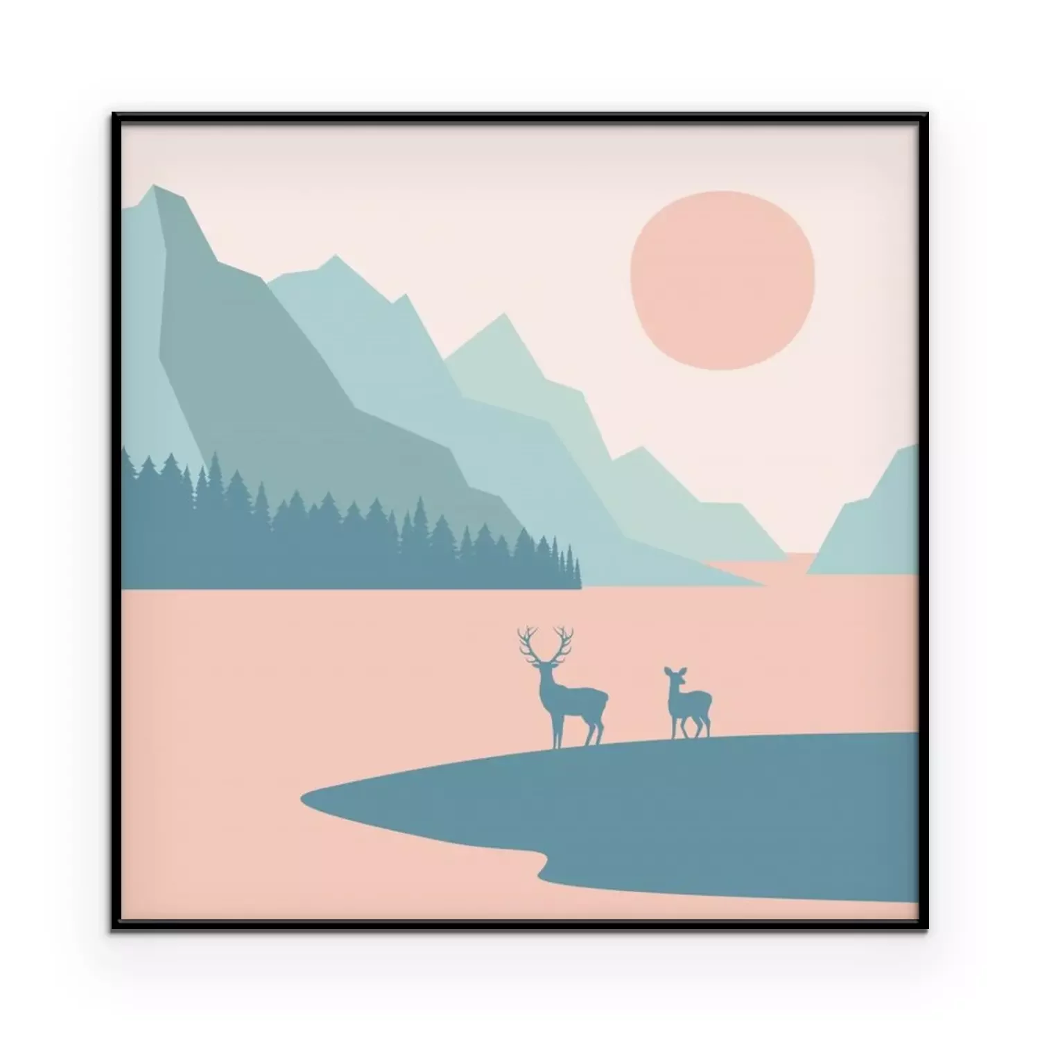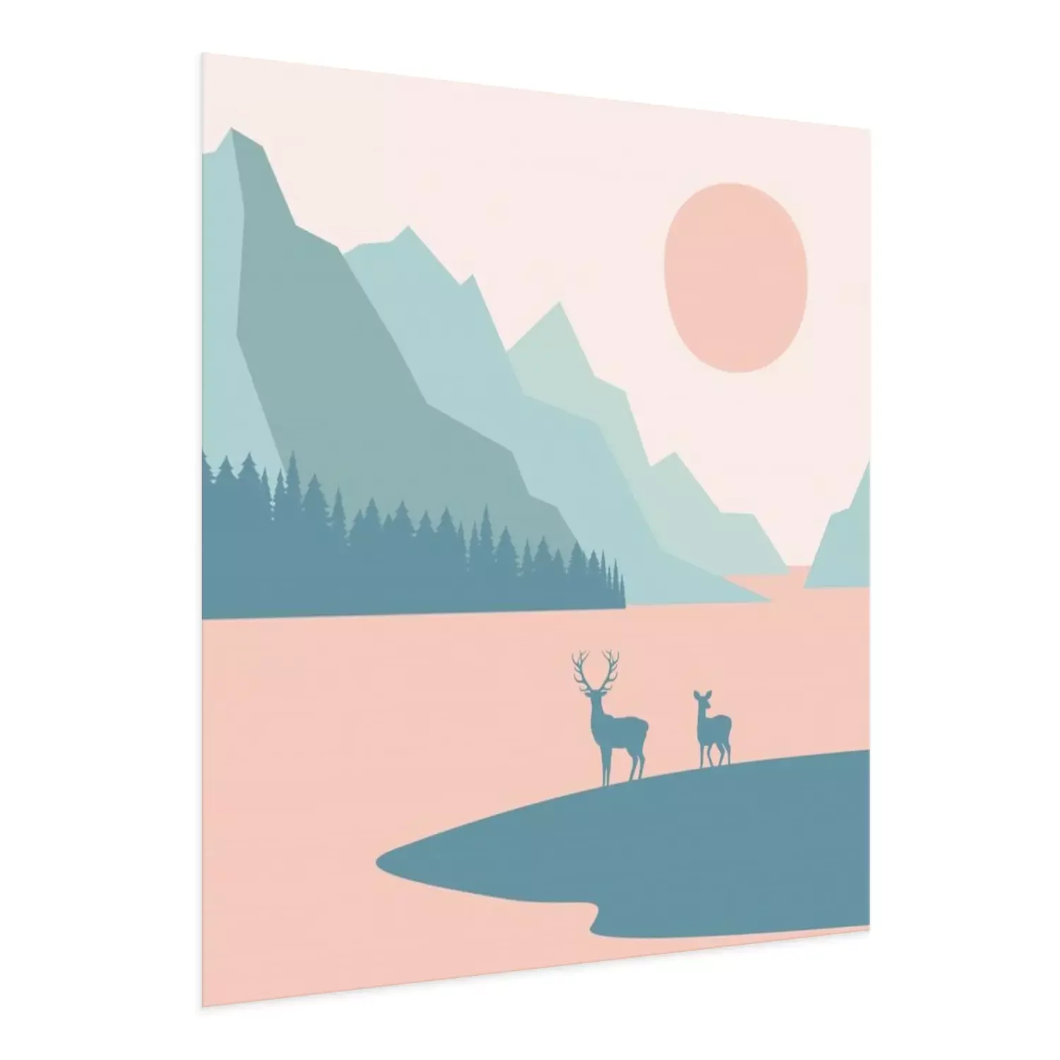 Poster: Landscape, Deers on a background of mountains, forests and a lake