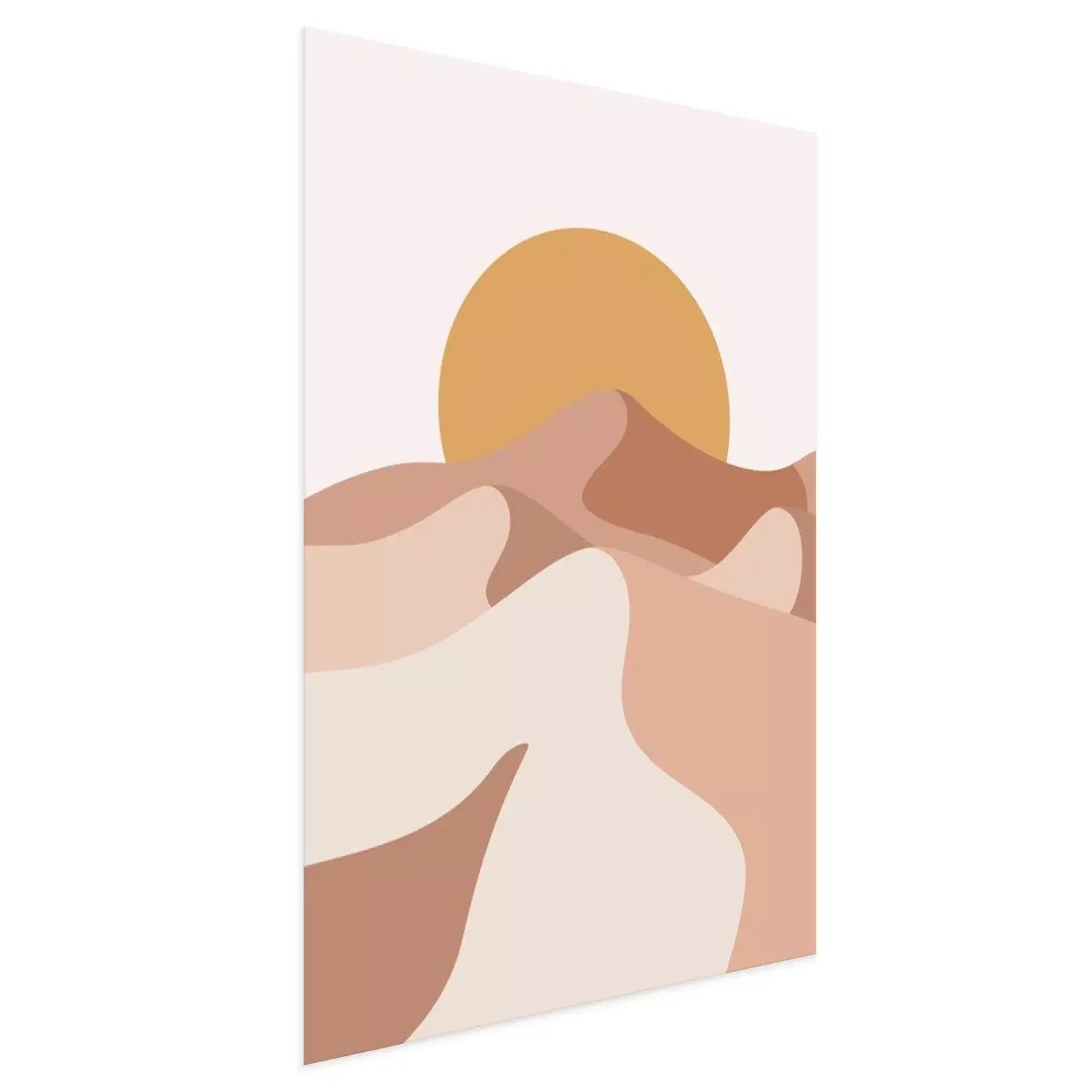 Desert landscape in a vertical format, warm beige colors. Vector illustration with sunset in mountains. Abstract landscape poster.