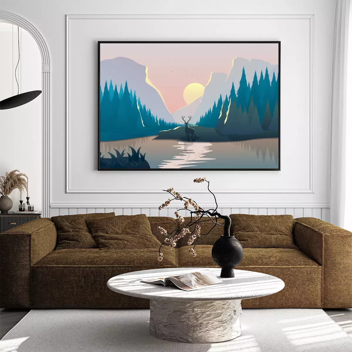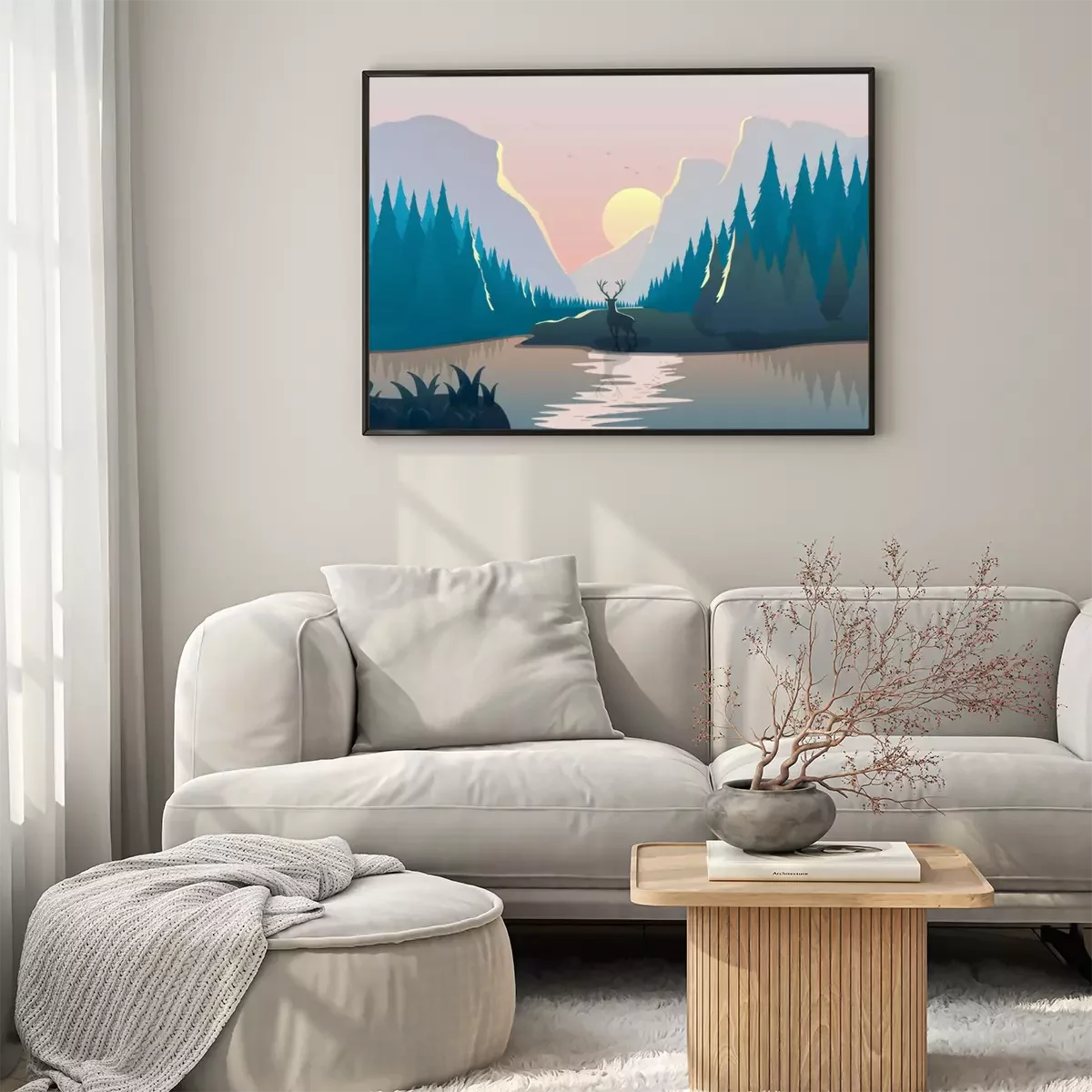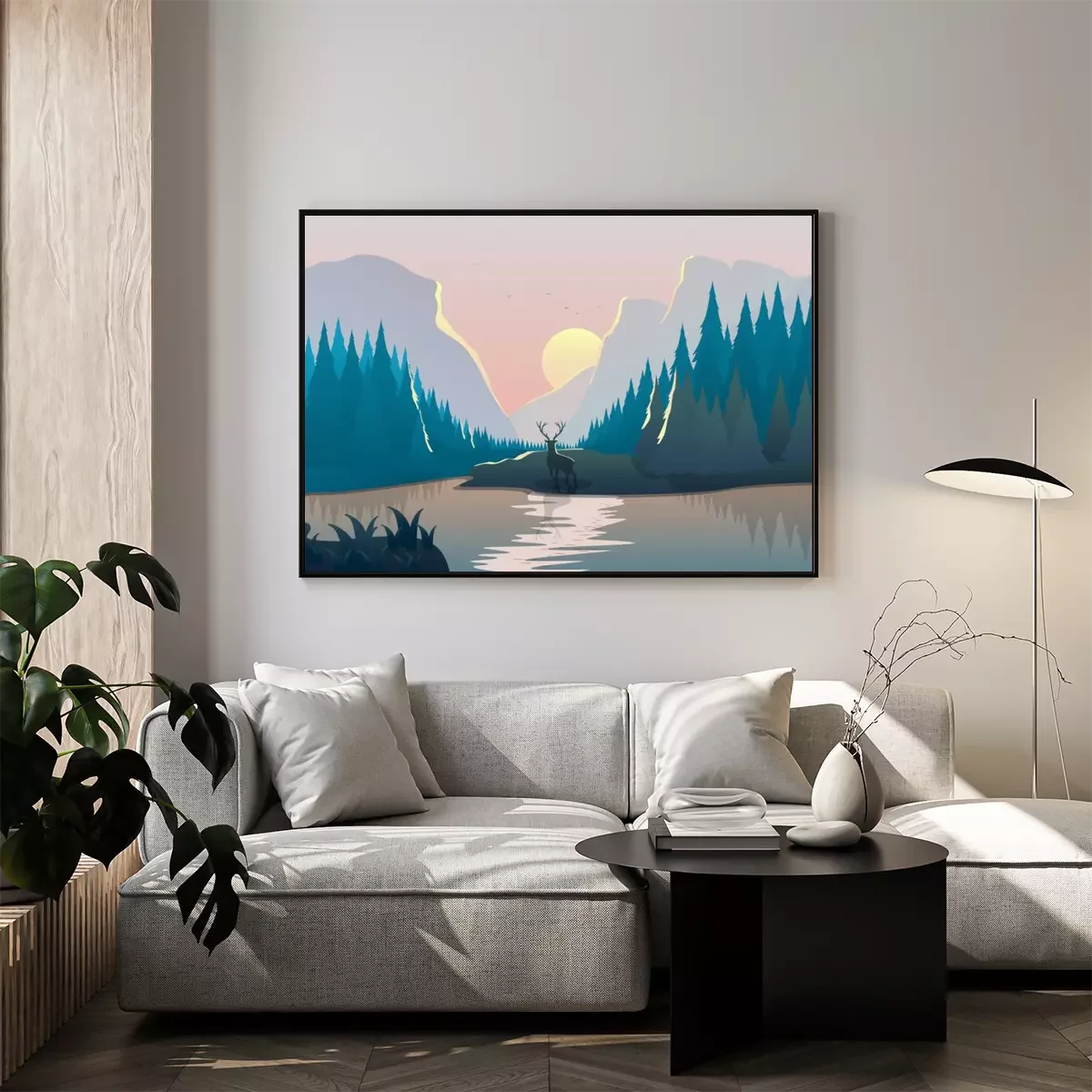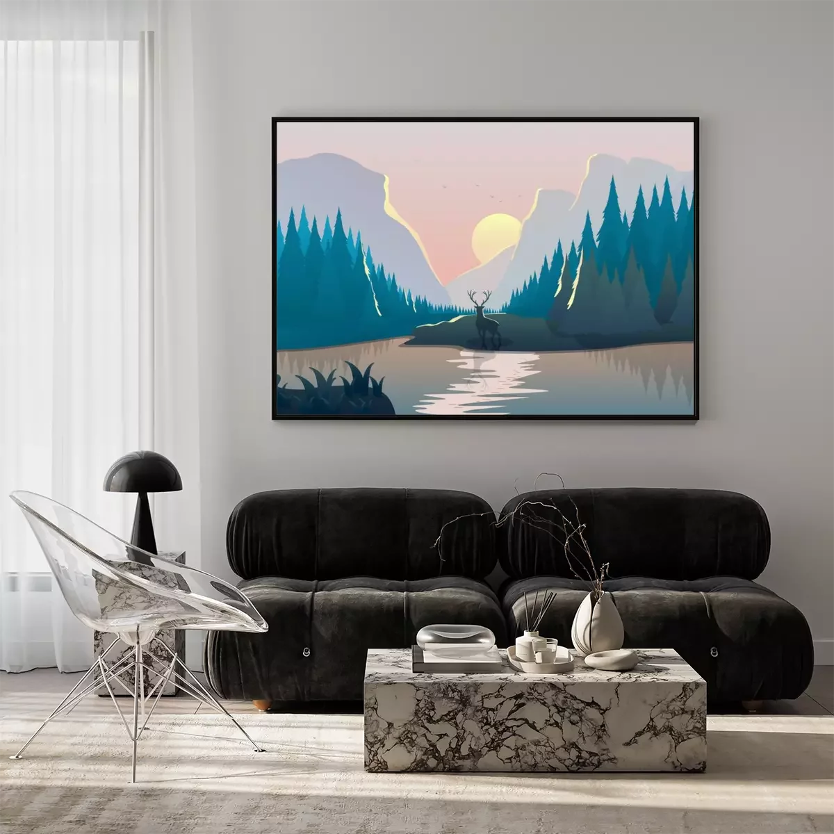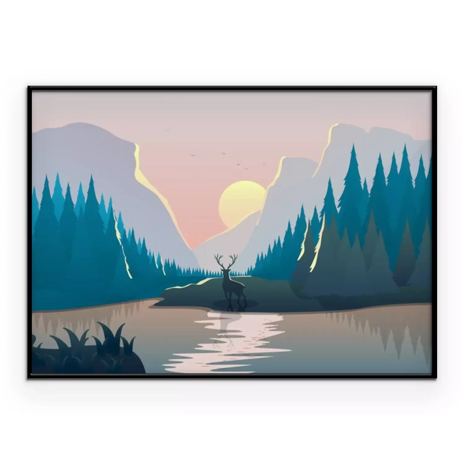 Poster: Landscape vector illustration with a deer, river, spruce forest and mountains at sunset