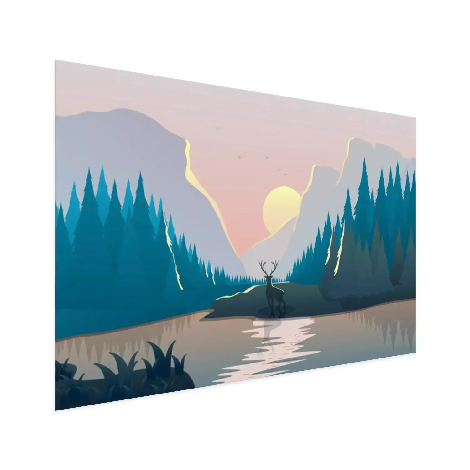 Poster Landscape vector illustration with a deer, river, spruce forest and mountains at sunset