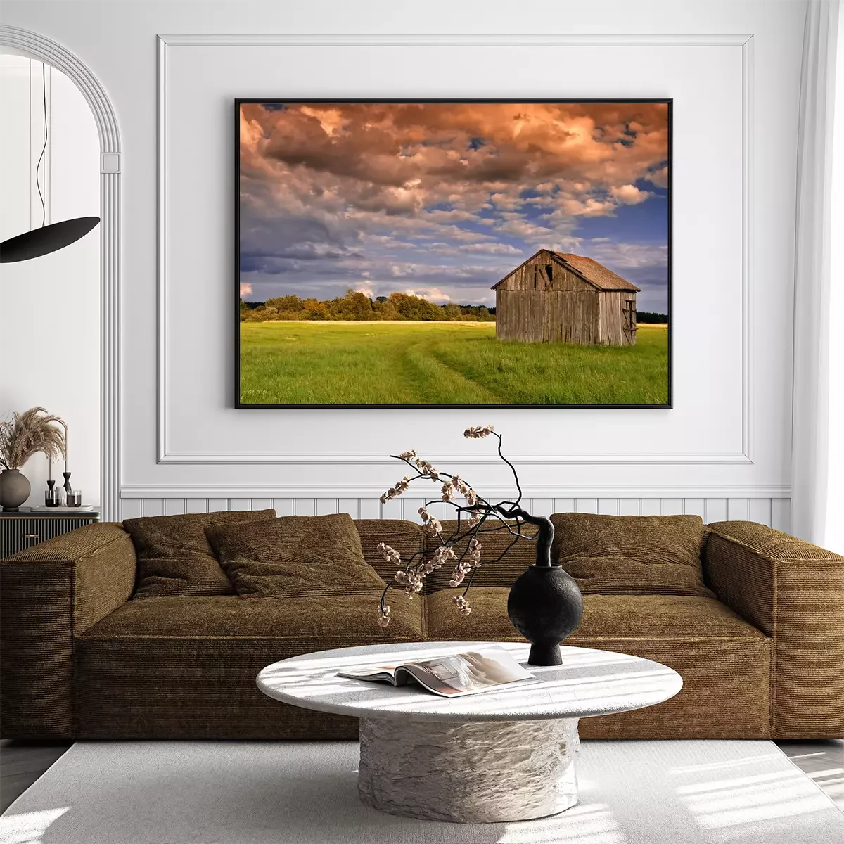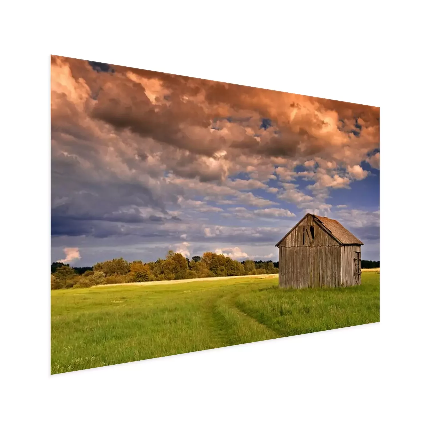 Poster Landschap met een houten schuur