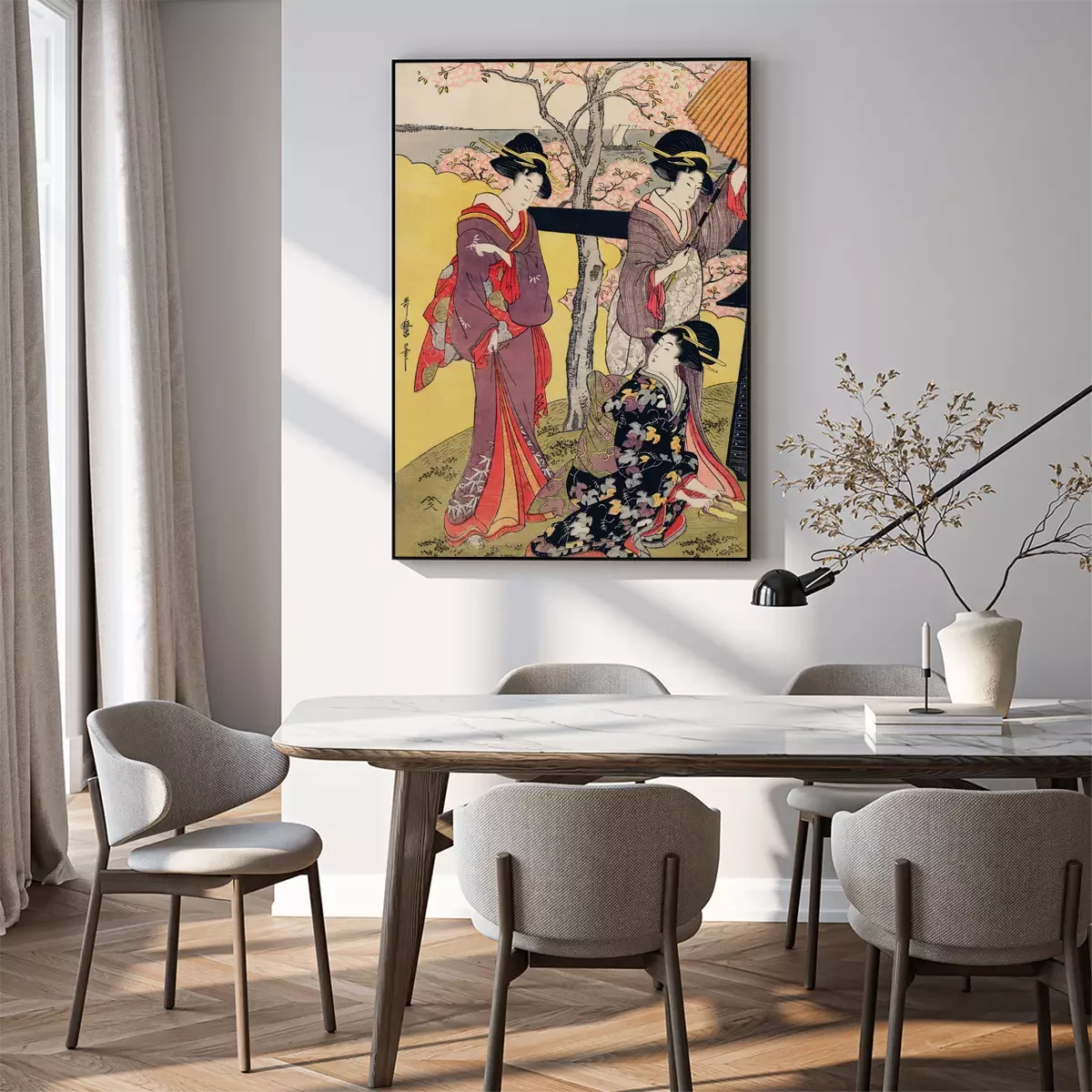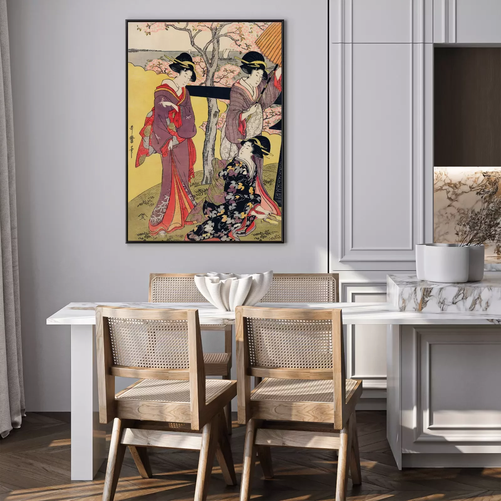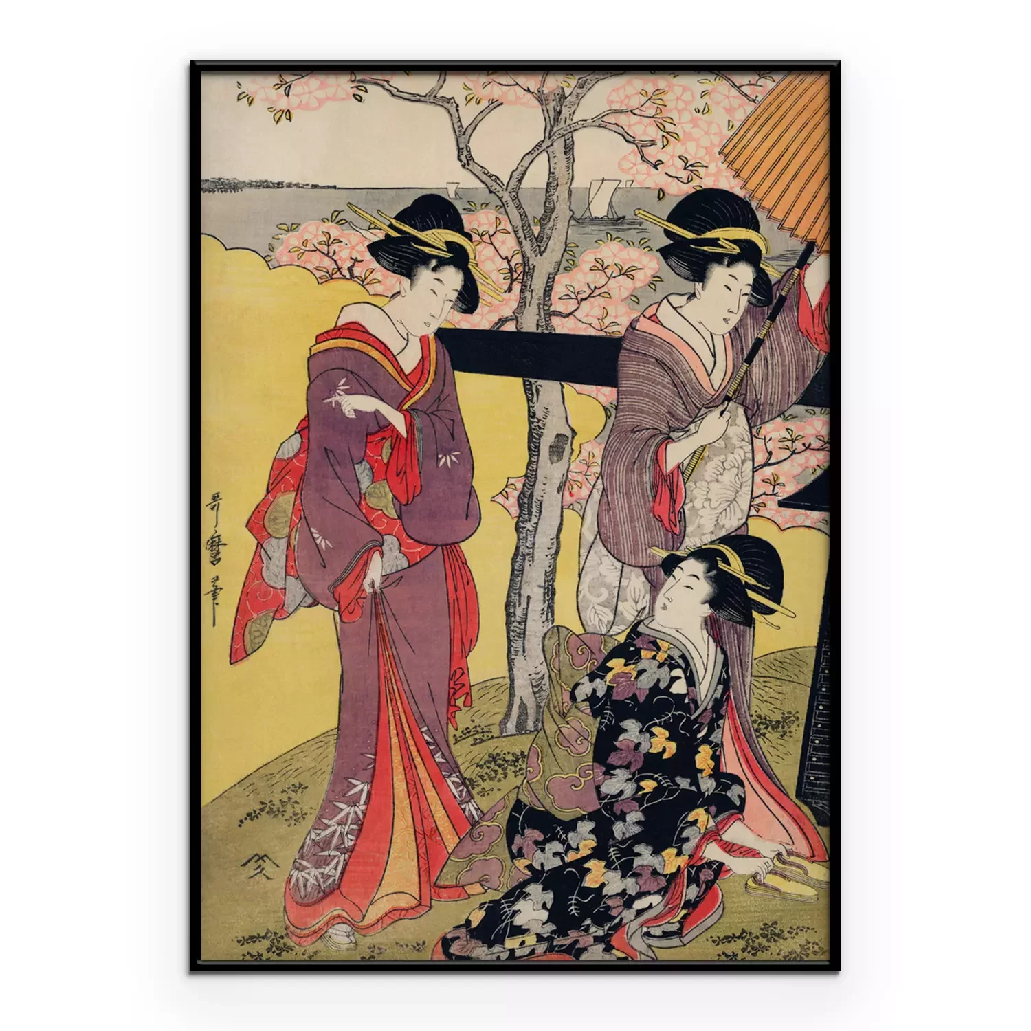 Poster: Landschap met Japanse kersenbloesem en vrouwen