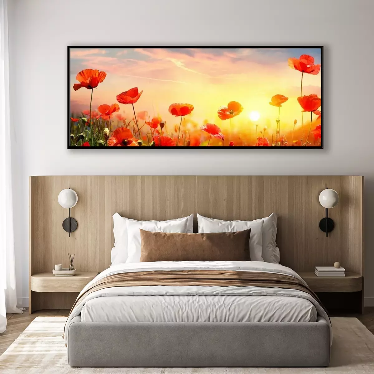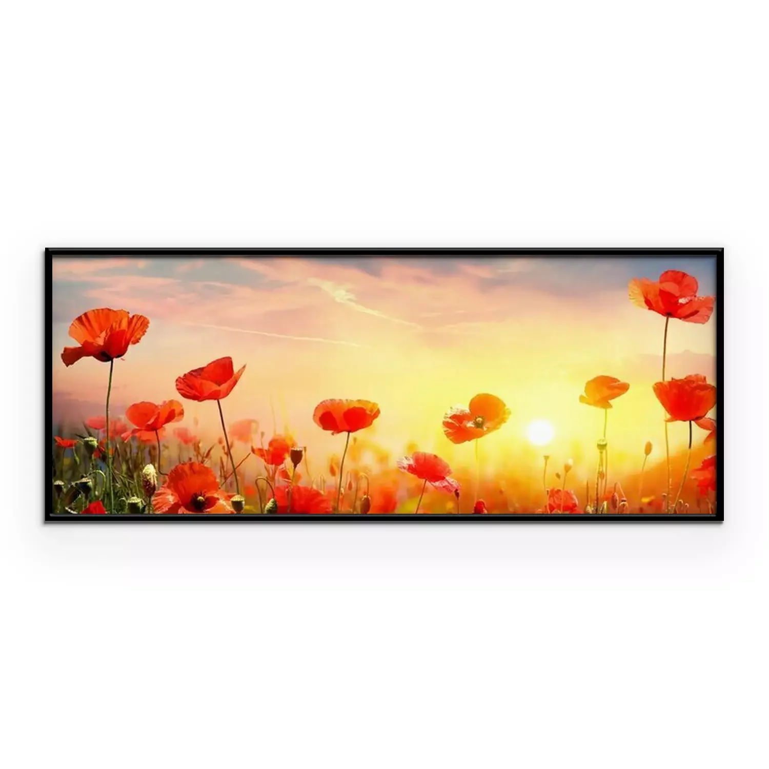 Poster: Landschap met klaprozen bij zonsondergang