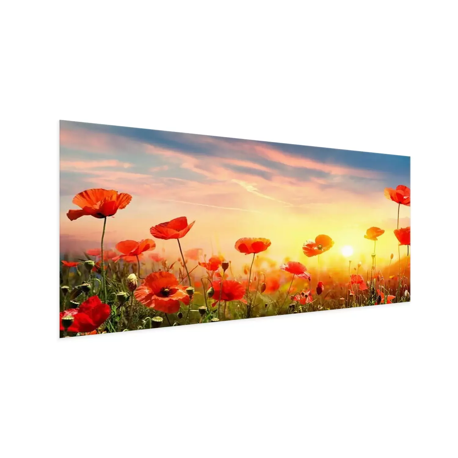 Poster Landschap met klaprozen bij zonsondergang