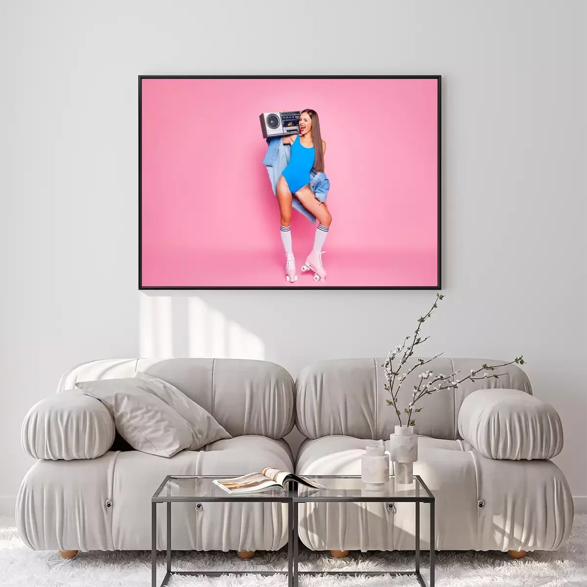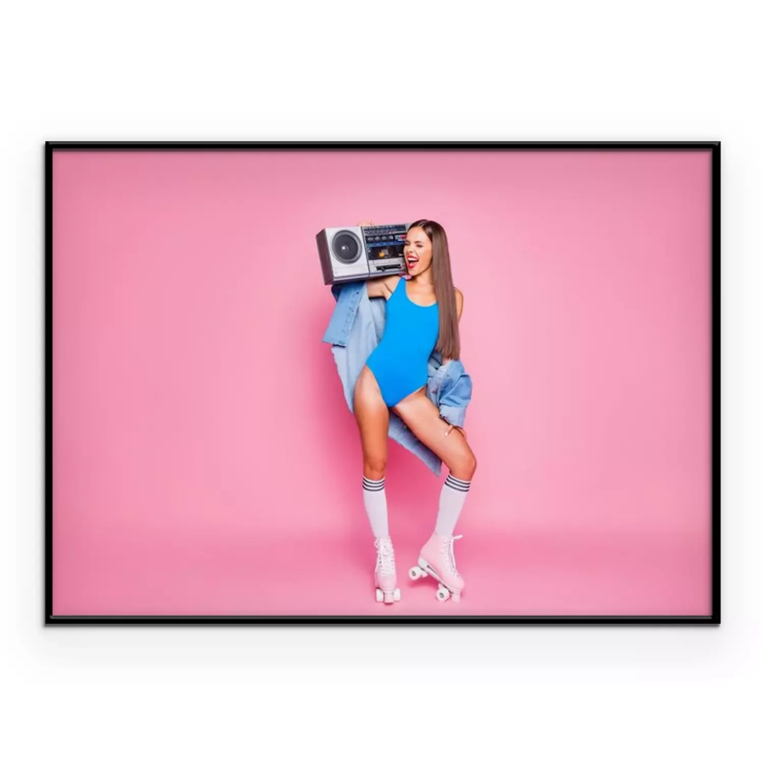 Poster: Laten we lawaai maken! Swag mensen persoon vrijetijdsbesteding hobby melodie meloman concept. De volledige foto van de lengtelichaamsgrootte van mooie opgewekte gekke blije de bandradio van de meisjes