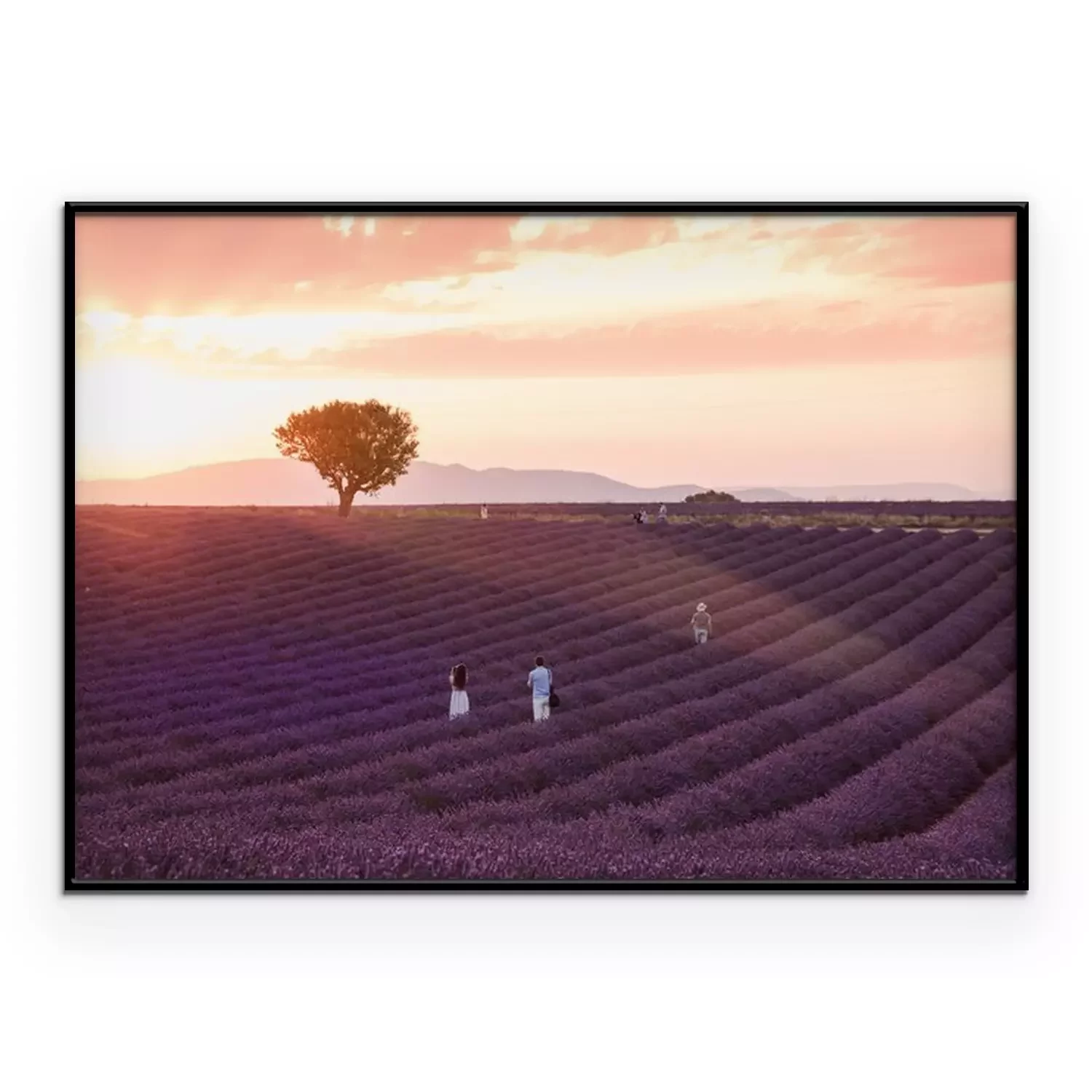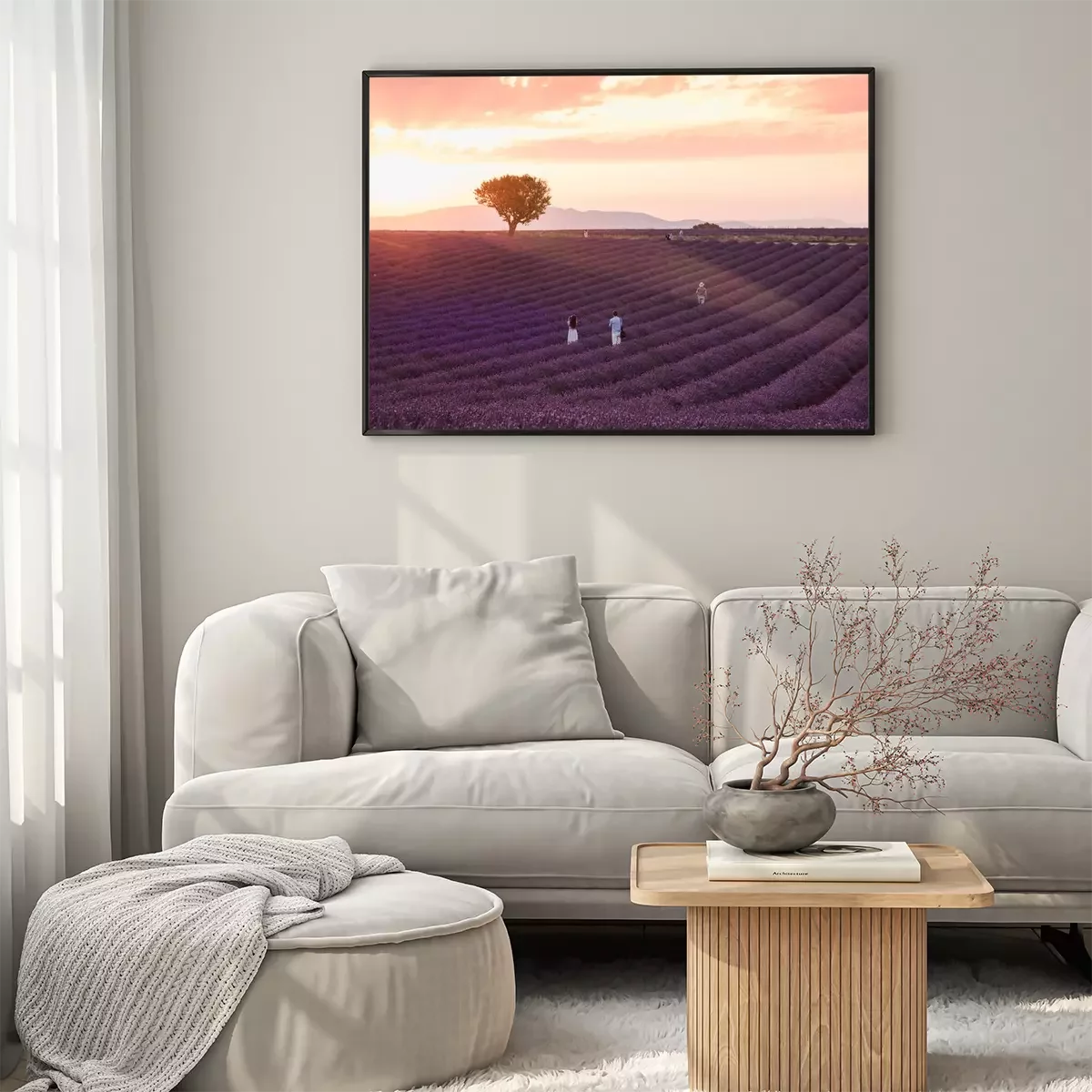 Poster: Lavender rows lines at sunset, Provence fields landscape, France.