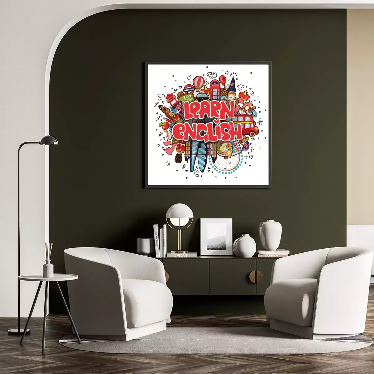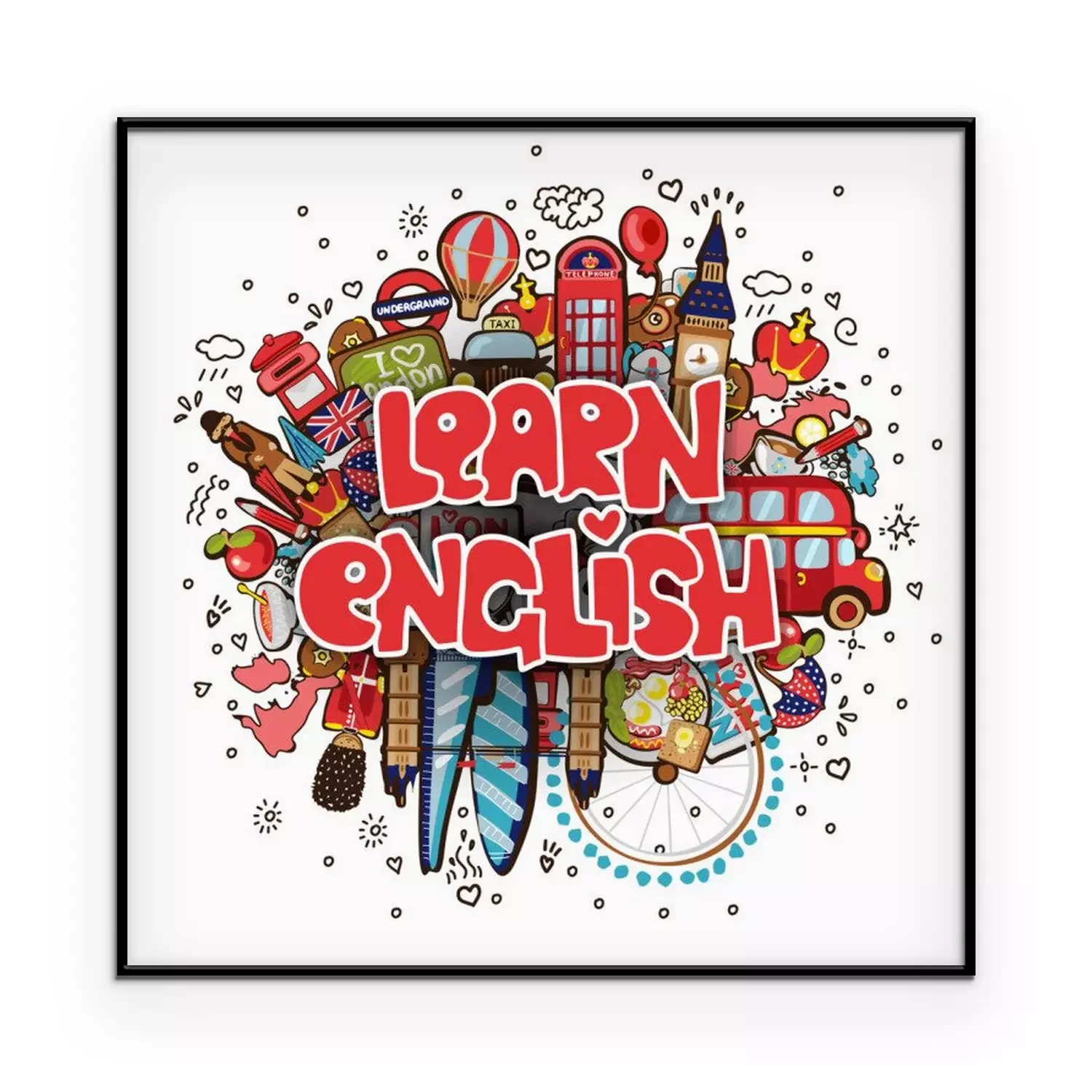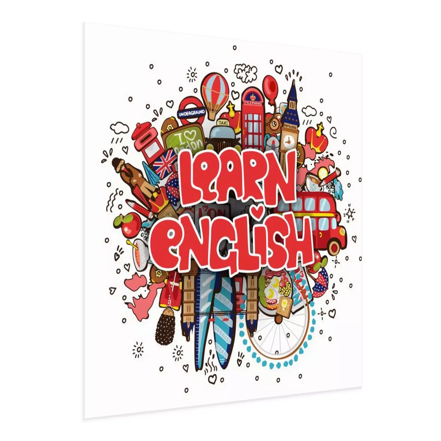 Poster: Leer Engels onderwijs en reizen concept. Het leren van Engelse vector cartoon illustratie. Set van Fun cartooning objecten met zin over Engels leren - Concept van Engelse taalcursussen met