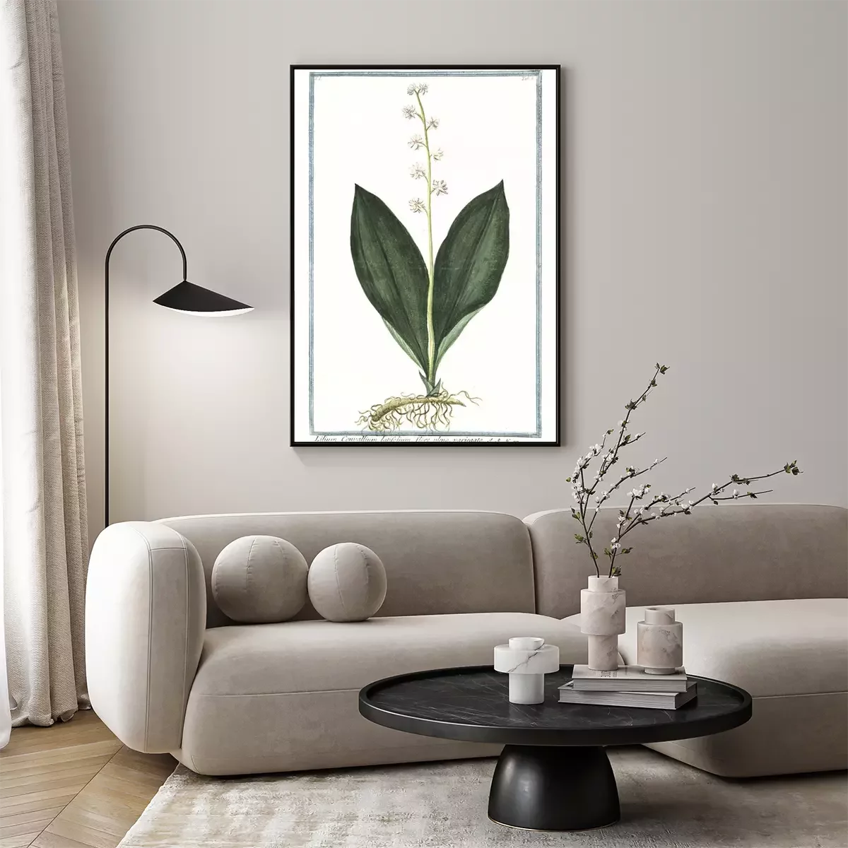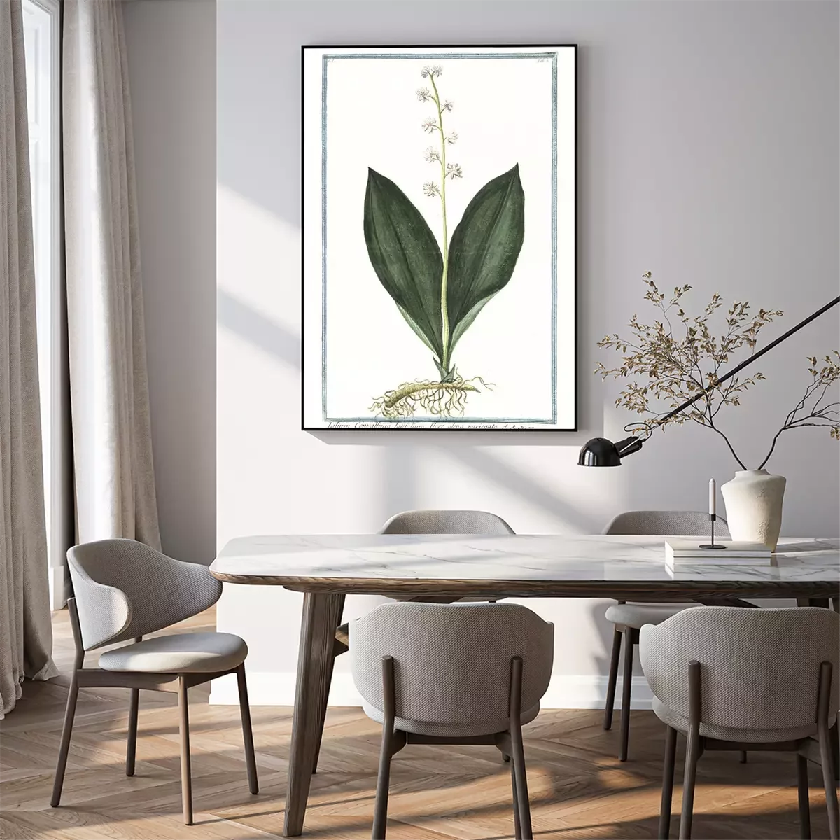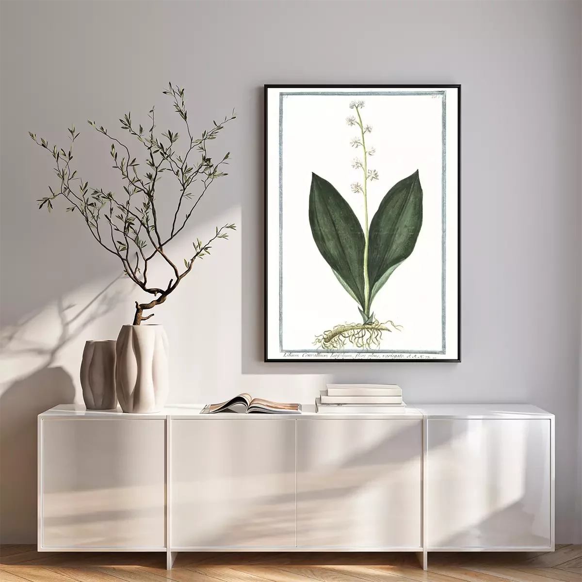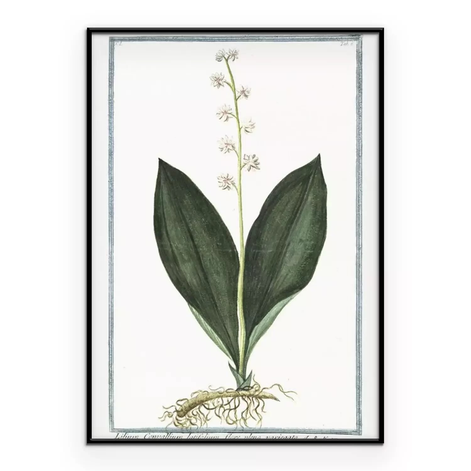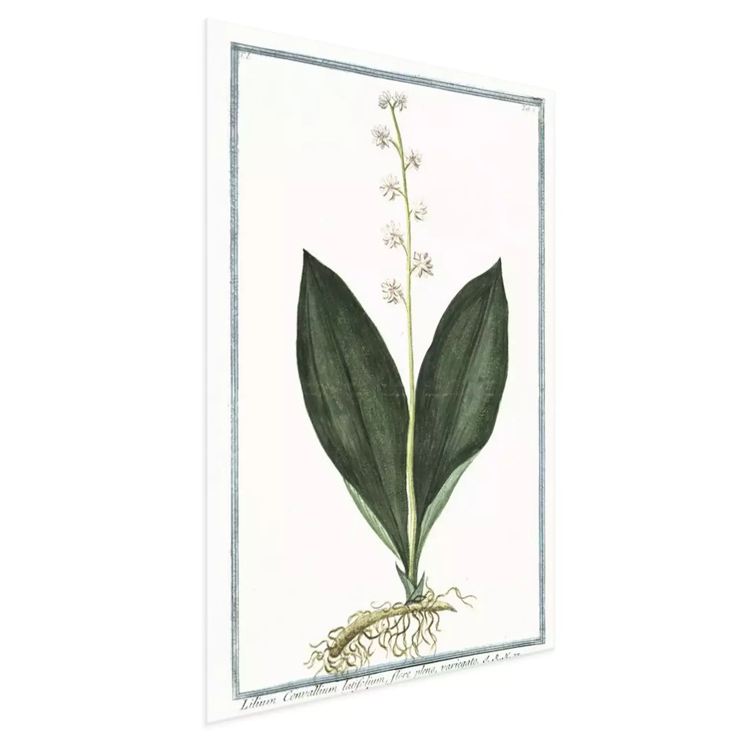 Poster: Lelietje-van-dalen witte botanische illustratie in een kader