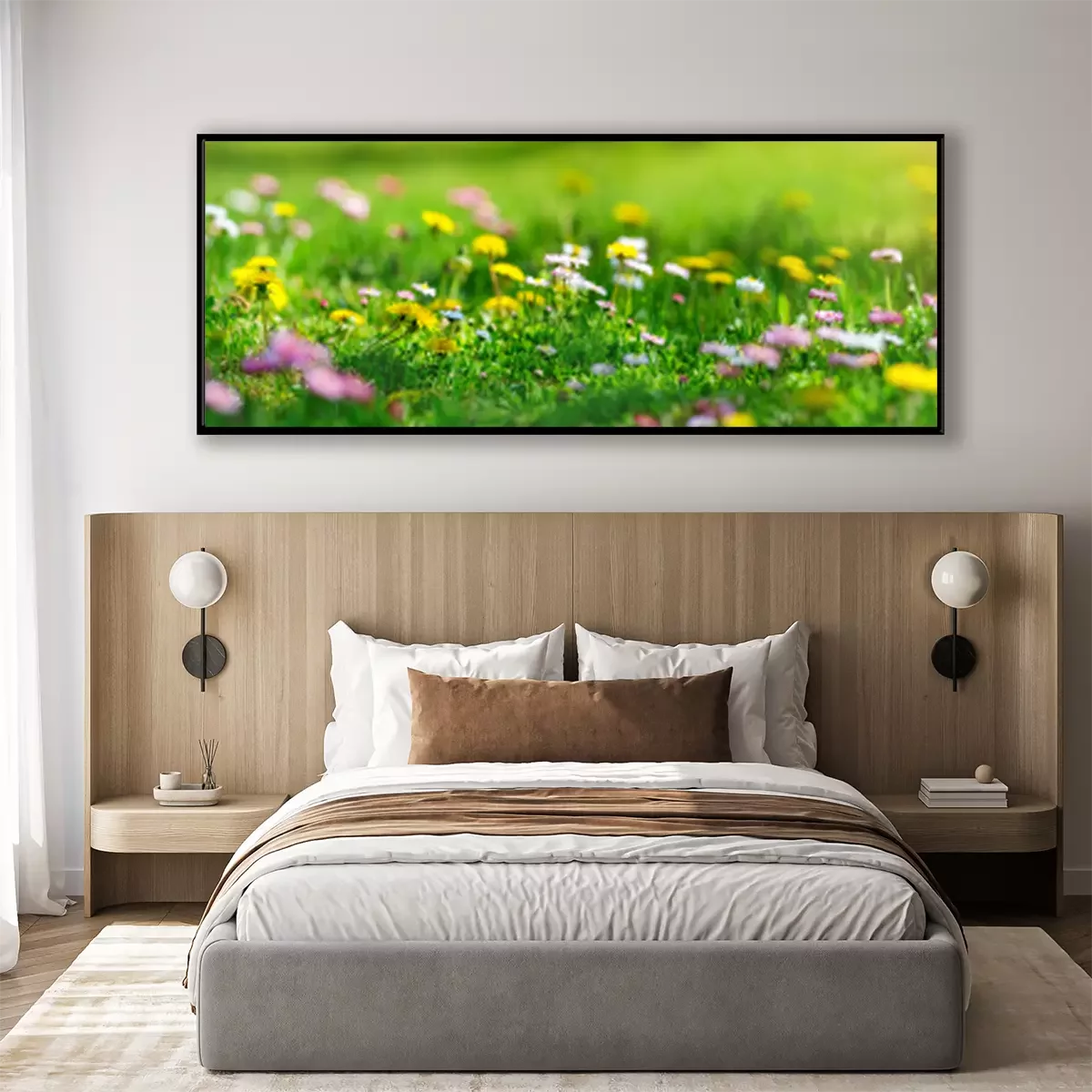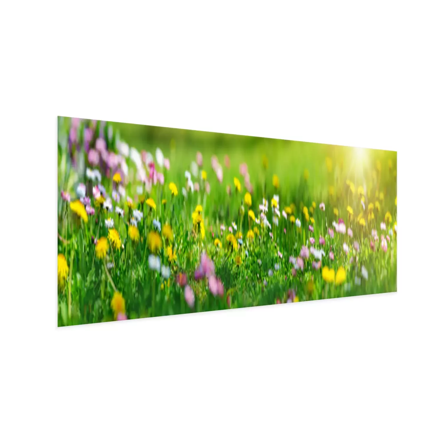 Meadow with lots of white and pink spring daisy flowers and yellow dandelions in sunny day