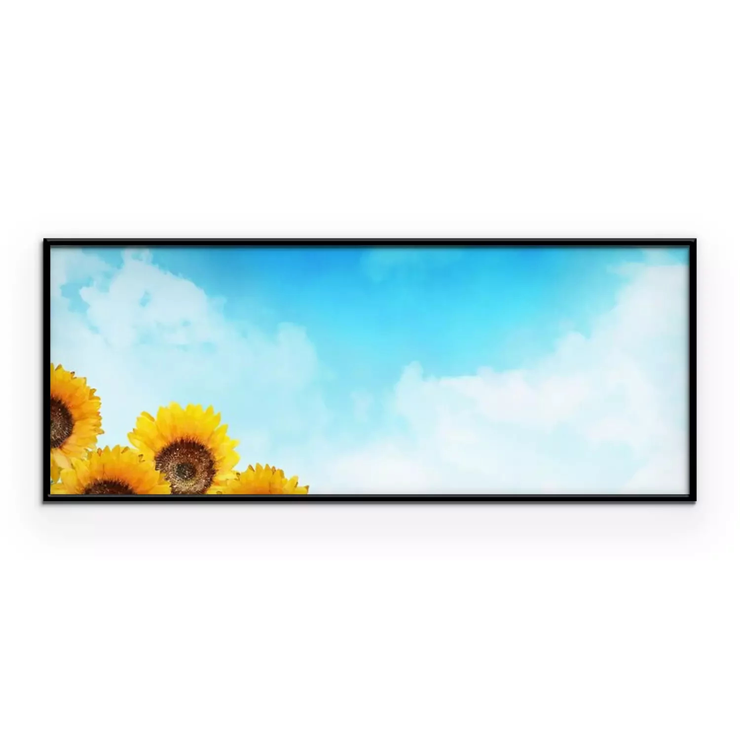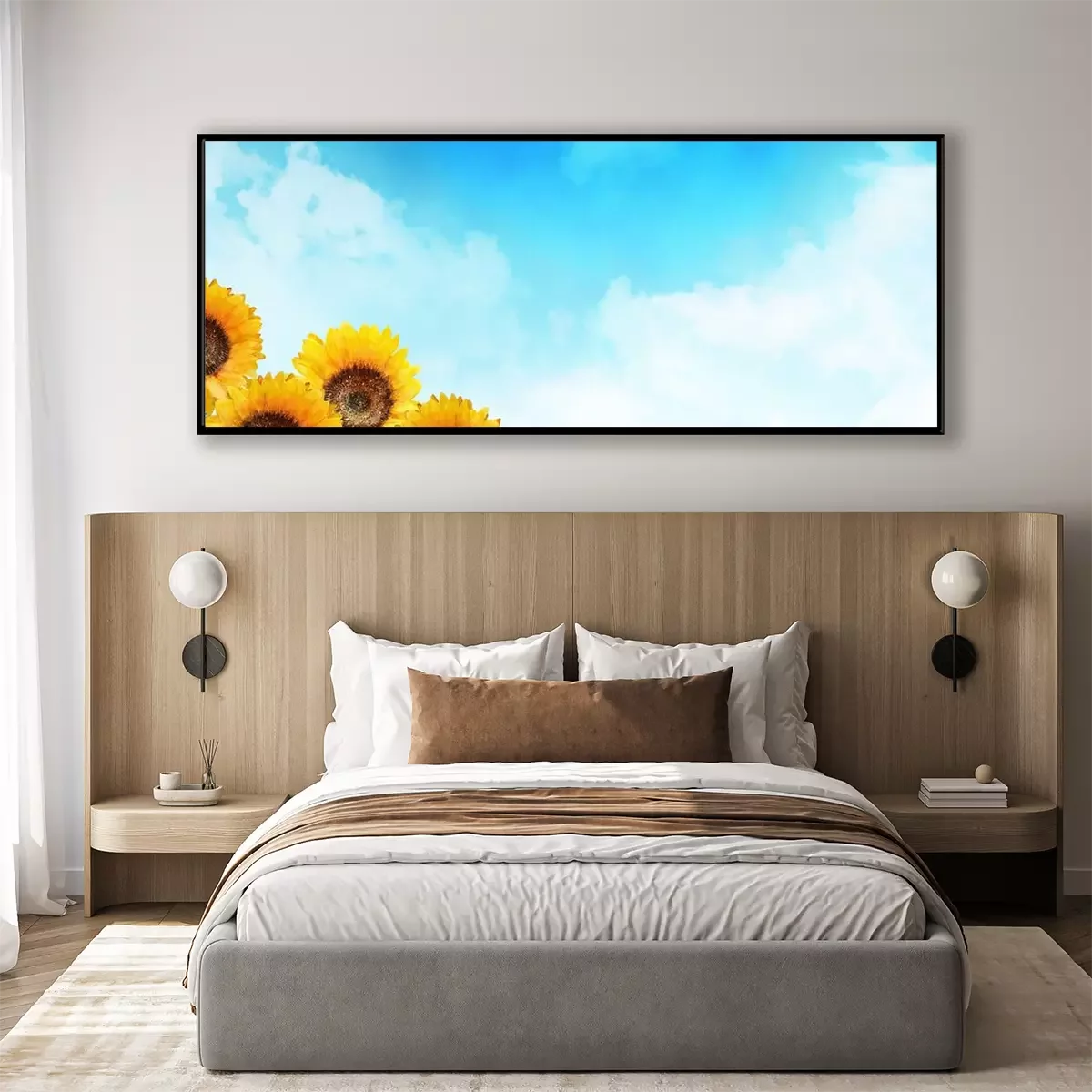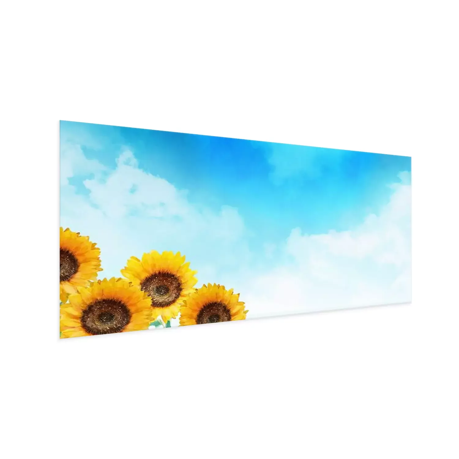 Poster: Levendige zonnebloemen en lucht bedekt met zomerwolken