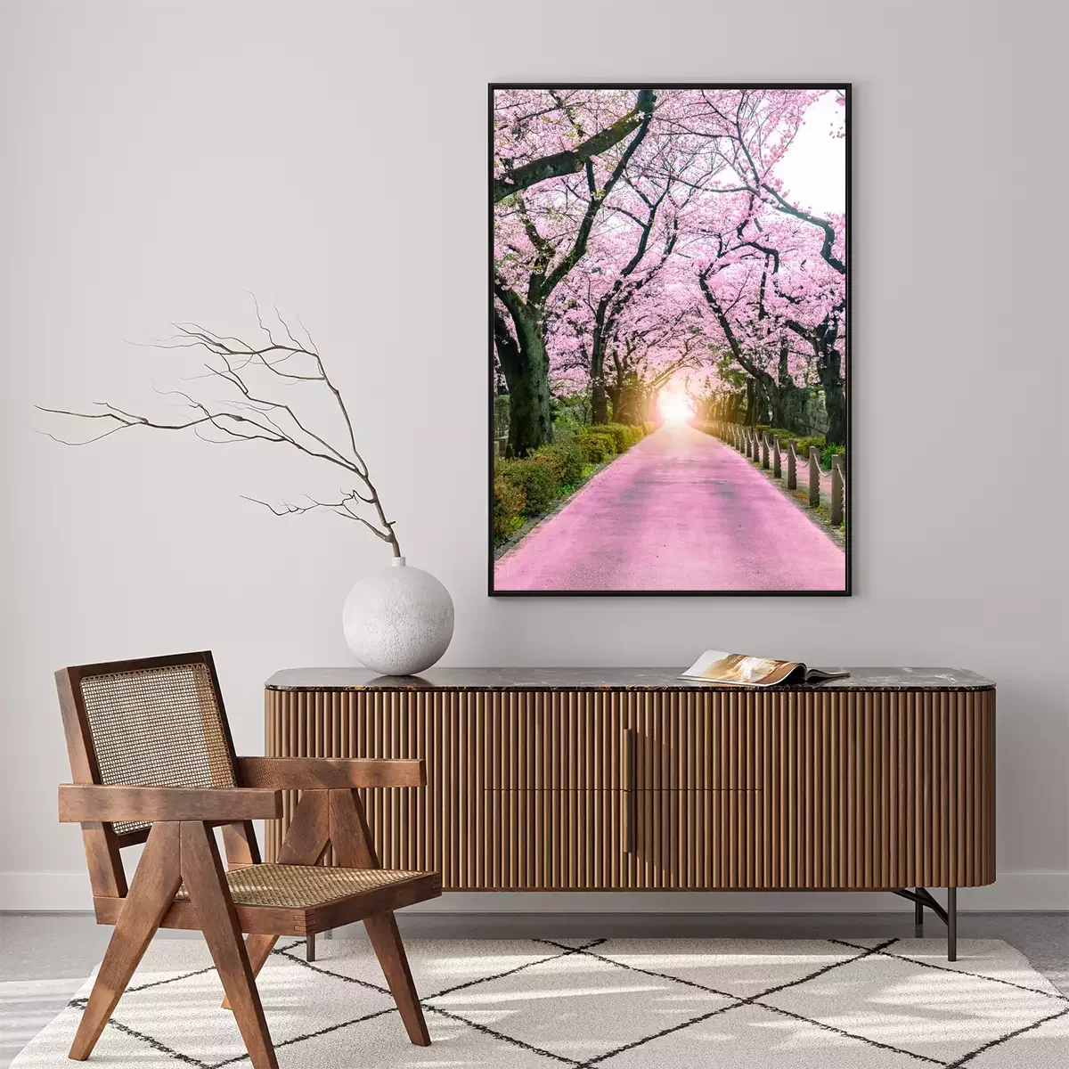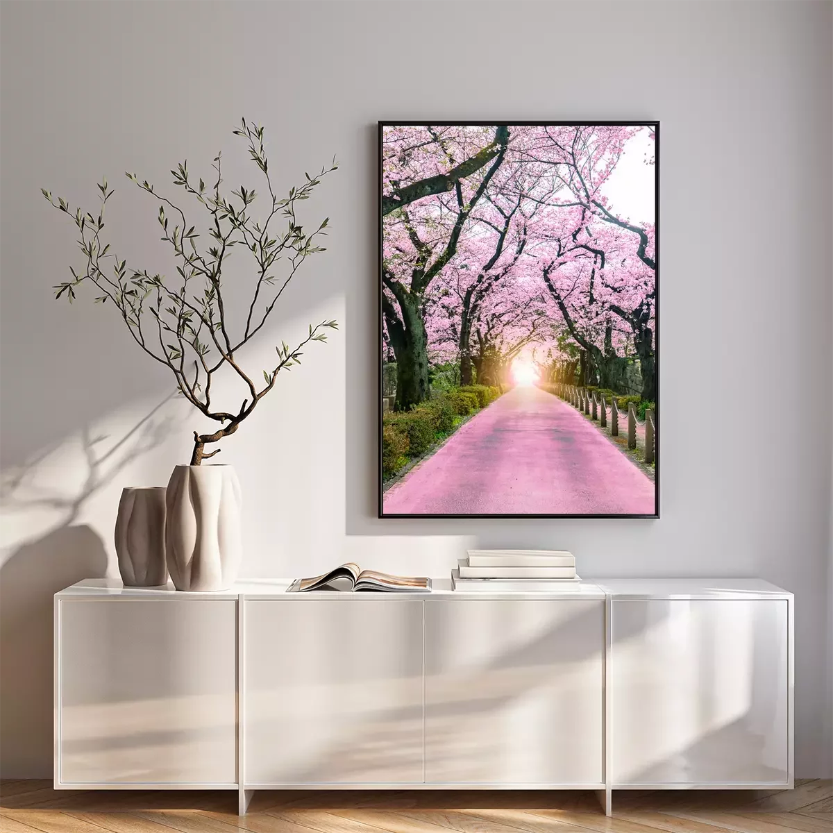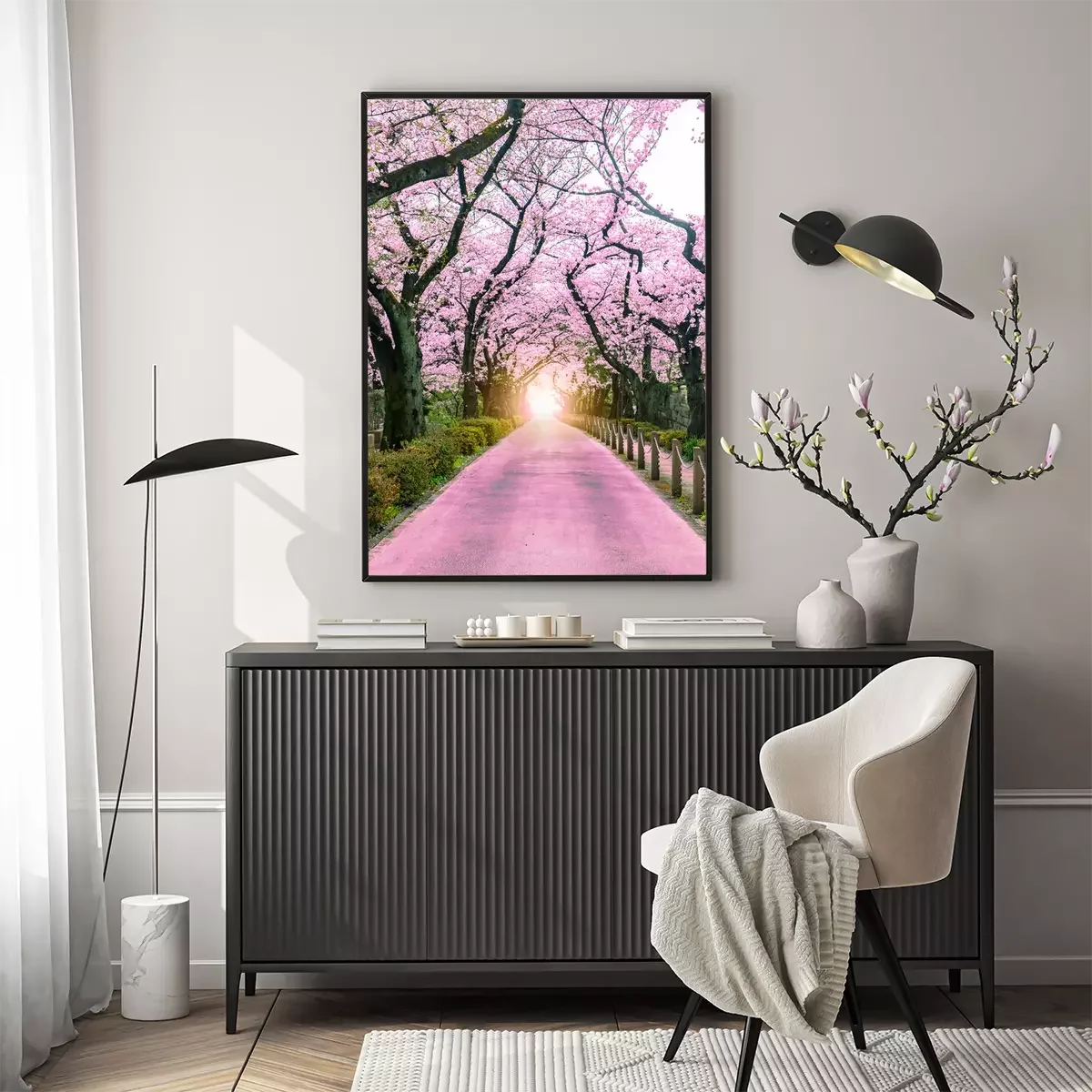 Poster: Lighting at the destination Walking path under the beautiful sakura tree or cherry tree tunnel in Tokyo, Japan