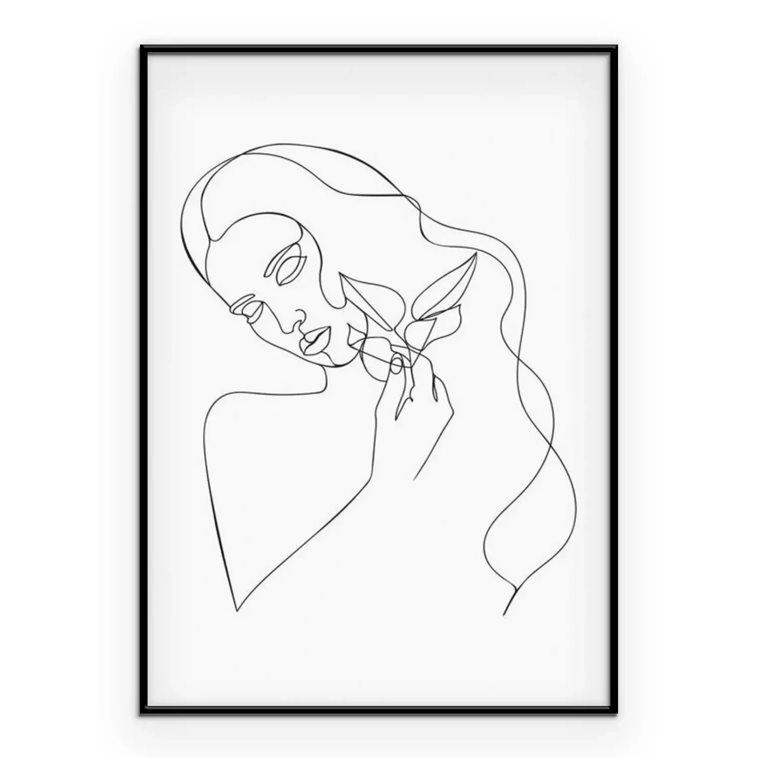 Poster: Lijntekeningen van een vrouw die bladeren vasthoudt