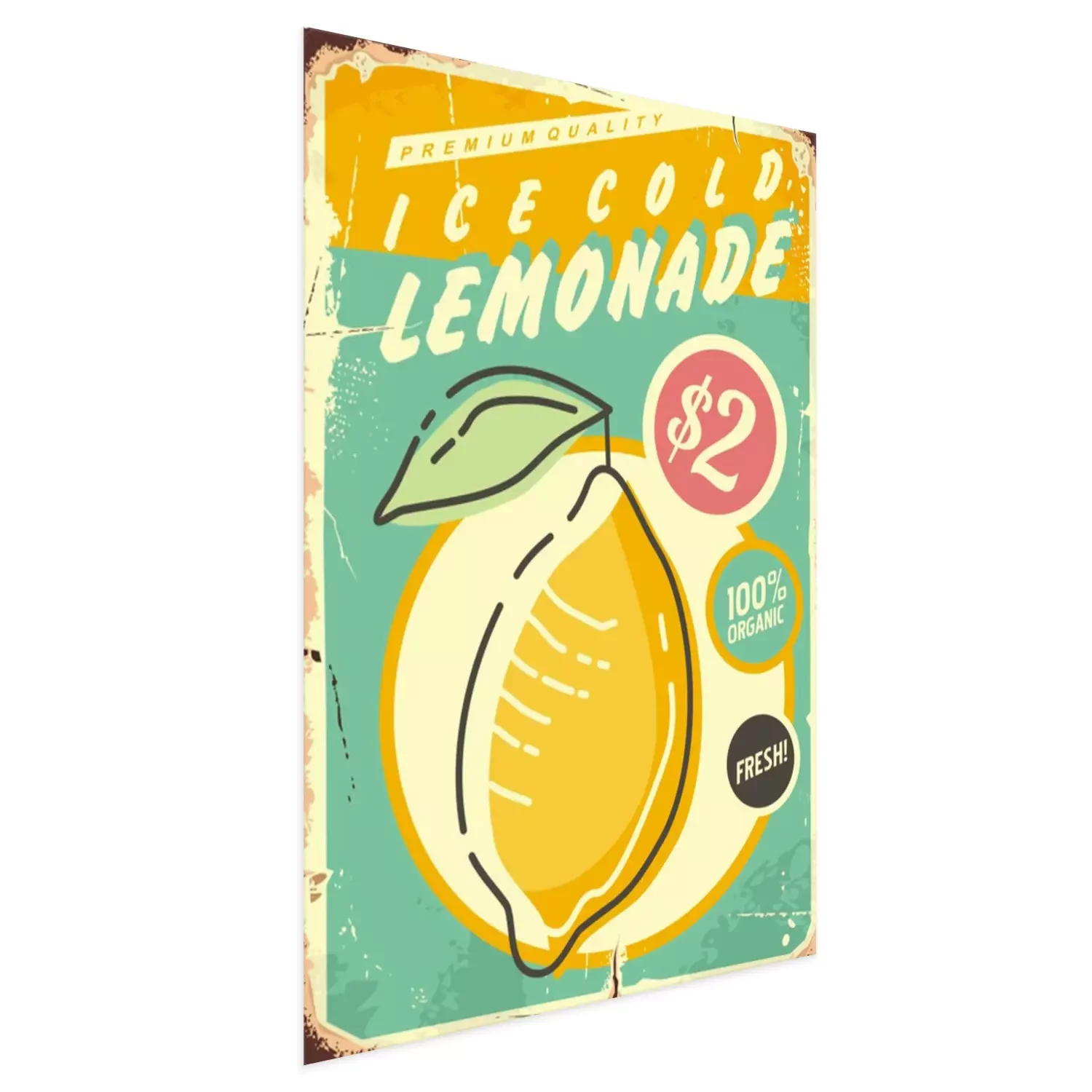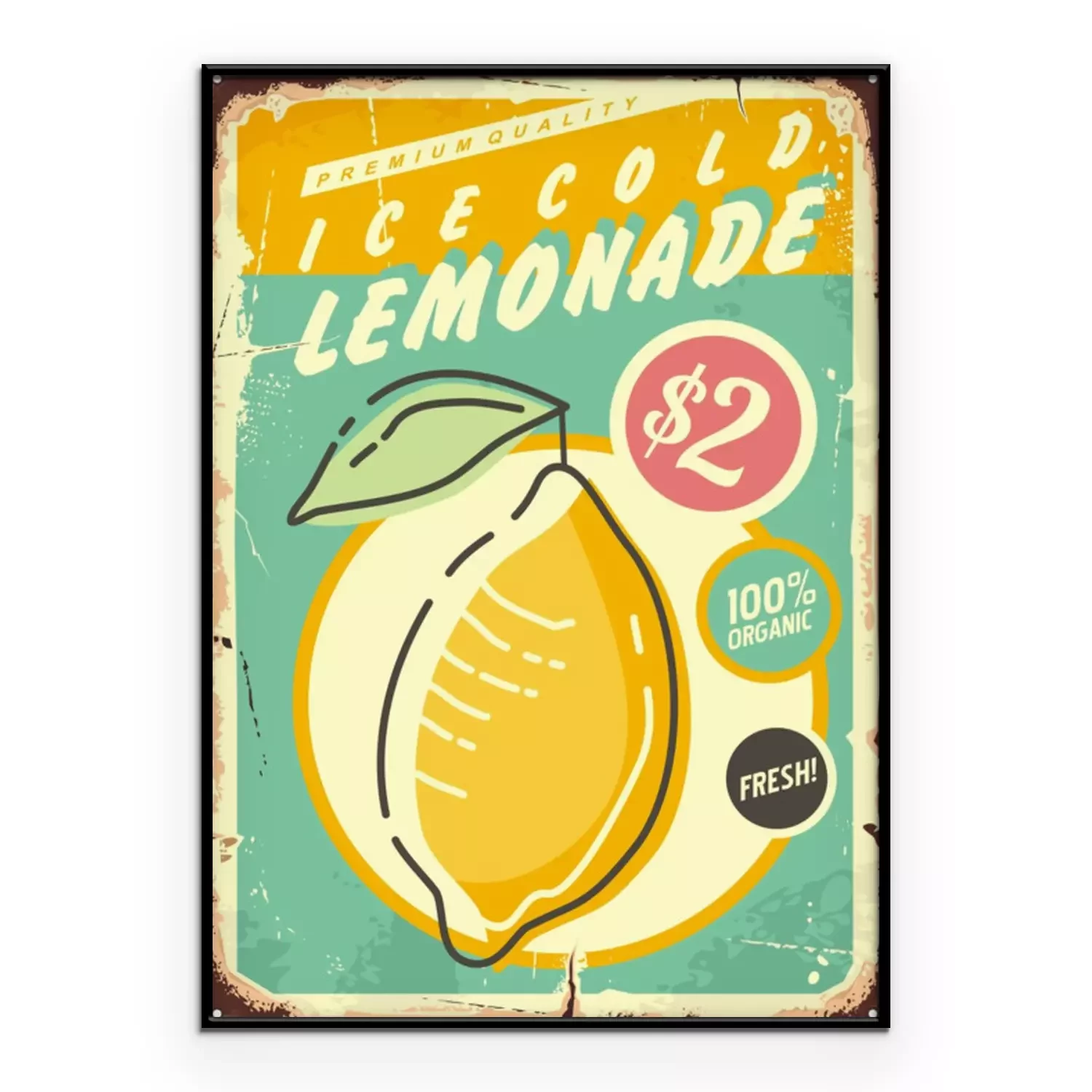 Poster: Limonade promotie retro posterontwerp met vers en sappig citroenfruit. Vintage blikje voor ijskoude limonade.