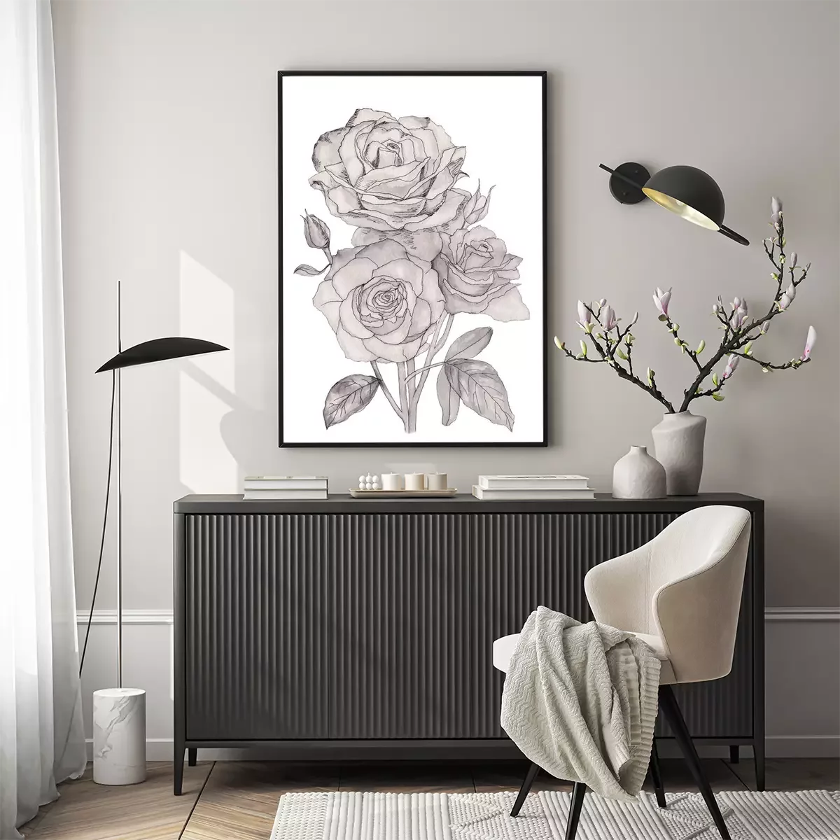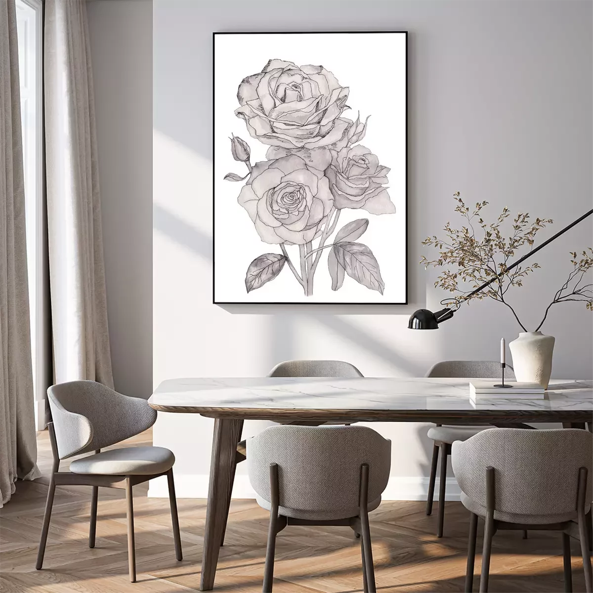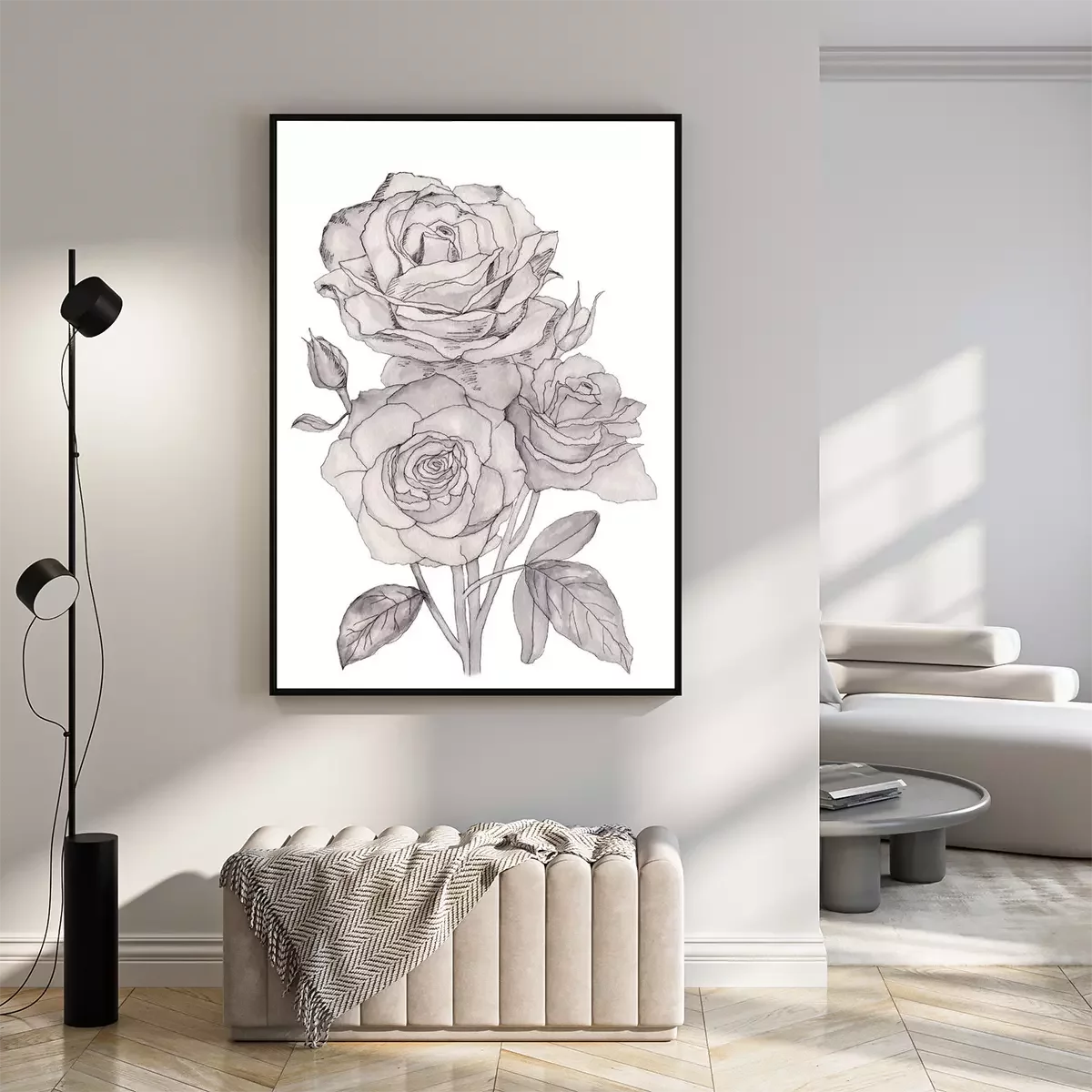 Poster: Line art rozen gevuld met grijs