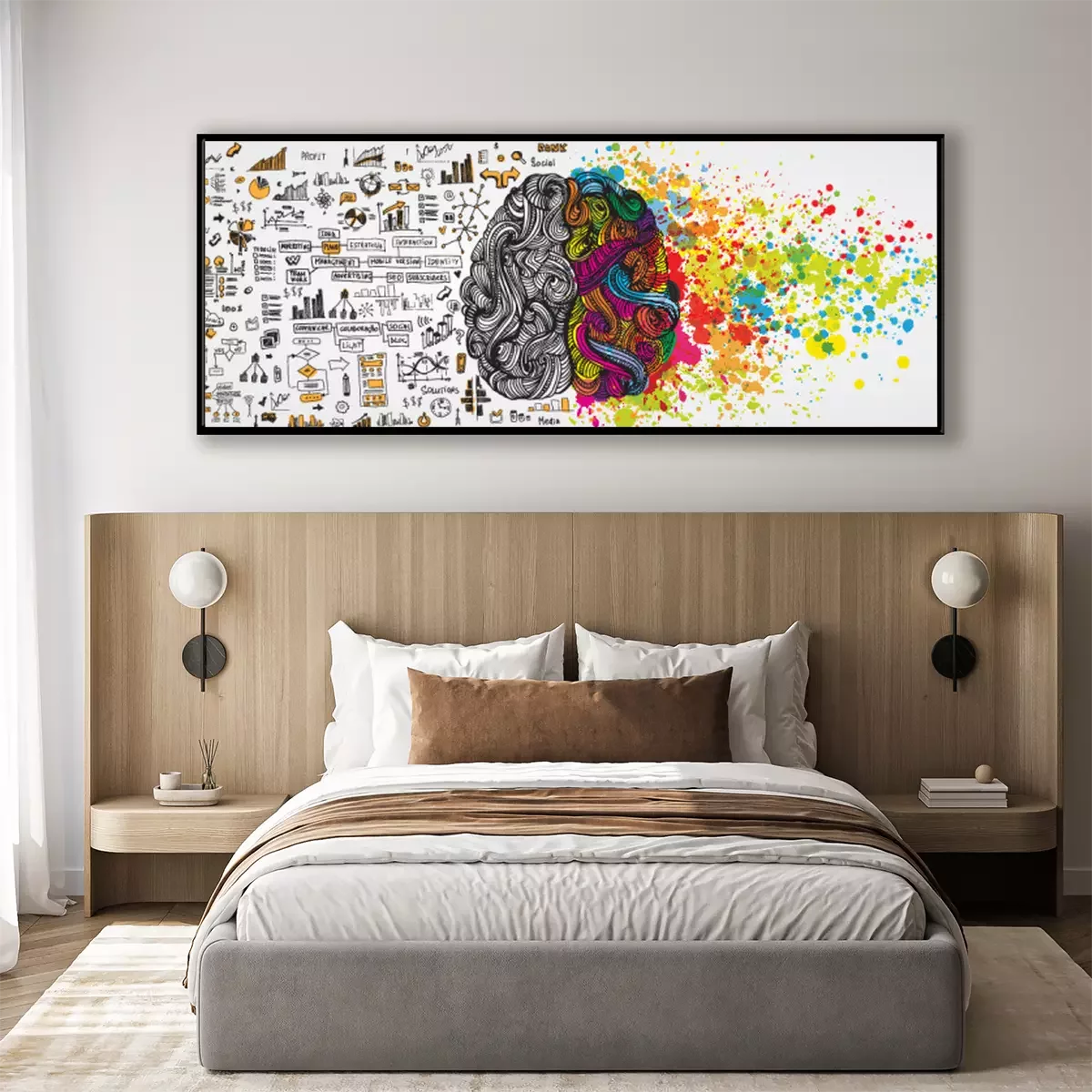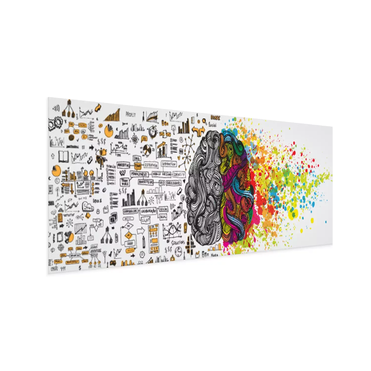Poster: Links en rechts menselijk brein met sociaal infografisch op logische kant. Creatieve halve en logische helft van de menselijke geest. Vector illustratie aboud sociale communicatie en zakelijk werk