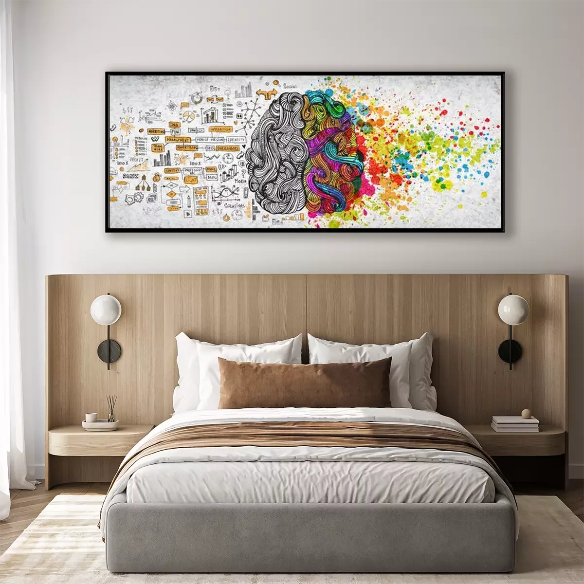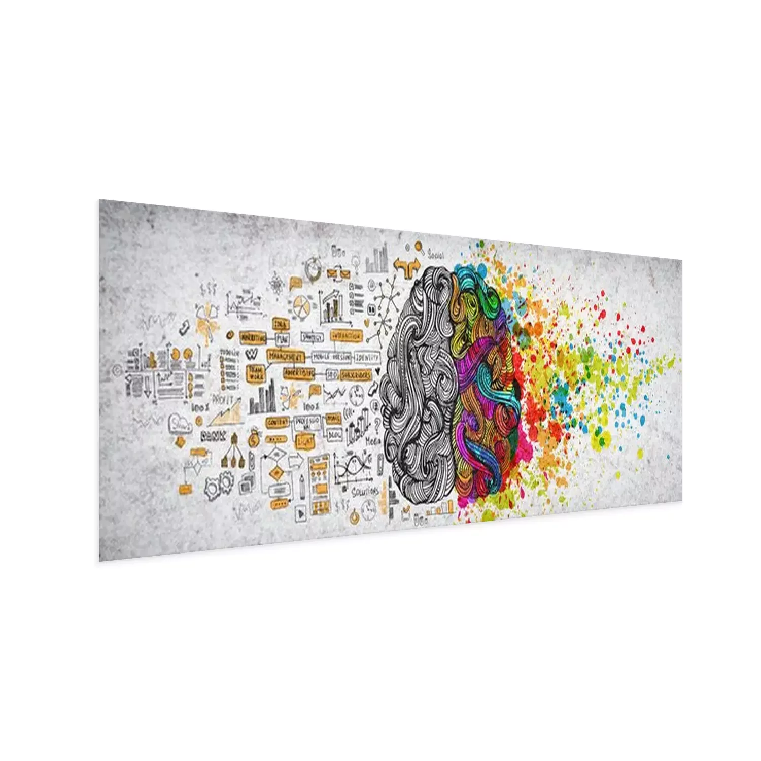 Poster: Links rechts menselijk breinconcept, geweven illustratie. Creatief linker- en rechterdeel van menselijk brein, emotionele en logische delenconcept met sociale en zakelijke doodleillustratie van linker