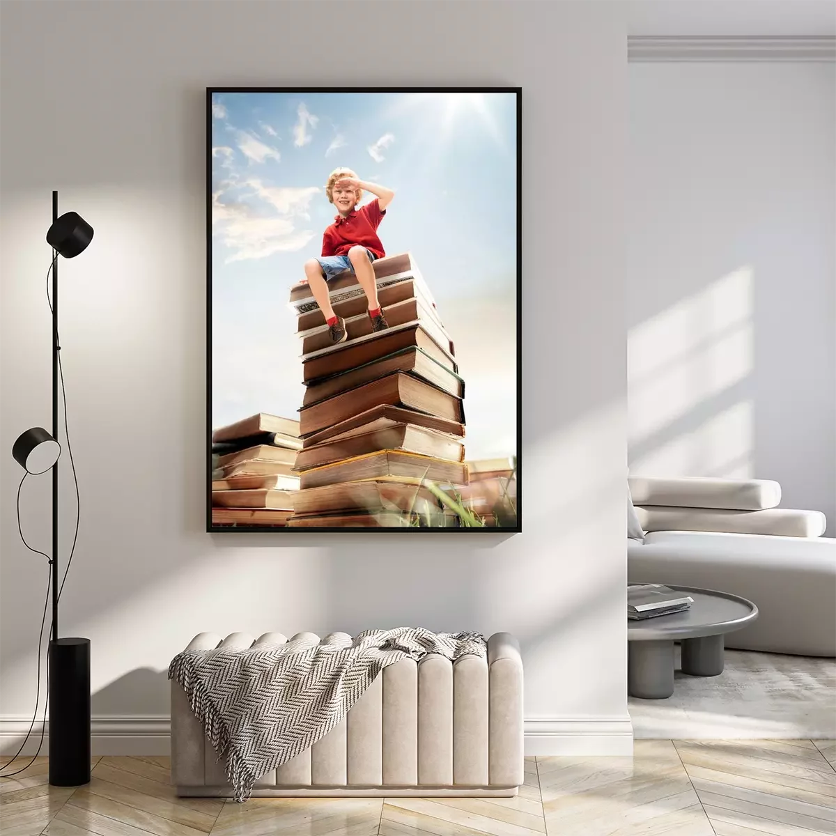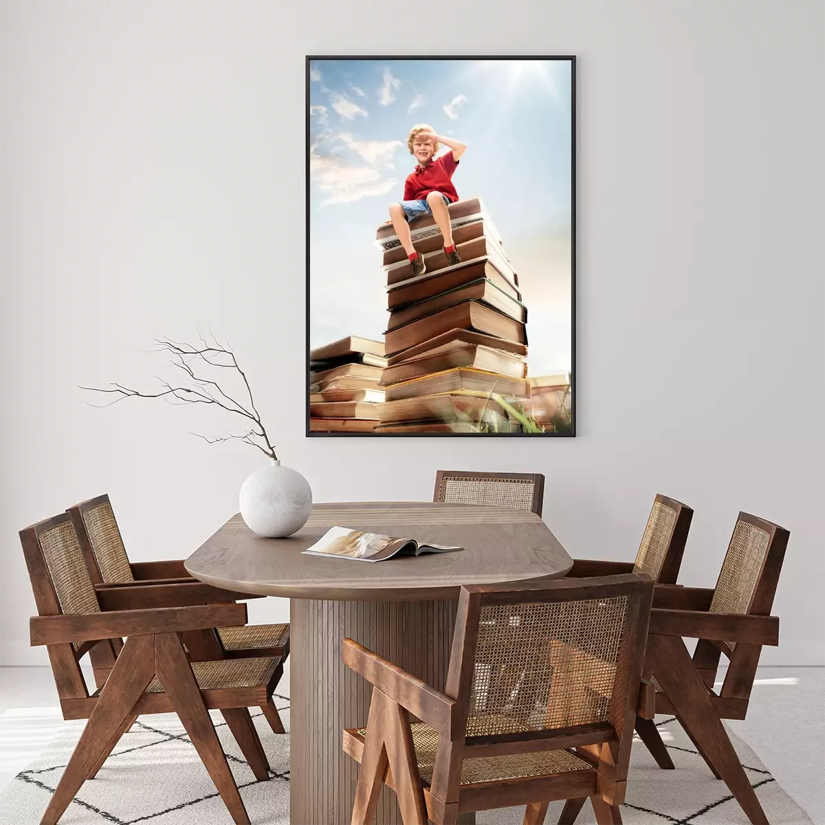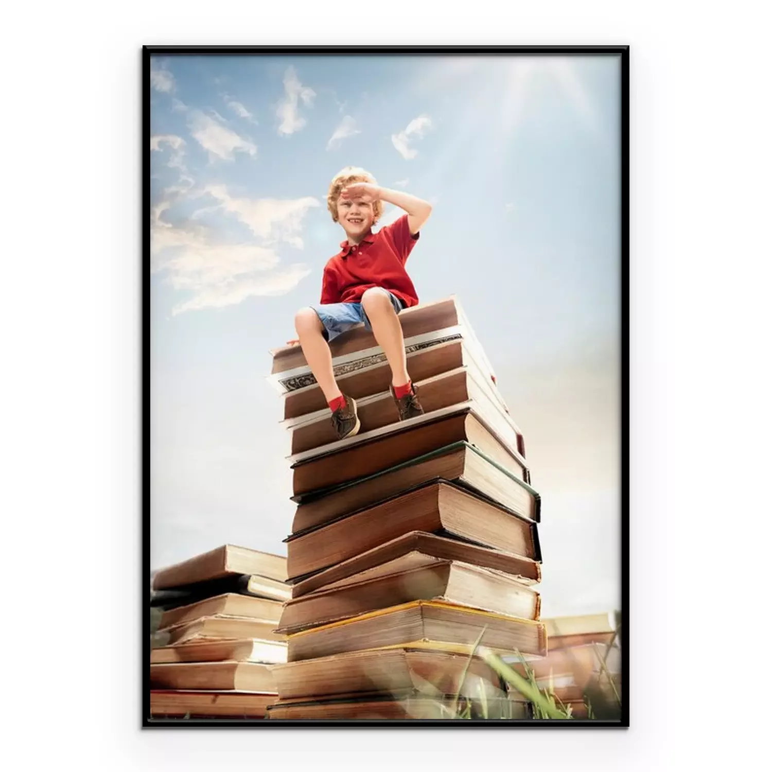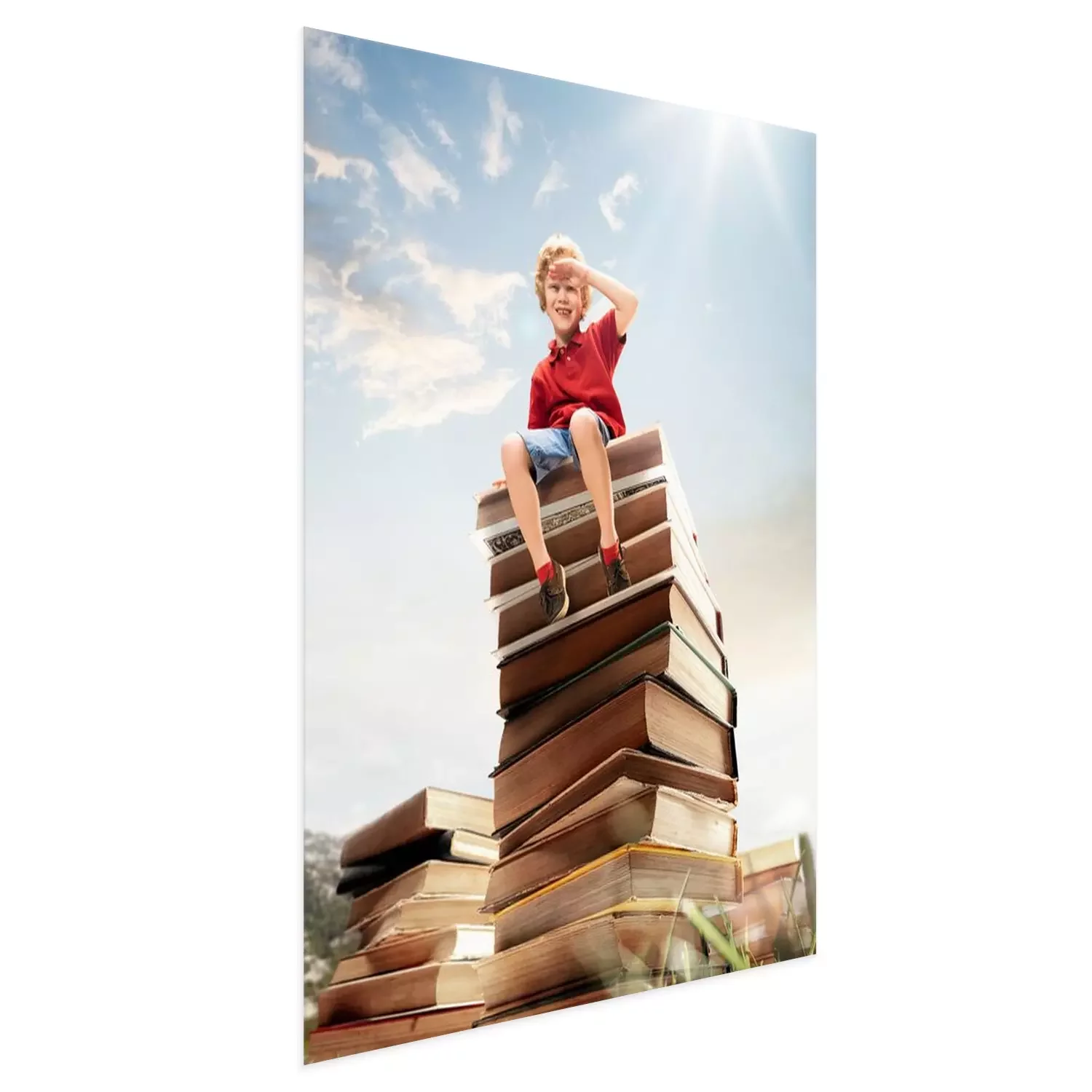 Poster: Little boy sitting on the tower made of big books. Childhood dreams, reading and education concept. Wondering world. abstract collage