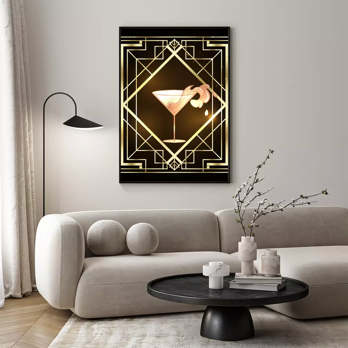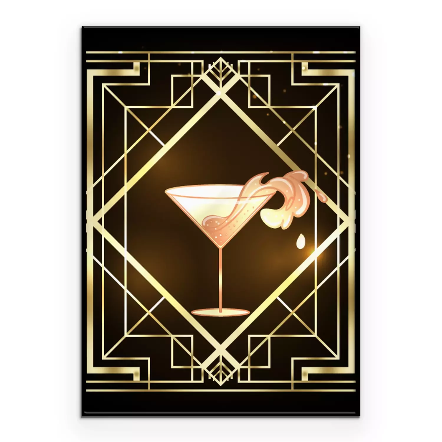 Poster Little party never killed nobody. Female hand holding cocktail glass with splash. Art deco 1920s style vintage invitation template design for drink list, bar menu, glamour event, thematic wedding.