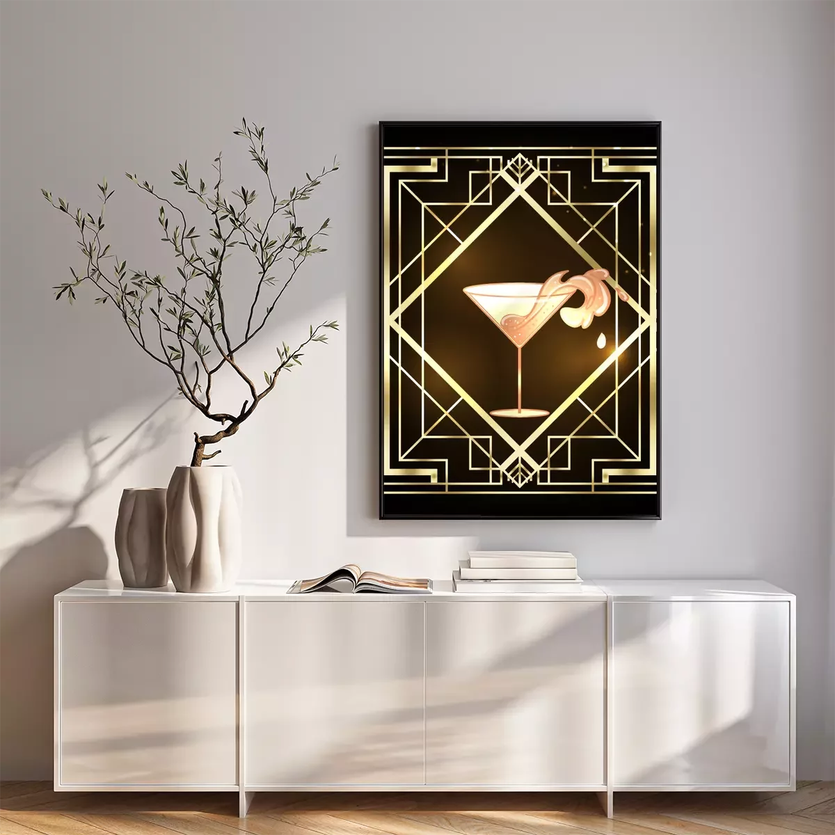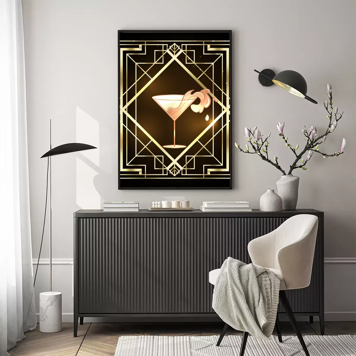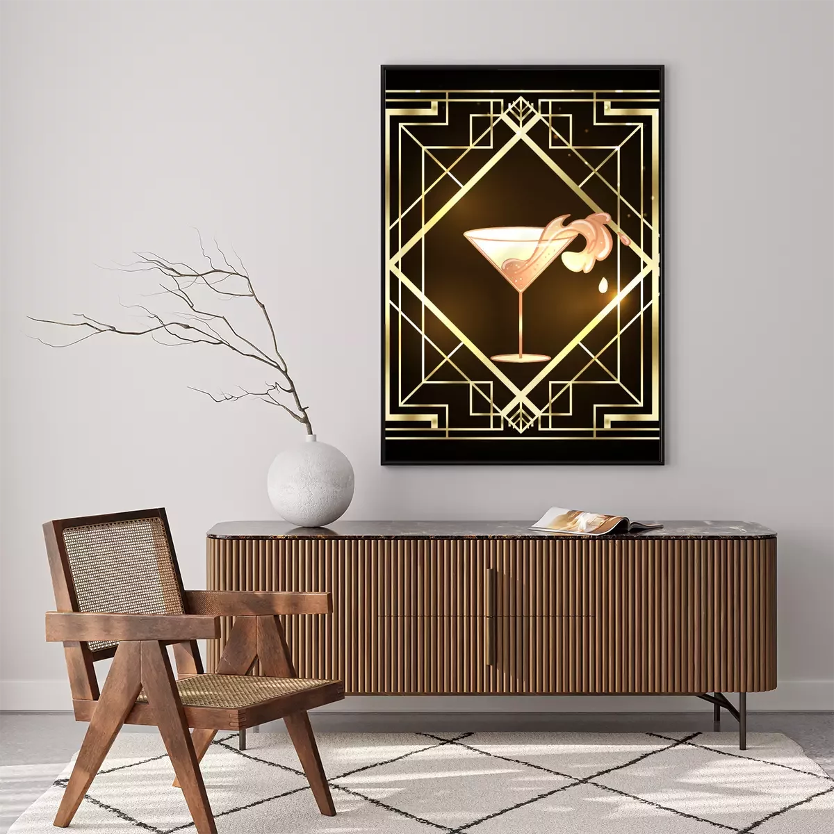 Female hand holding cocktail glass with splash. Art deco (1920's style) vintage invitation template design for drink list, bar menu, glamour event, thematic wedding, jazz party flyer.