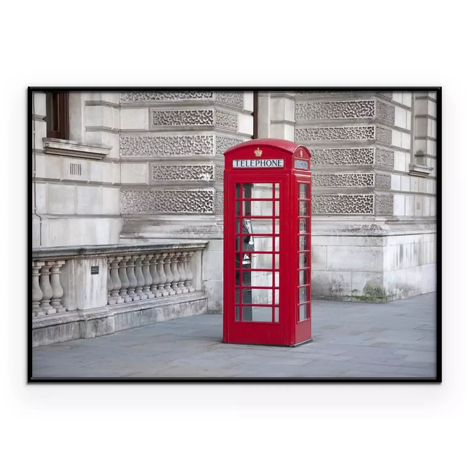 Poster Londense telefooncel op de achtergrond van het gebouw
