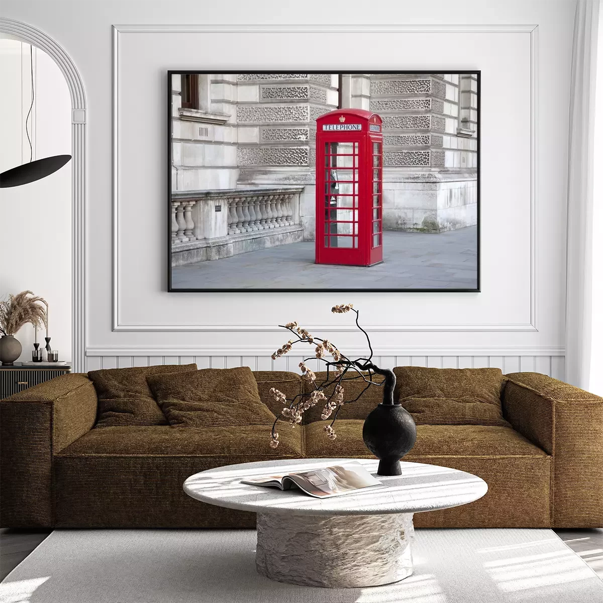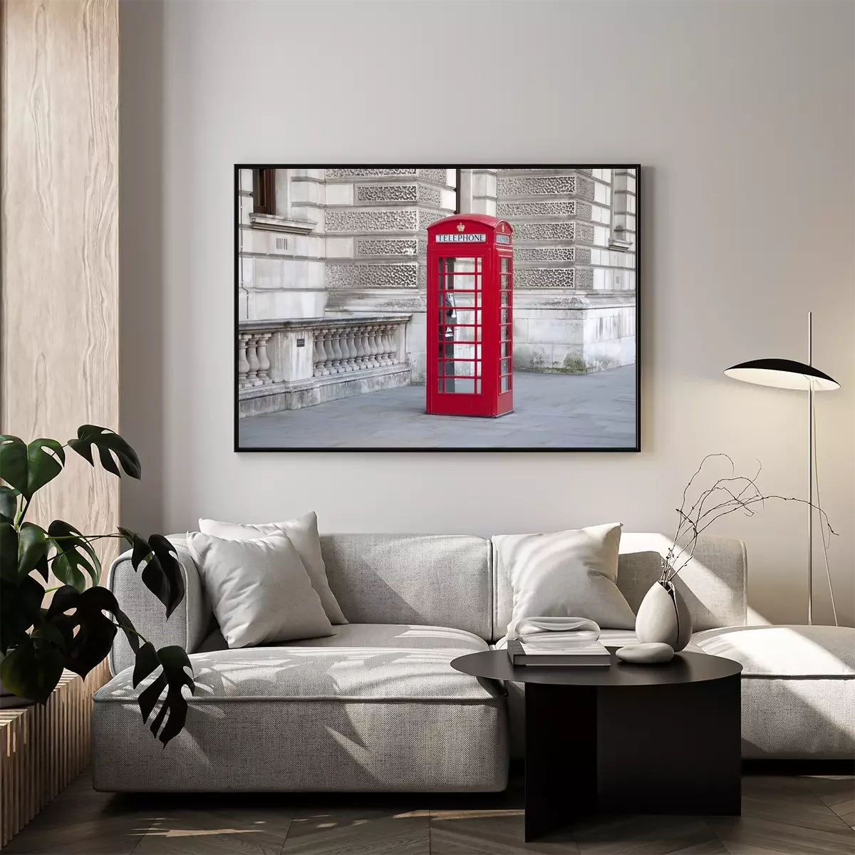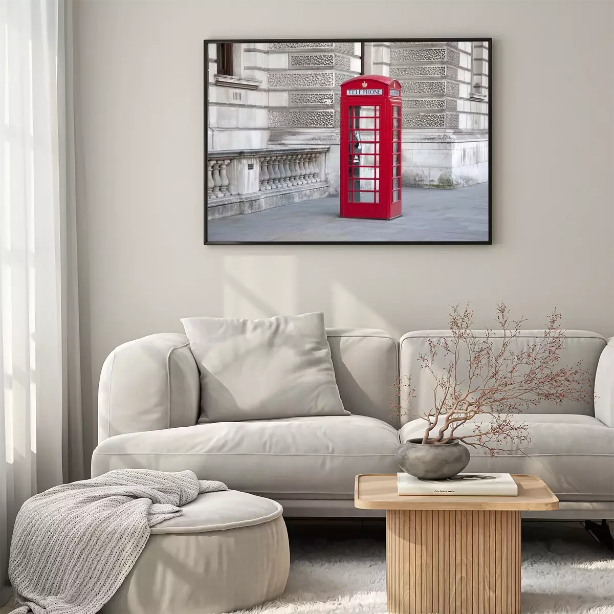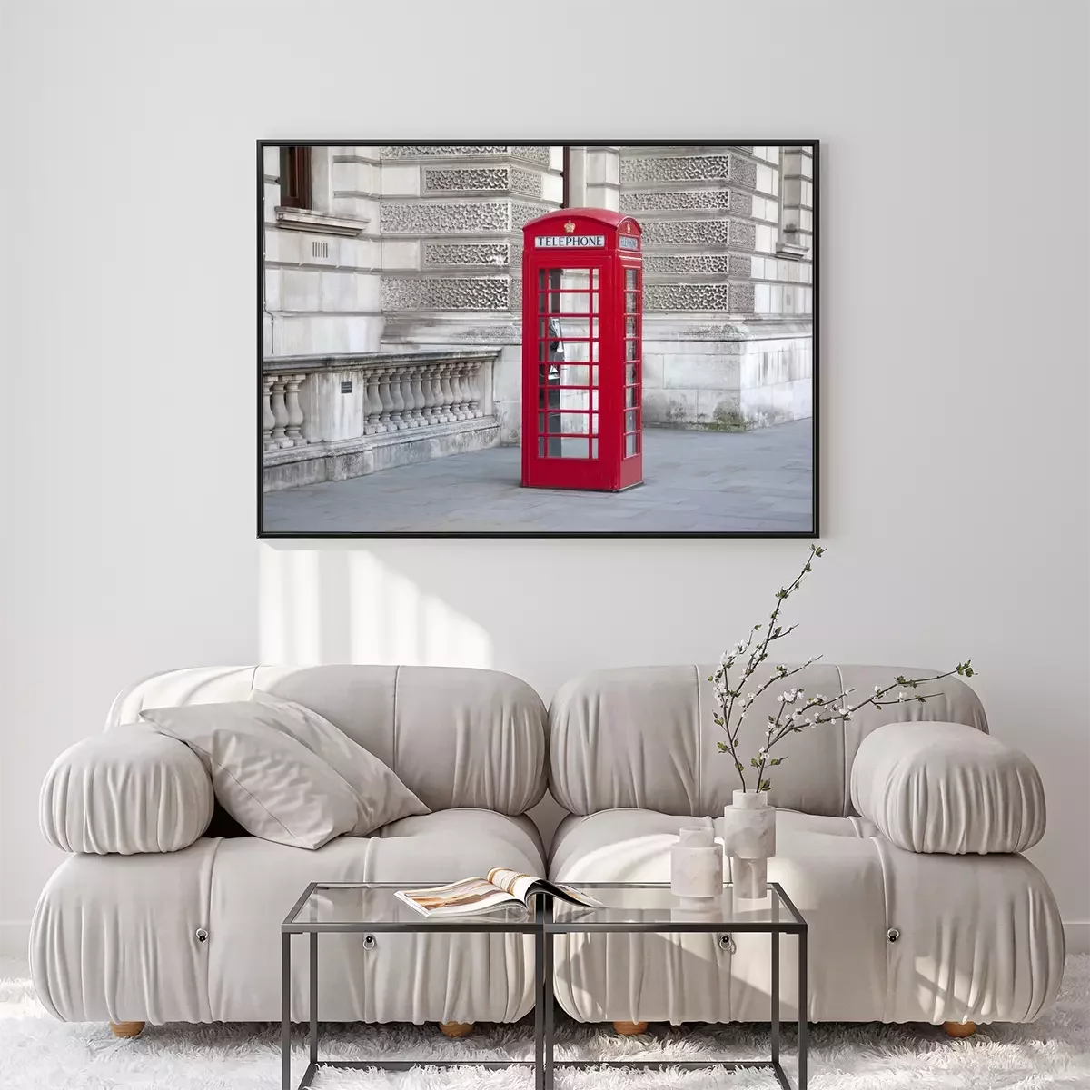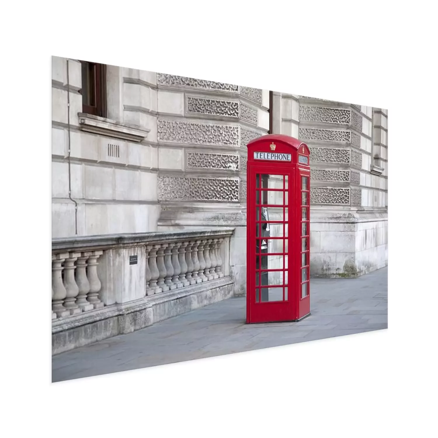 Poster: Londense telefooncel op de achtergrond van het gebouw