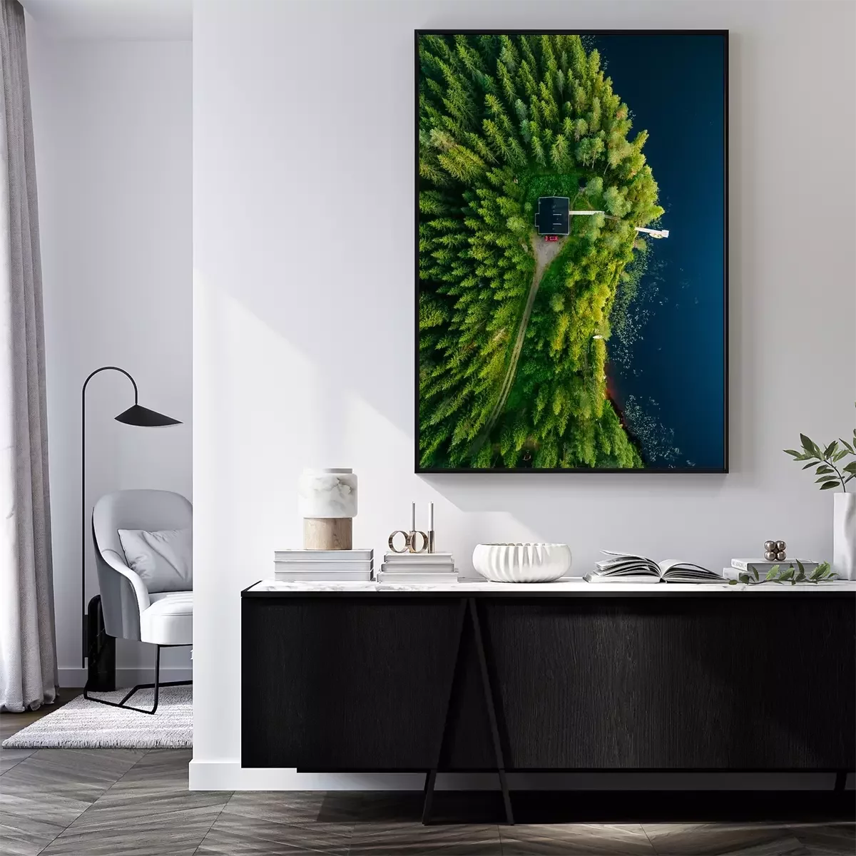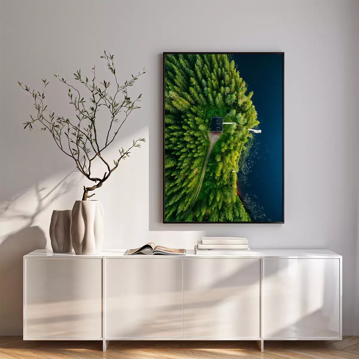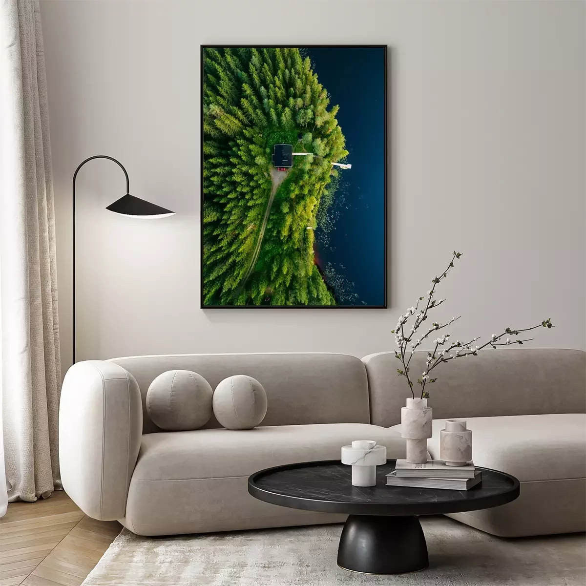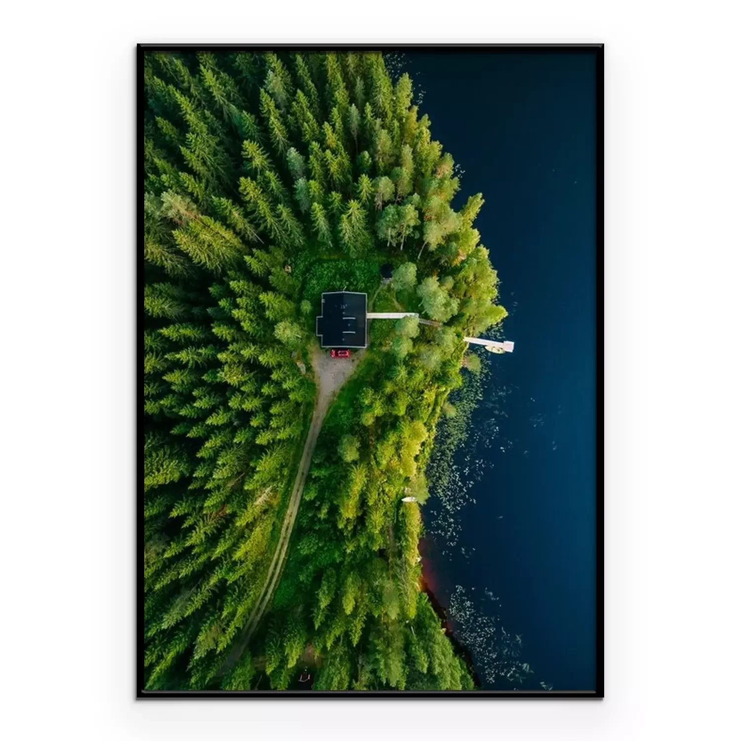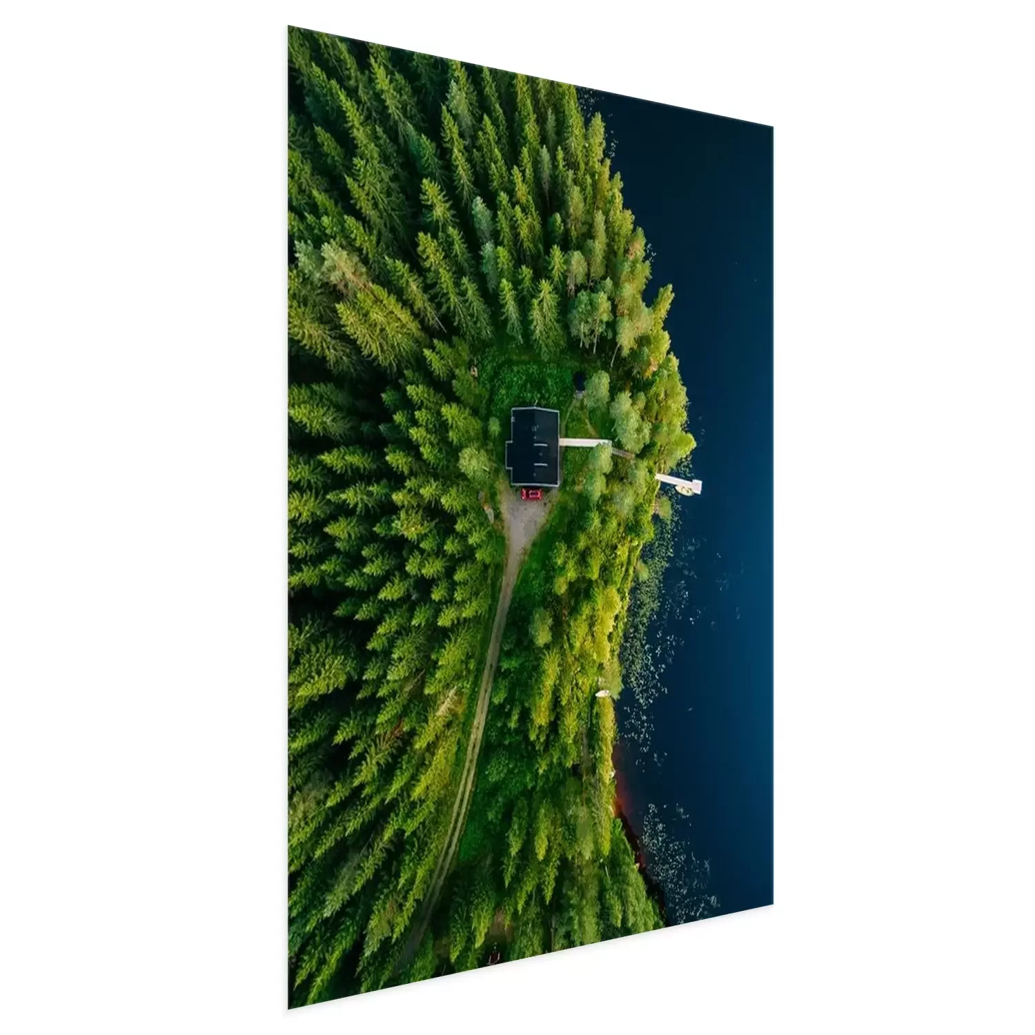 Poster: Luchtmening van houten plattelandshuisje in groen bos door het blauwe meer in de landelijke zomer Finland