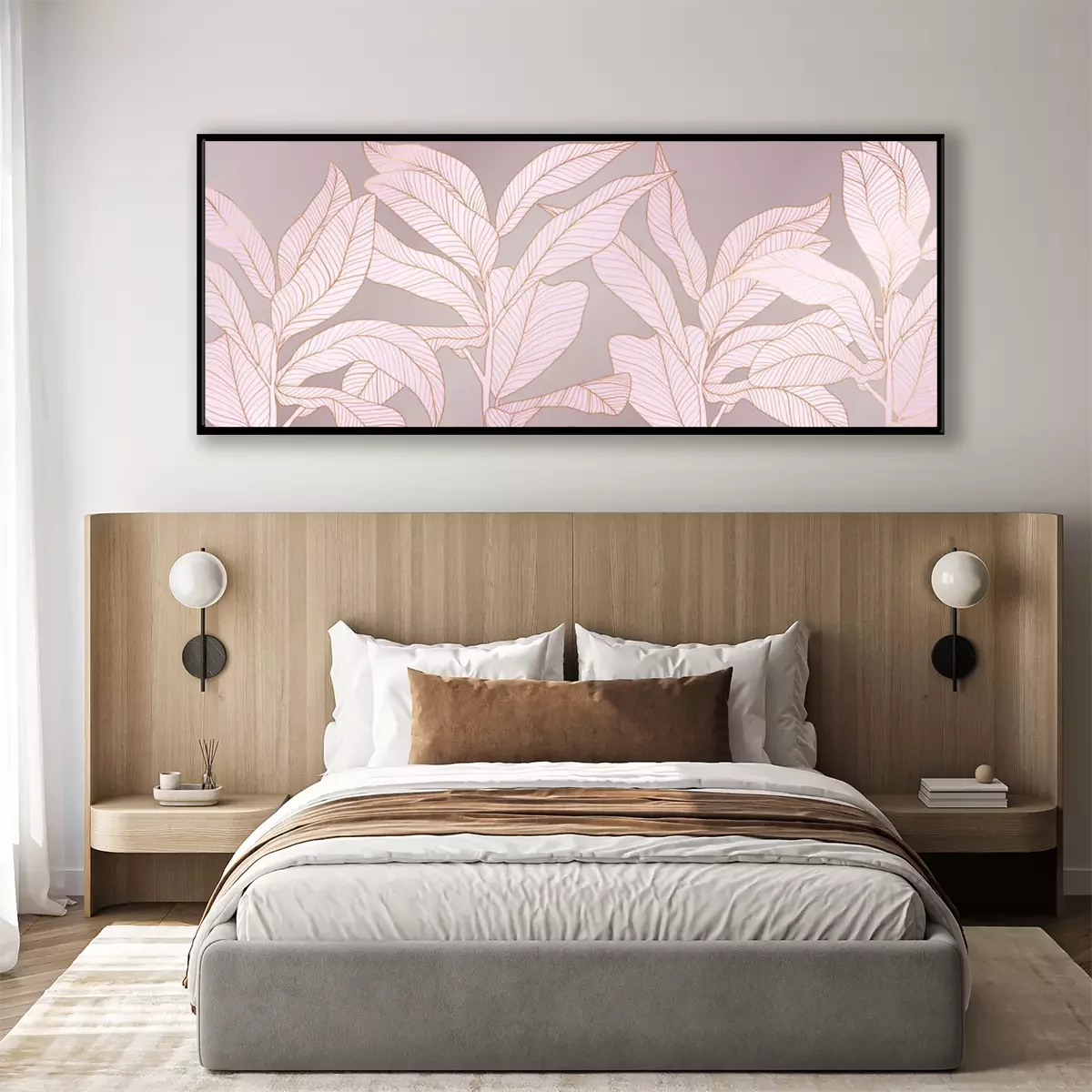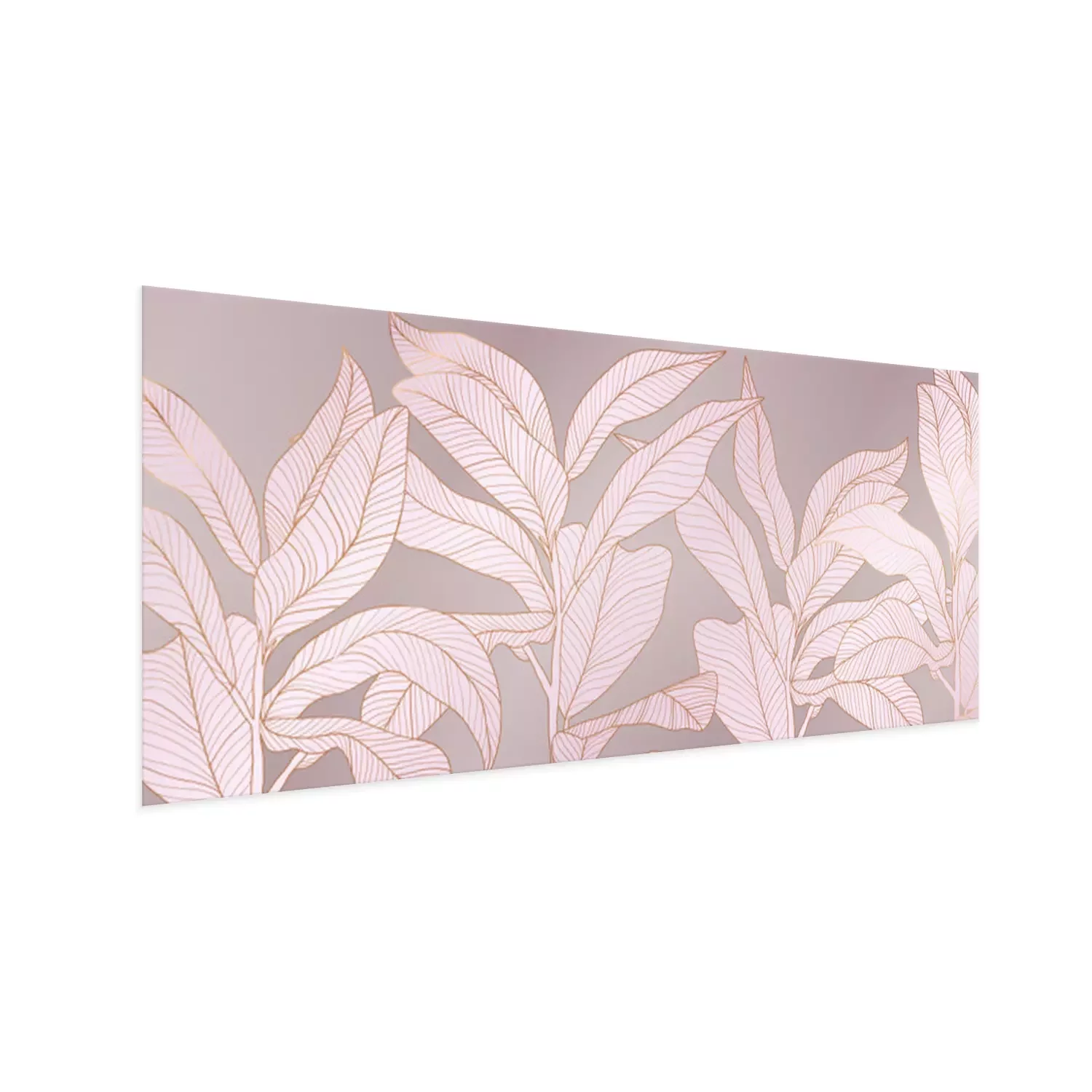 Poster: Luxury rose gold and pink floral background vector. Botanical leaves pattern. Golden Wallpaper design with tropical plant line arts, Vector illustration.