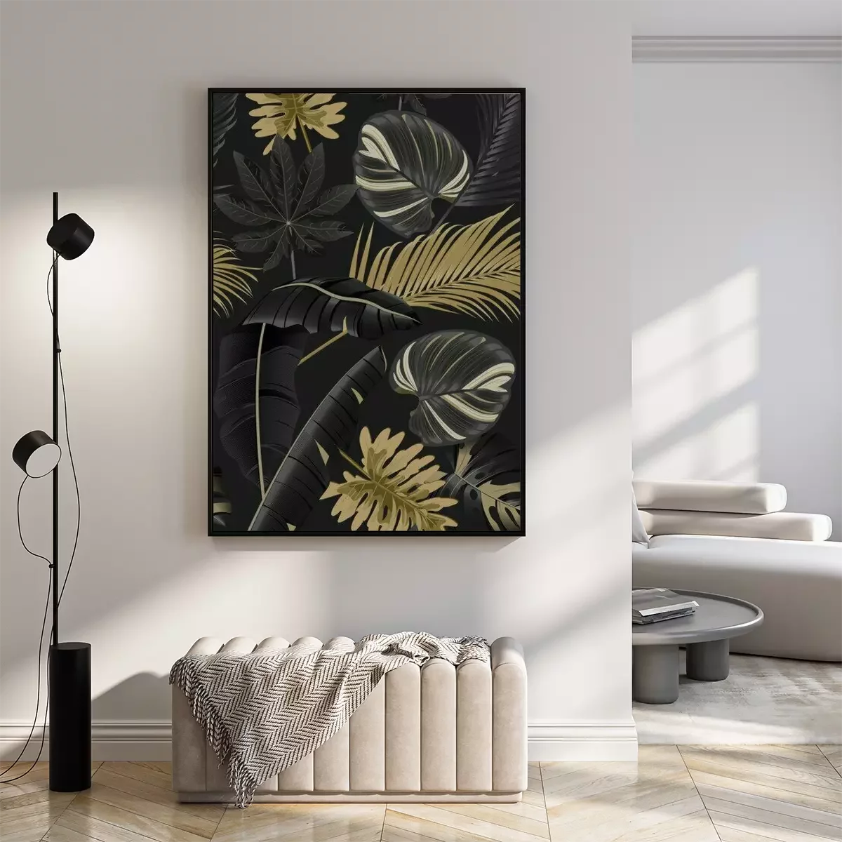 Poster: Luxury seamless pattern with tropical leaves on dark background