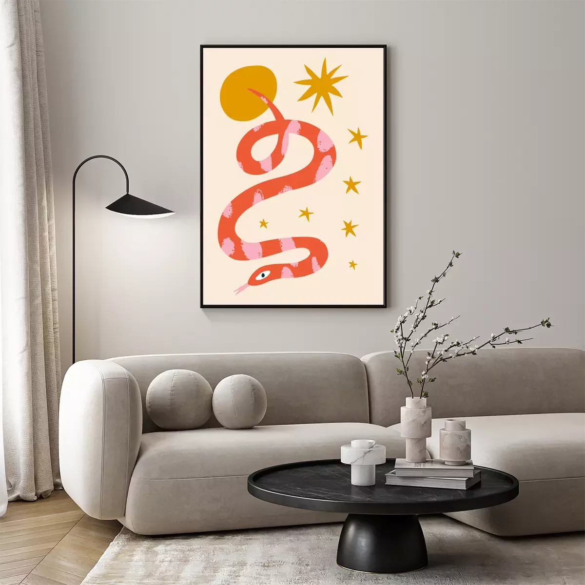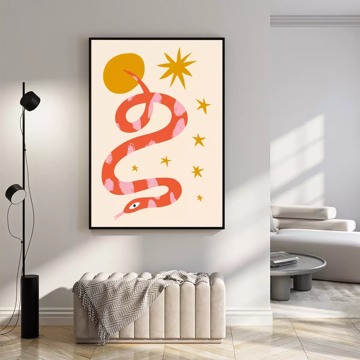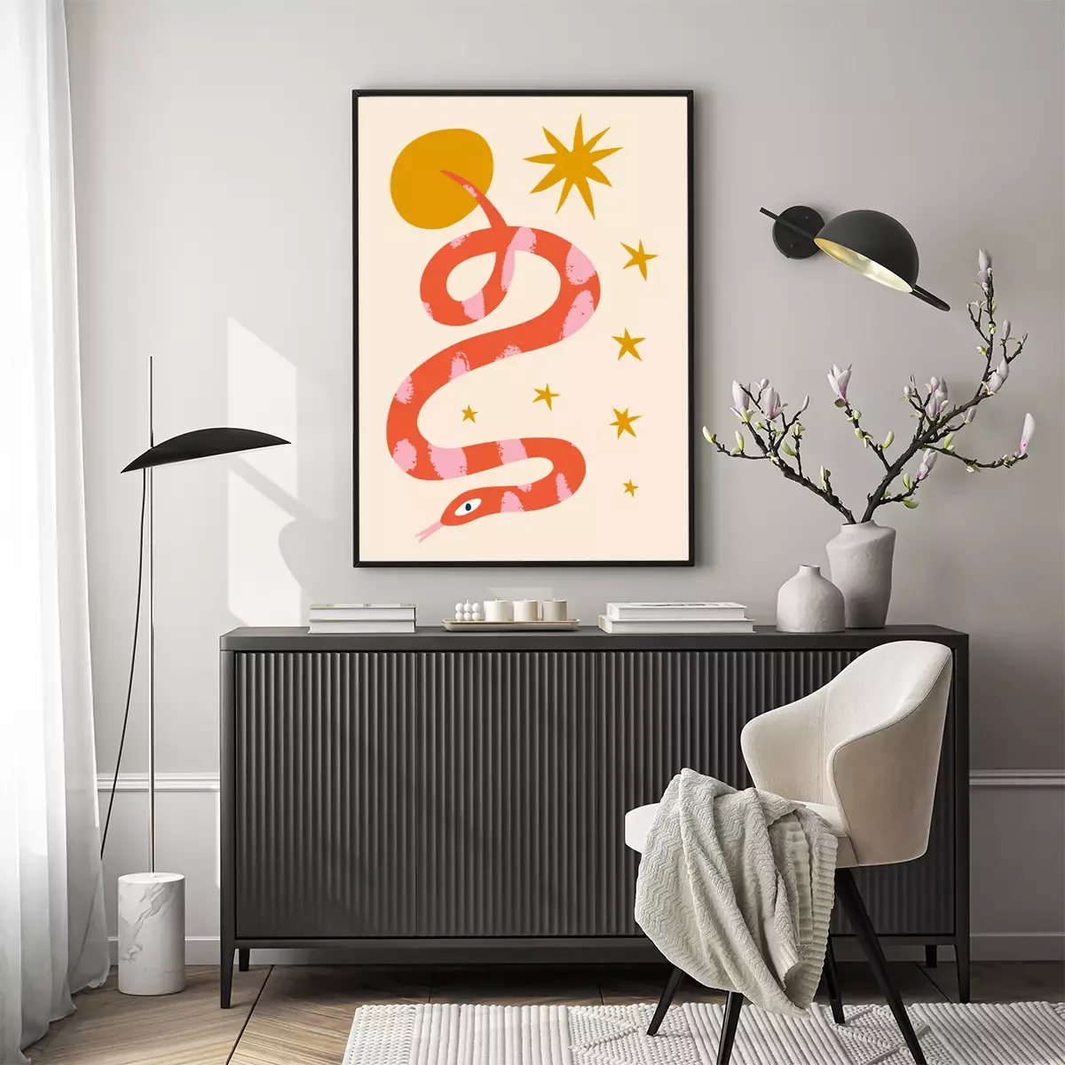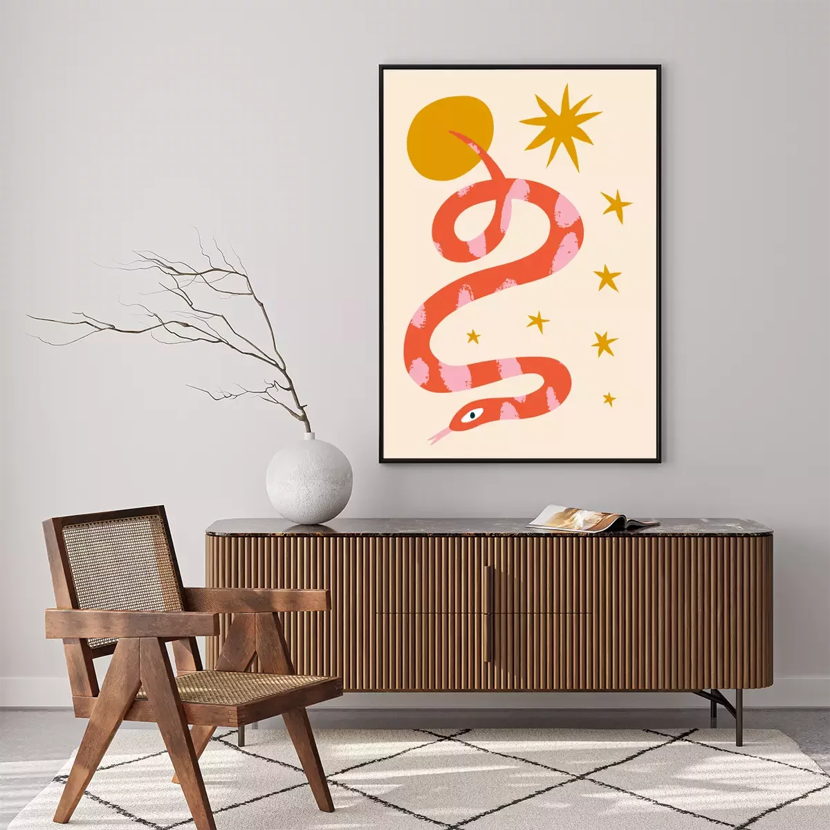 Boho hippie groovy tiger and snake abstraction minimalist modern wall art folk ethnic african animals print in trendy flat naive doodle style