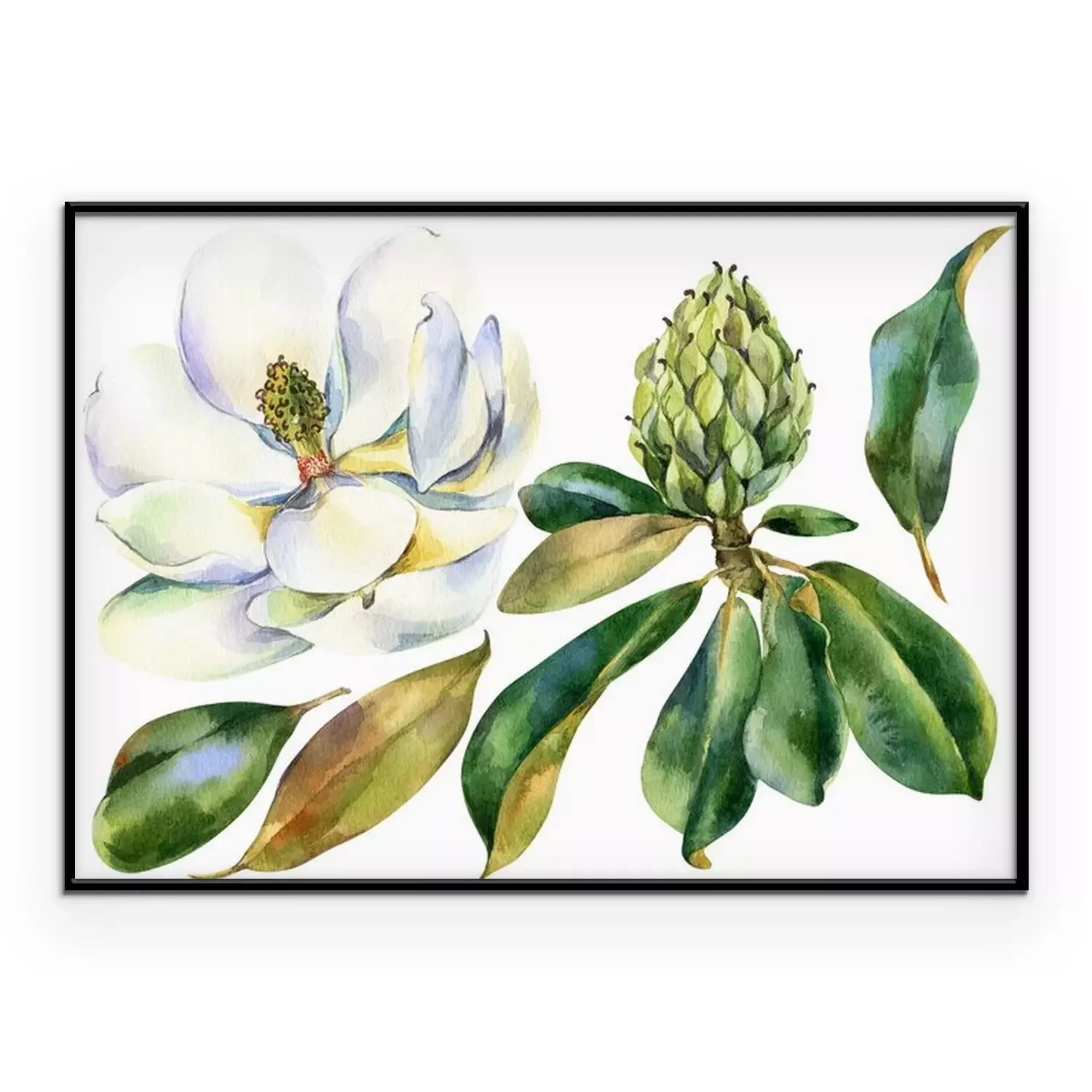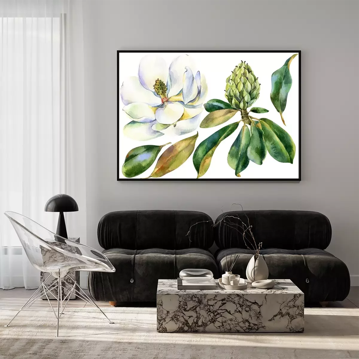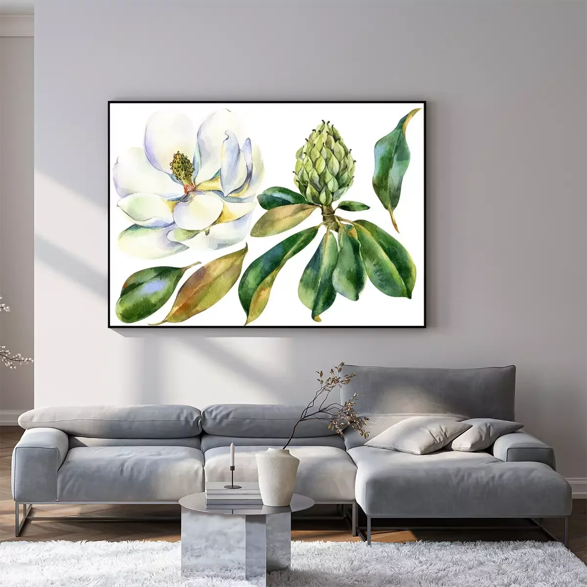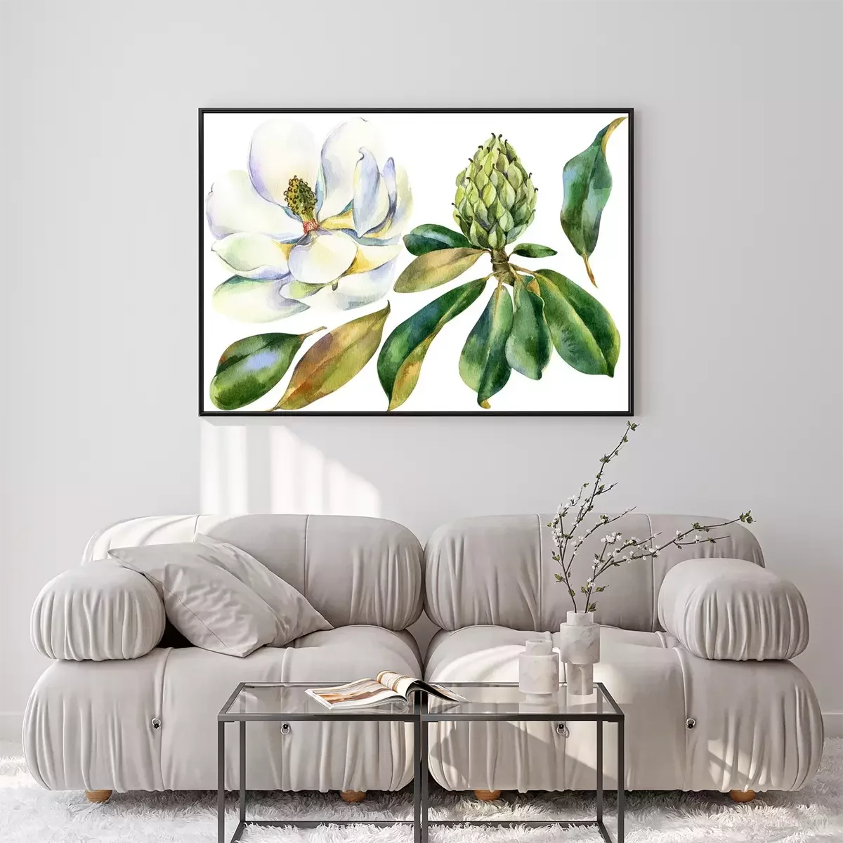 Watercolor seamless pattern with white magnolia, green leaves, botanical painting isolated on a white background, floral painting, stock illustration.