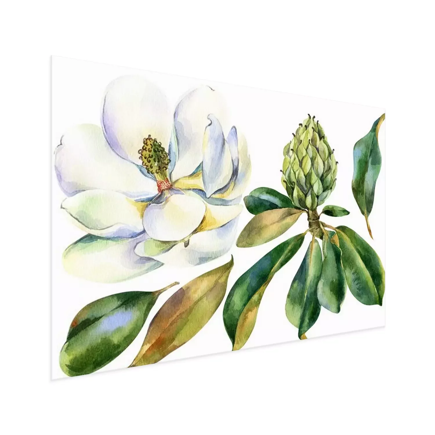 Watercolor seamless pattern with white magnolia, green leaves, botanical painting isolated on a white background, floral painting, stock illustration. Fabric wallpaper print texture.