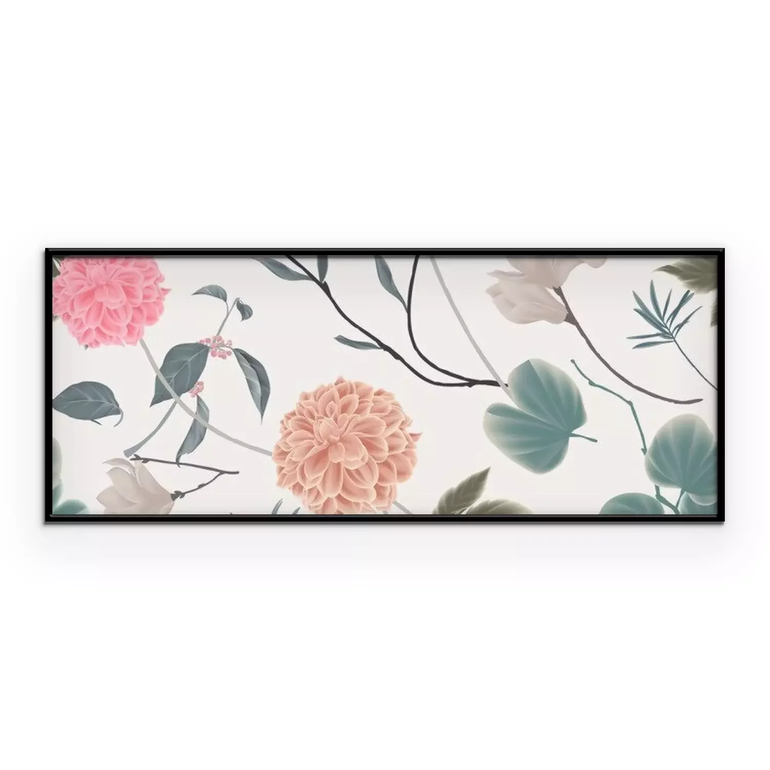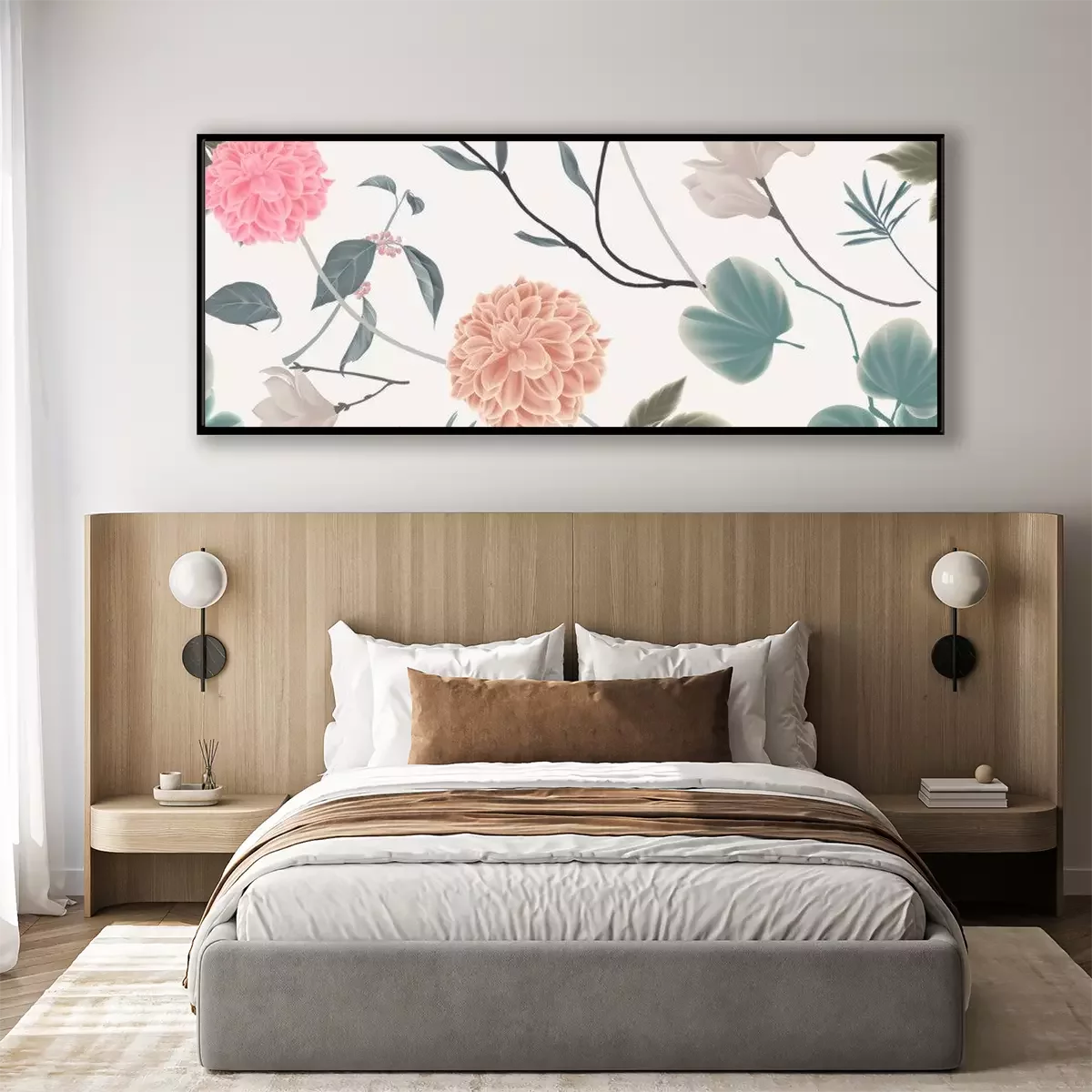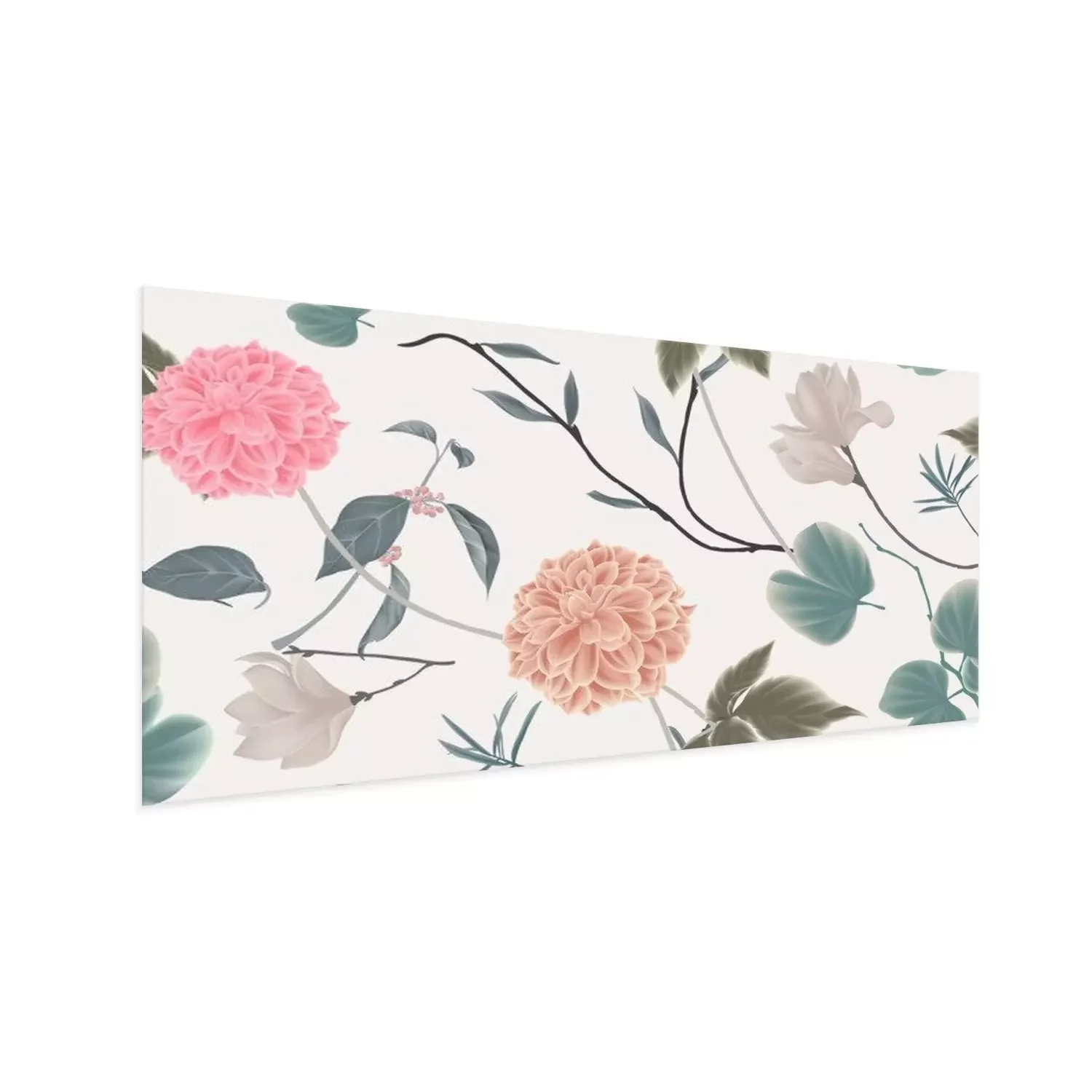 Poster: Magnolia's en dahlia's tussen verspreide bladeren