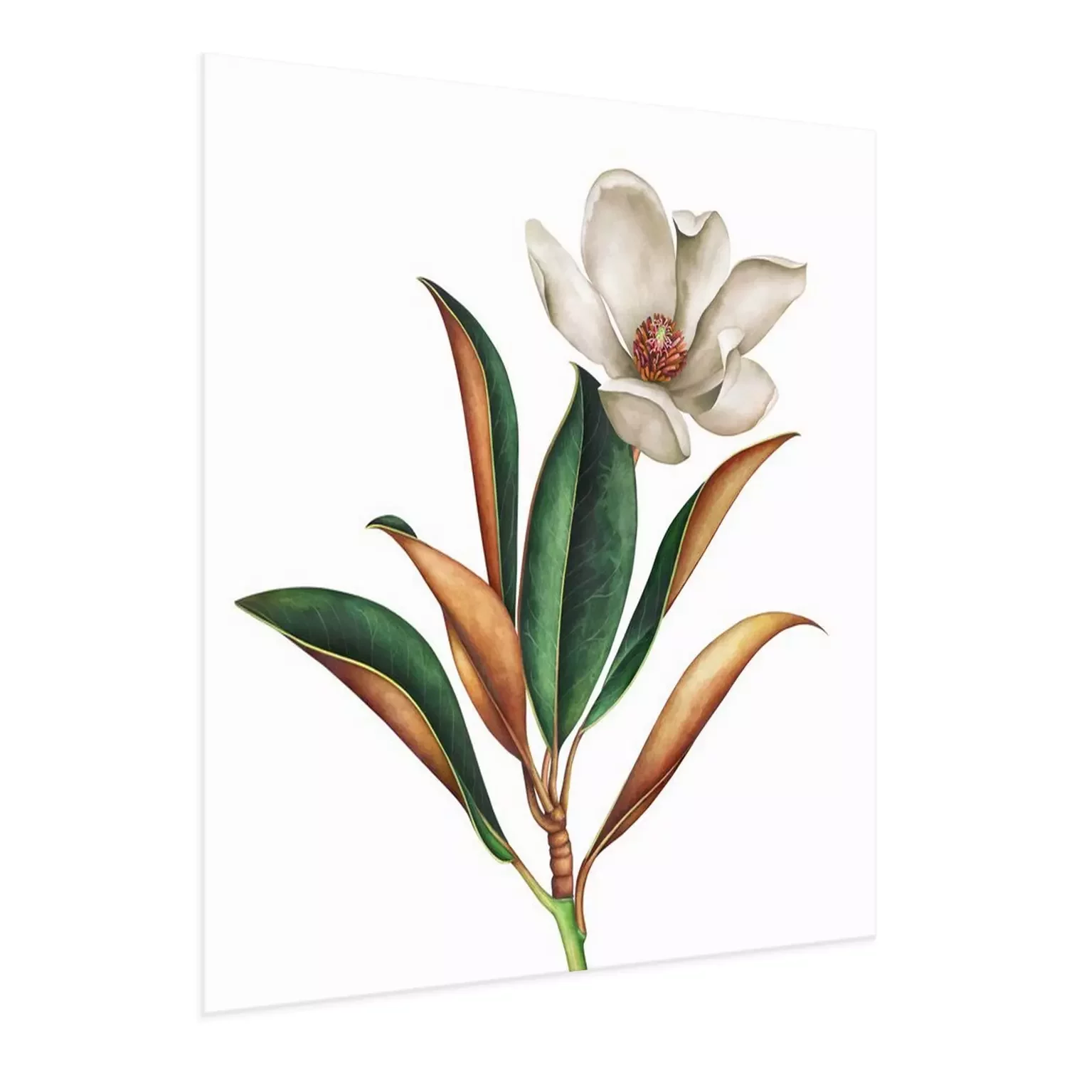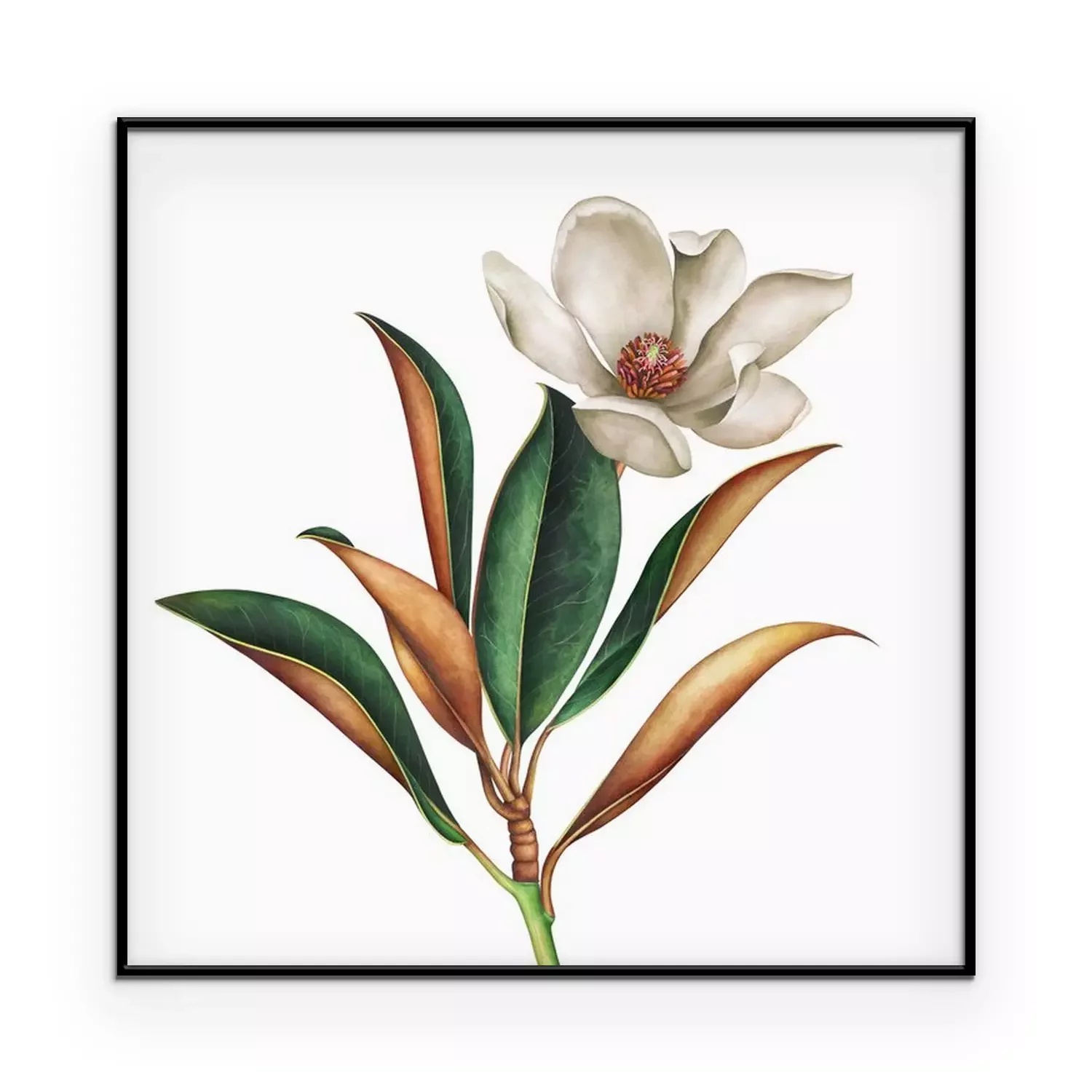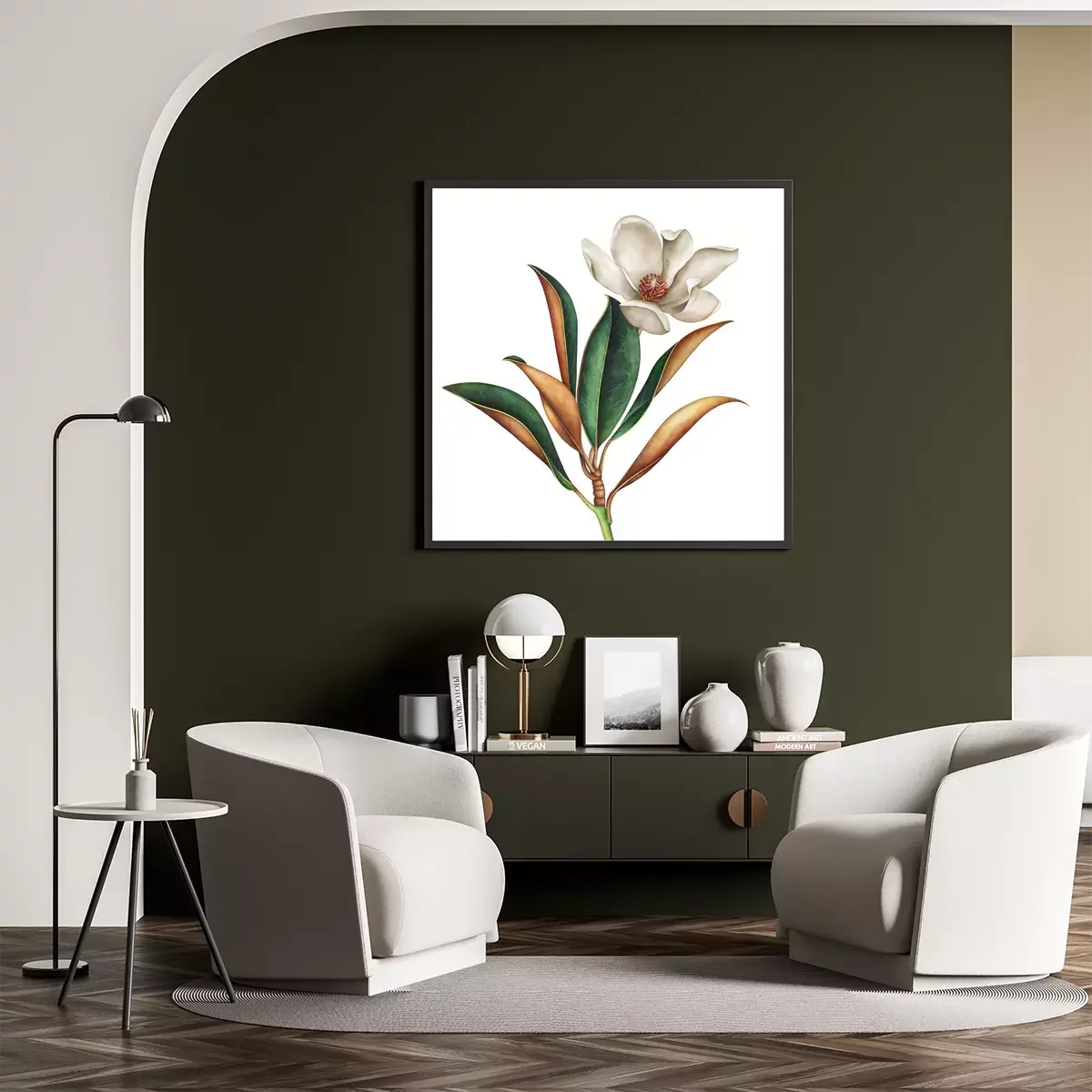 Poster: Magnoliabloem omgeven door groenbruine bladeren
